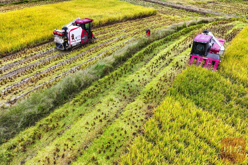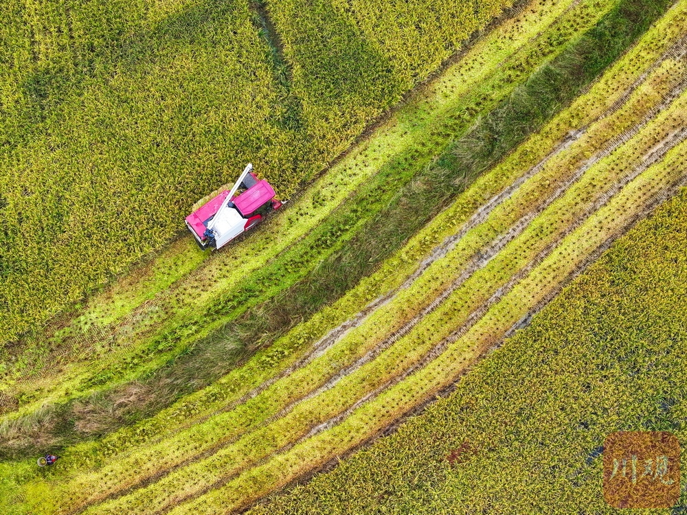 层层稻浪中,工作人员熟练地驾驶着收割机,开足马力来回穿梭,所到之处,一茬茬水稻变成低矮的秸秆,大粒饱满的稻谷则被装近路旁的卡车中,准备运送入仓。