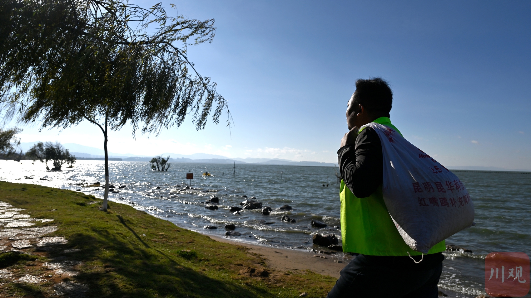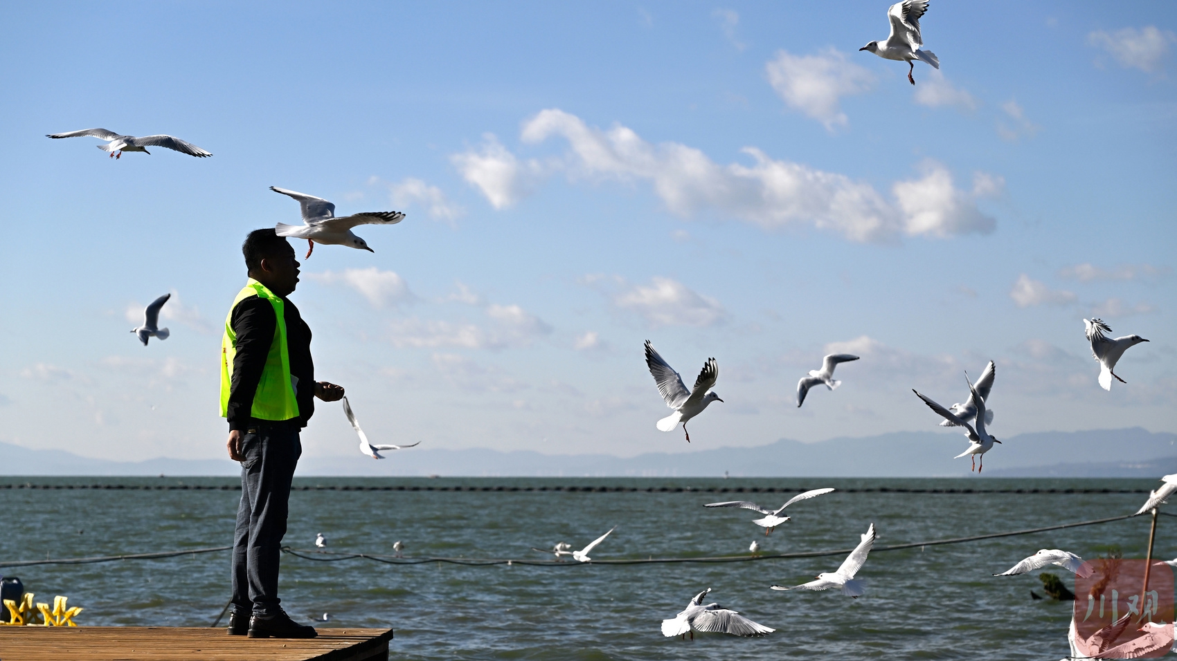 王官社区志愿者张利云在滇池边投喂红嘴鸥。