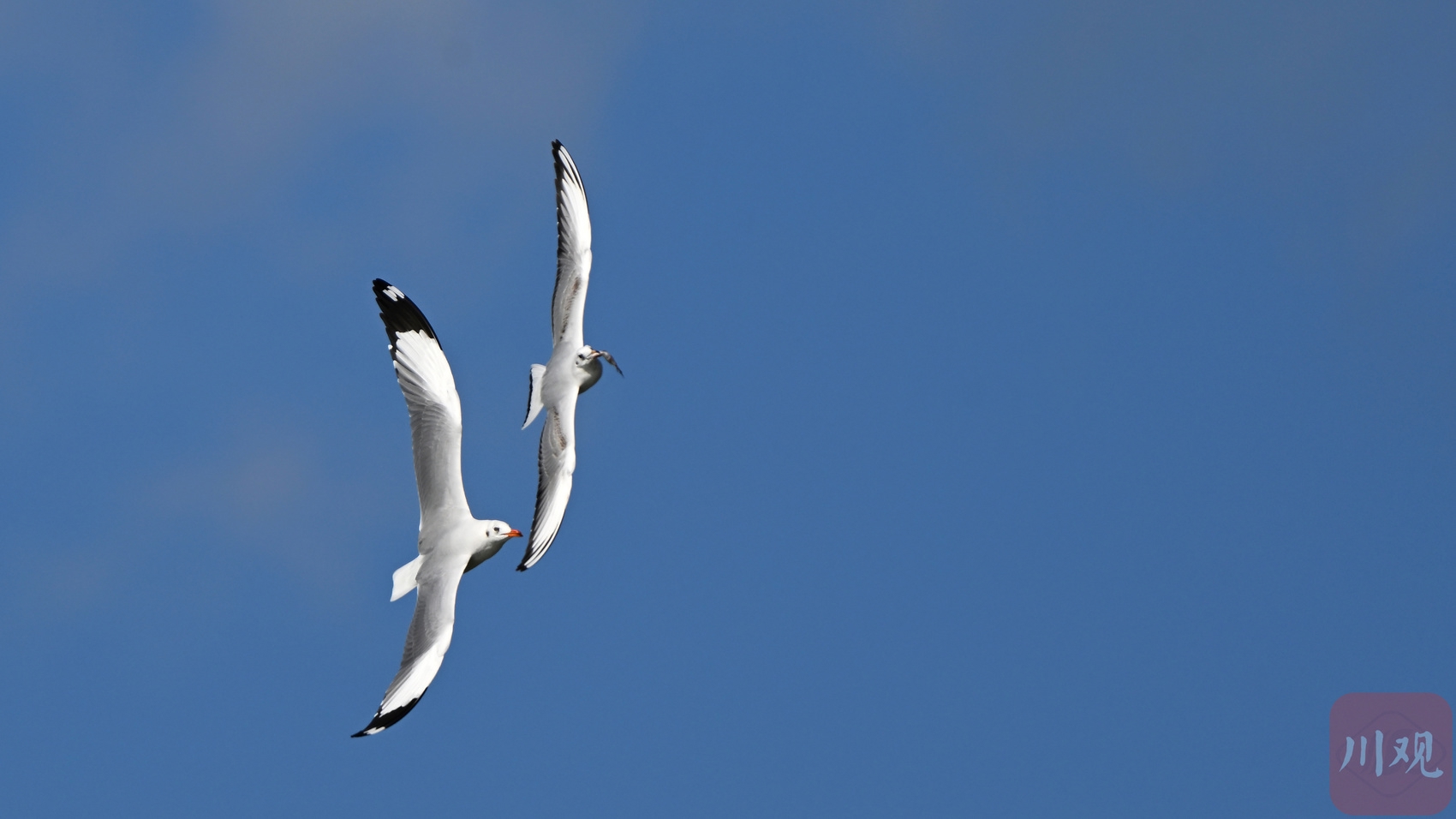 王官湿地公园上空,两只红嘴鸥在追逐嬉戏。