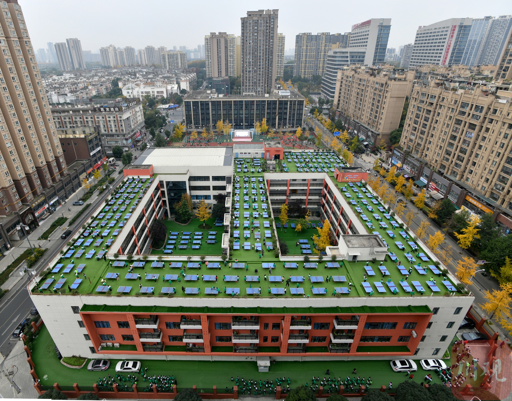 俯瞰电子科技大学附属实验小学华泰校区的楼顶乒乓球运动场。