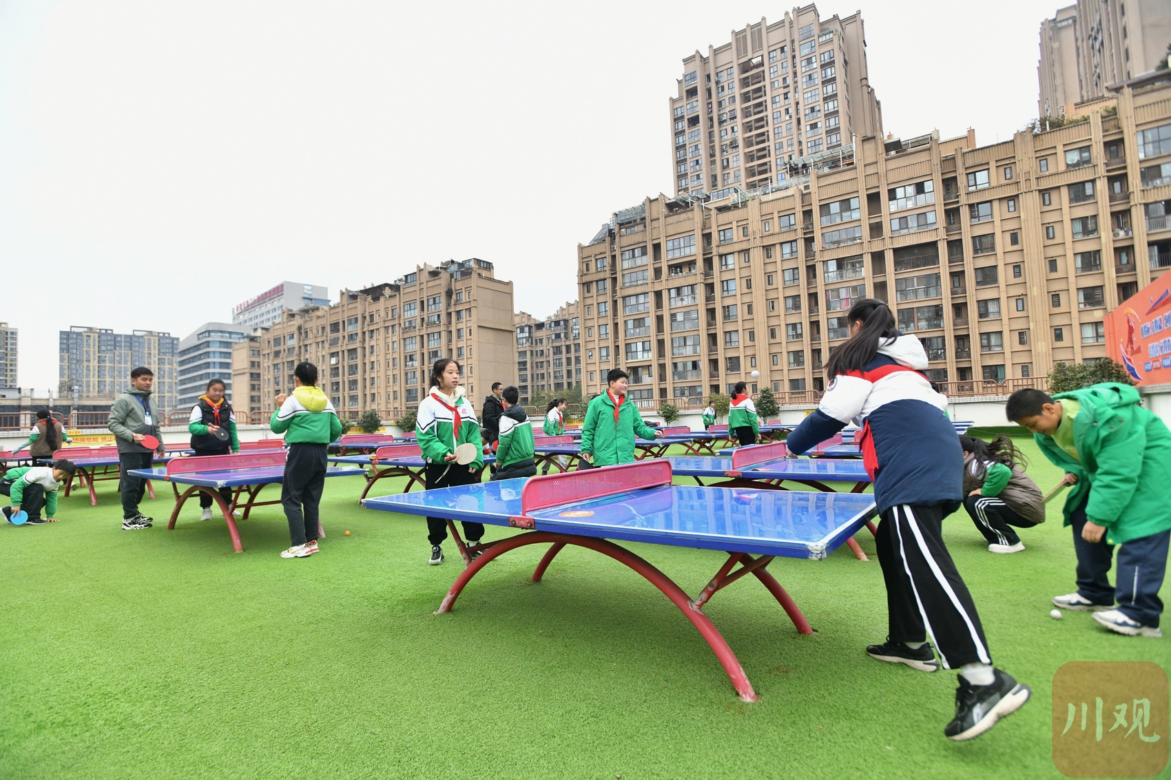 电子科技大学附属实验小学华泰校区的学生在楼顶乒乓球运动场打乒乓球。