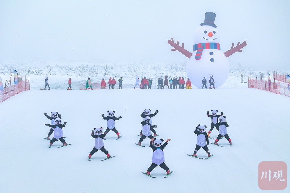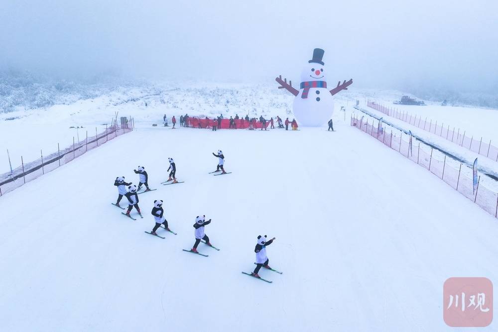滑雪场内,“熊猫”滑雪者身着黑白萌装,挥舞着手臂,从坡顶飞驰而下,展现着滑雪的速度与激情。彩烟滑行、动物秀等系列表演,更将欢乐氛围推向了高潮。