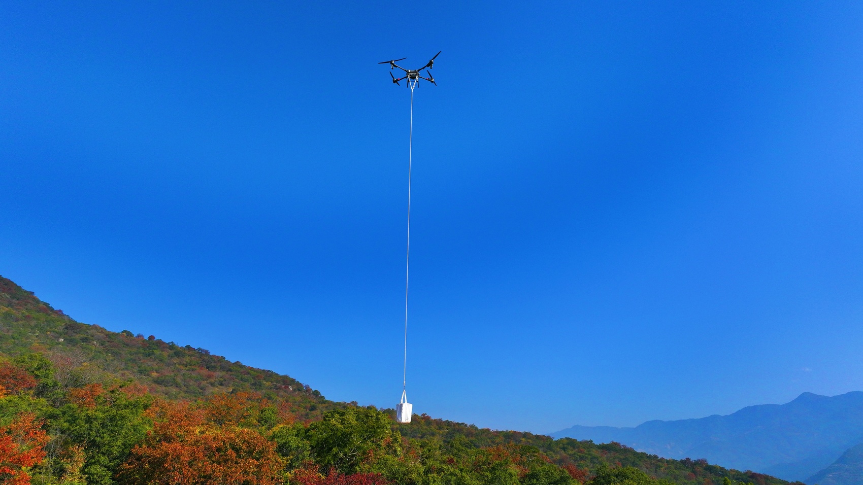 该项目位于四川攀枝花苏铁国家级自然保护区实验区内,施工区域坡度较大,遍布草本植物和灌木,还有明显的岩石裸露。“山地地形的施工限制较大,大型机械进不来,使用骡马对植物保护存在隐患,采用人工效率较低,为此我们采用无人机施工,既能保护环境又能提高效率。”攀枝花市西区林业局局长李仁兵告诉记者,无人机将在15天内完成约500吨的建材运输,运输费用较人工运输低50%,较骡马运输低26%。