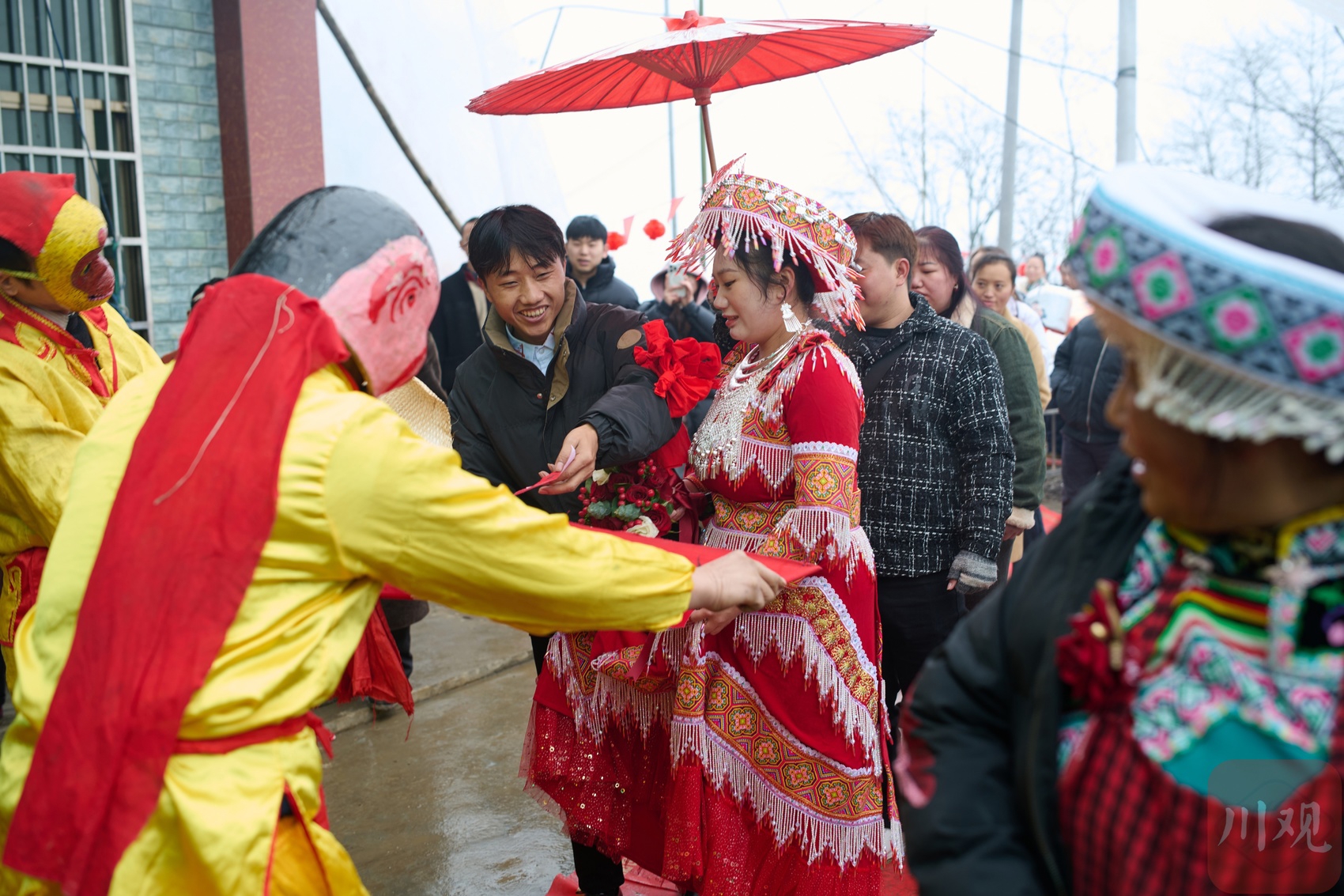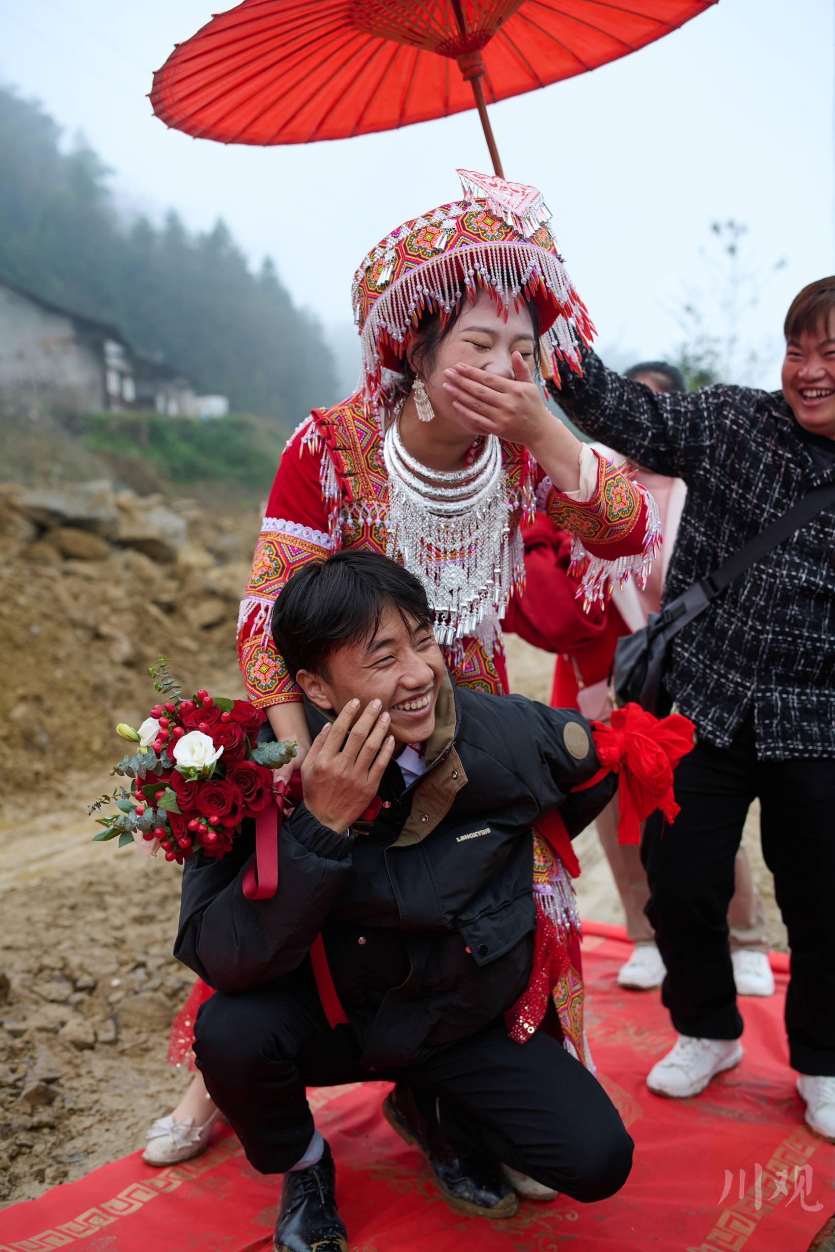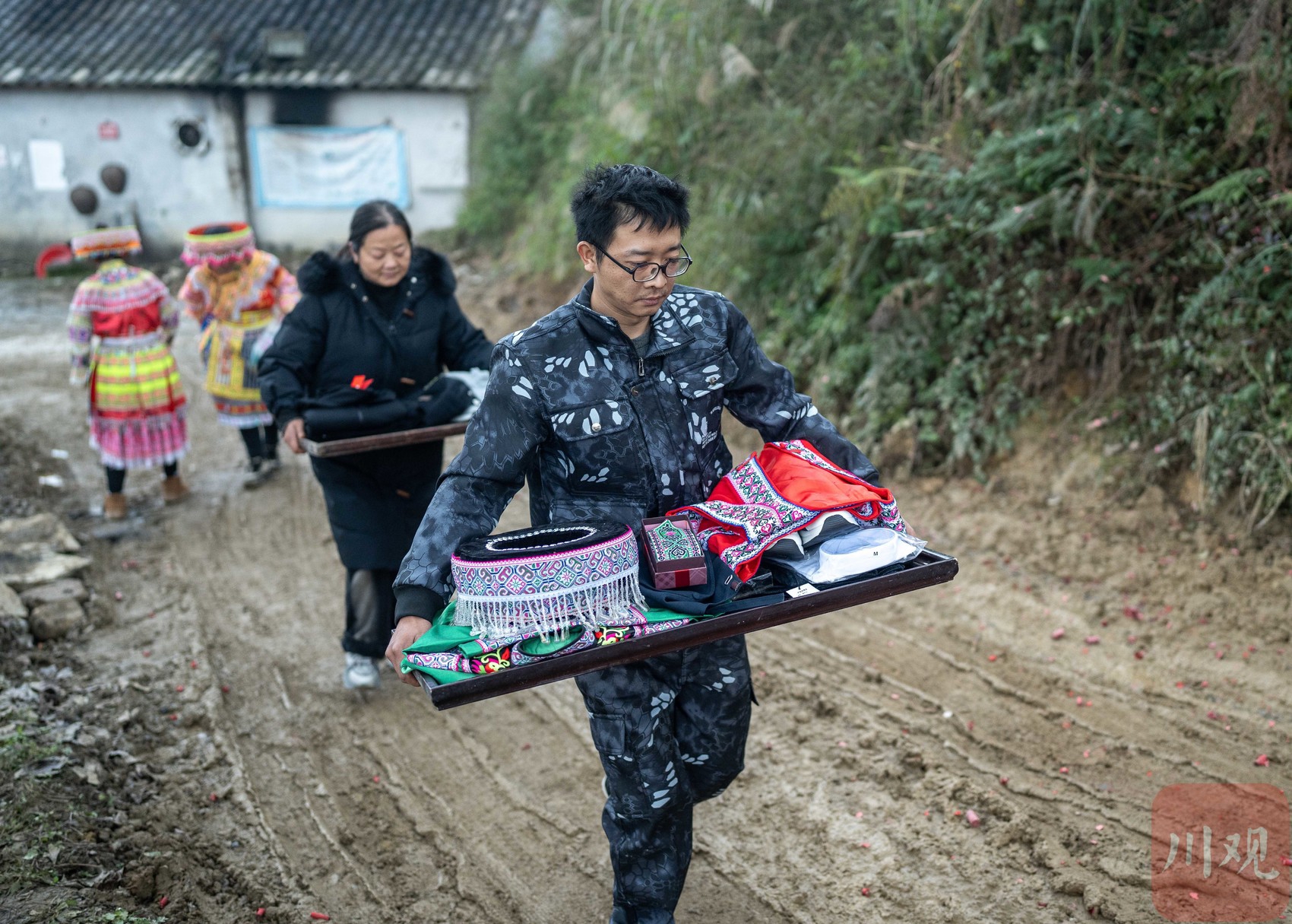 拜富贵、吃富贵酒,穿新、上红、送礼……12月28日,宜宾市兴文县大坝苗族乡龙塘村,一场热闹的传统川南苗族婚礼在这里举行。新郎黄奎和新娘王正琴都是“00后”,他们在广东打工相识相爱,在今年办理了登记结婚。