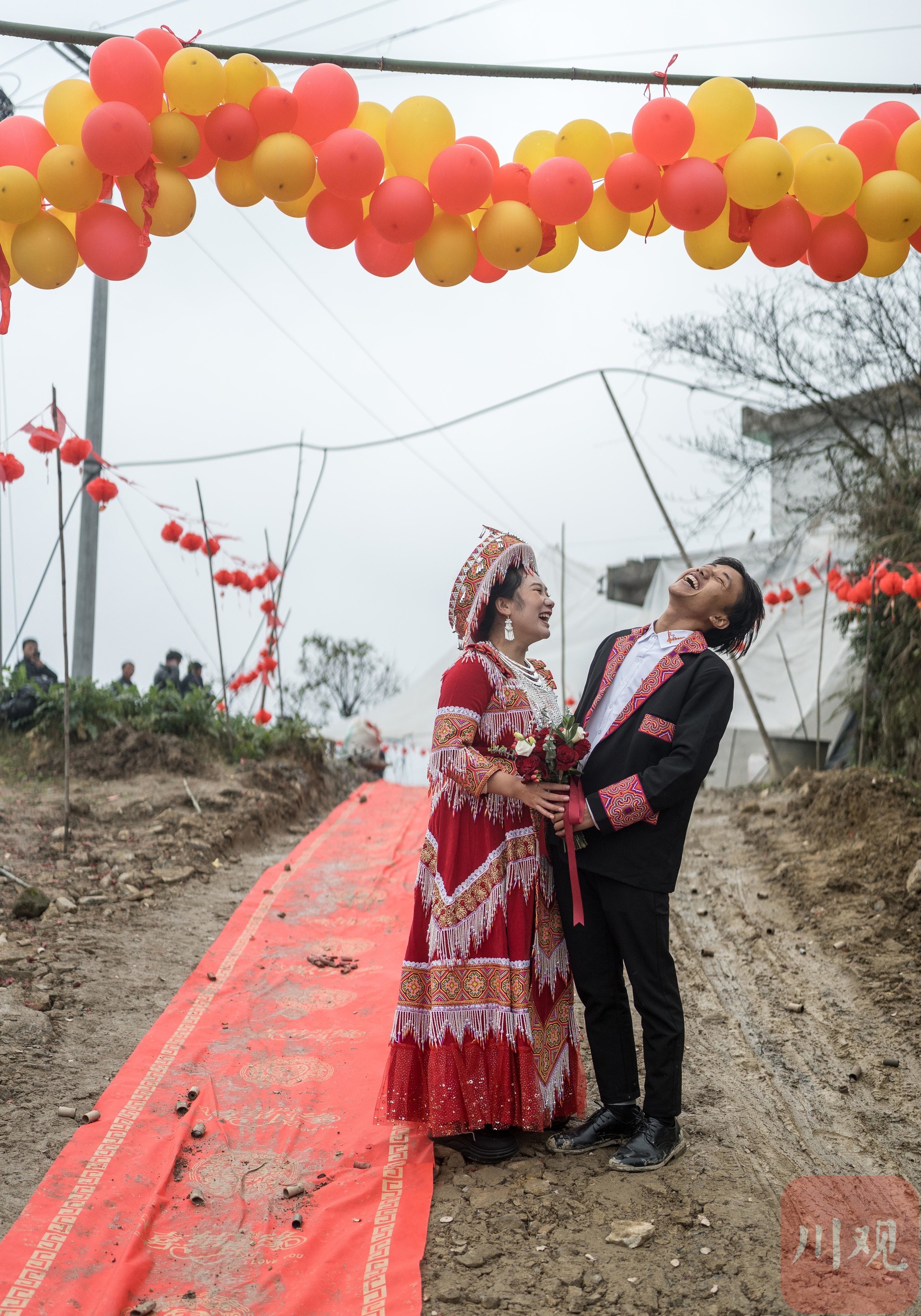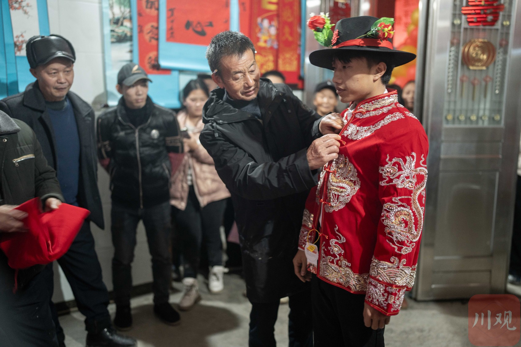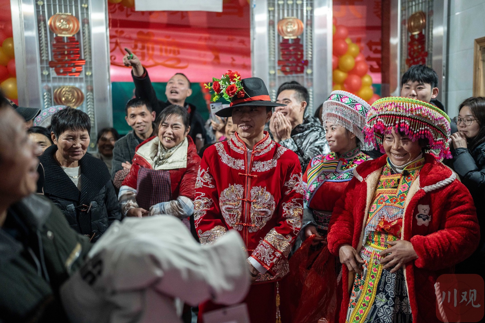 拜富贵、吃富贵酒,穿新、上红、送礼……12月28日,宜宾市兴文县大坝苗族乡龙塘村,一场热闹的传统川南苗族婚礼在这里举行。新郎黄奎和新娘王正琴都是“00后”,他们在广东打工相识相爱,在今年办理了登记结婚。