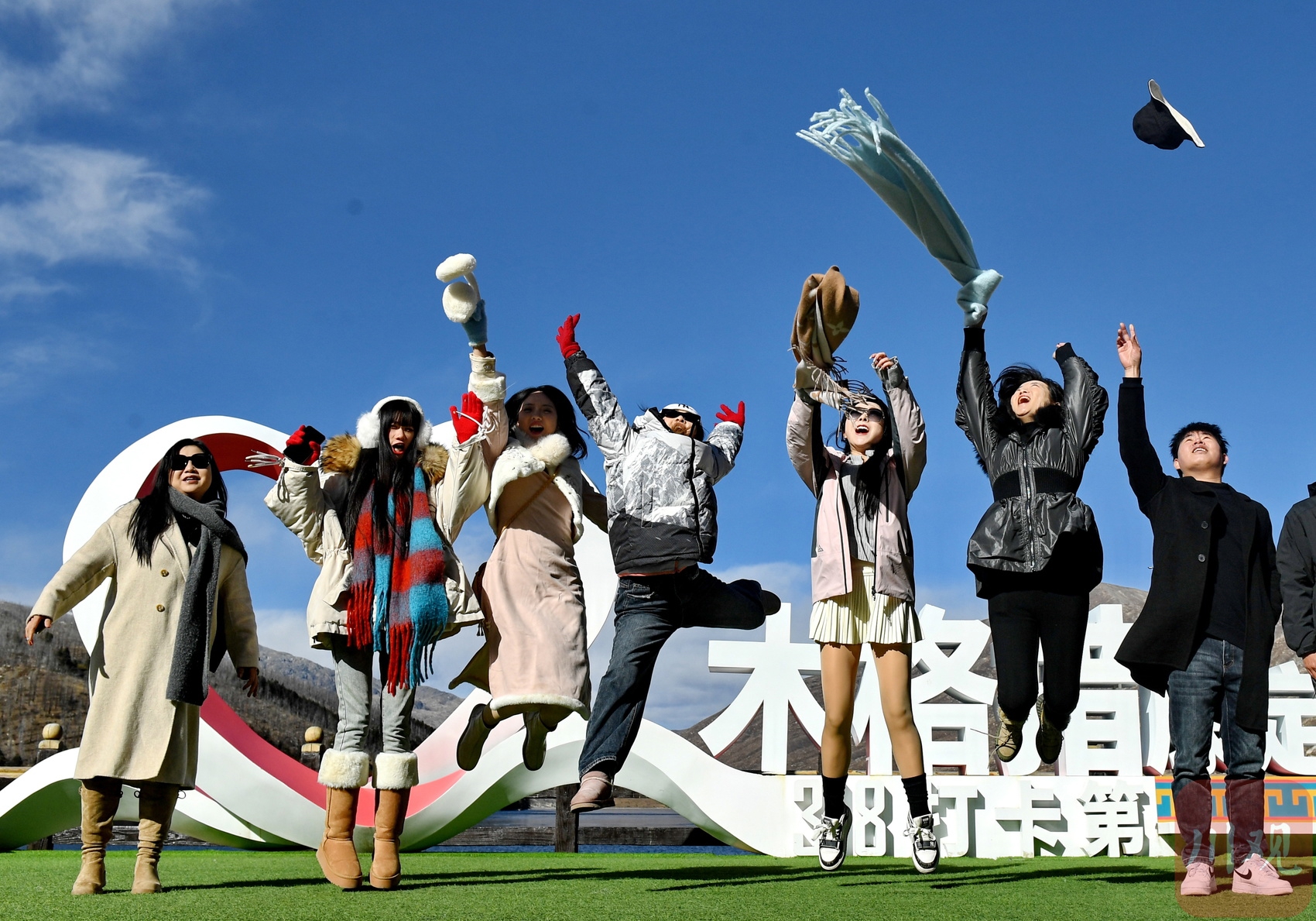 2025年1月2日,游客在四川省甘孜州康定市木格错景区欣赏大美风光拍照留念。