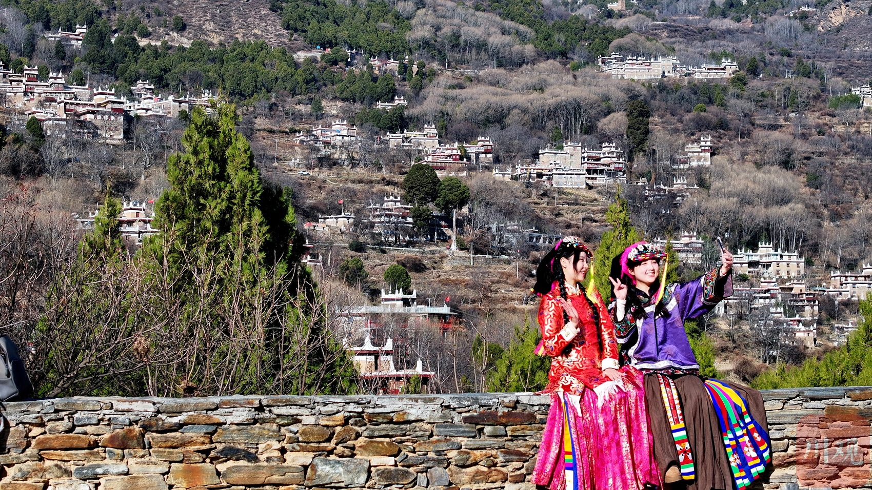 21月3日,甘孜州丹巴县甲居藏寨,两名游客穿着藏族服饰拍摄留念。