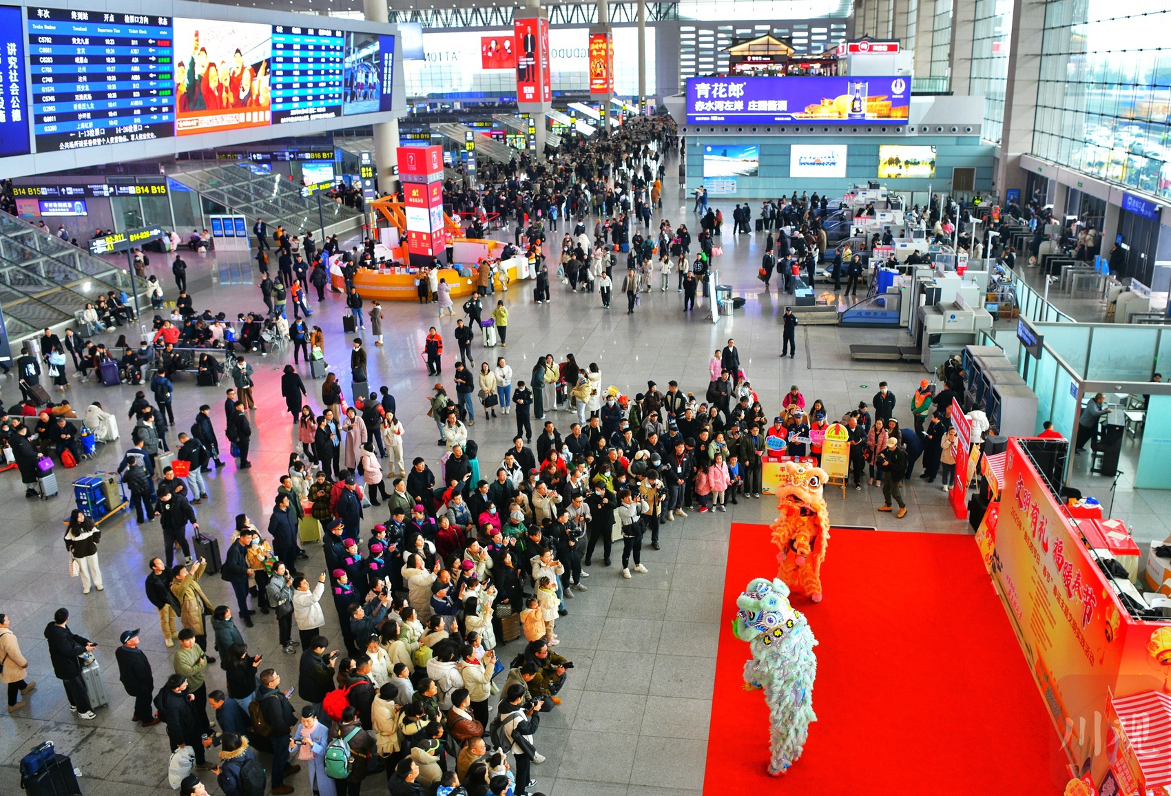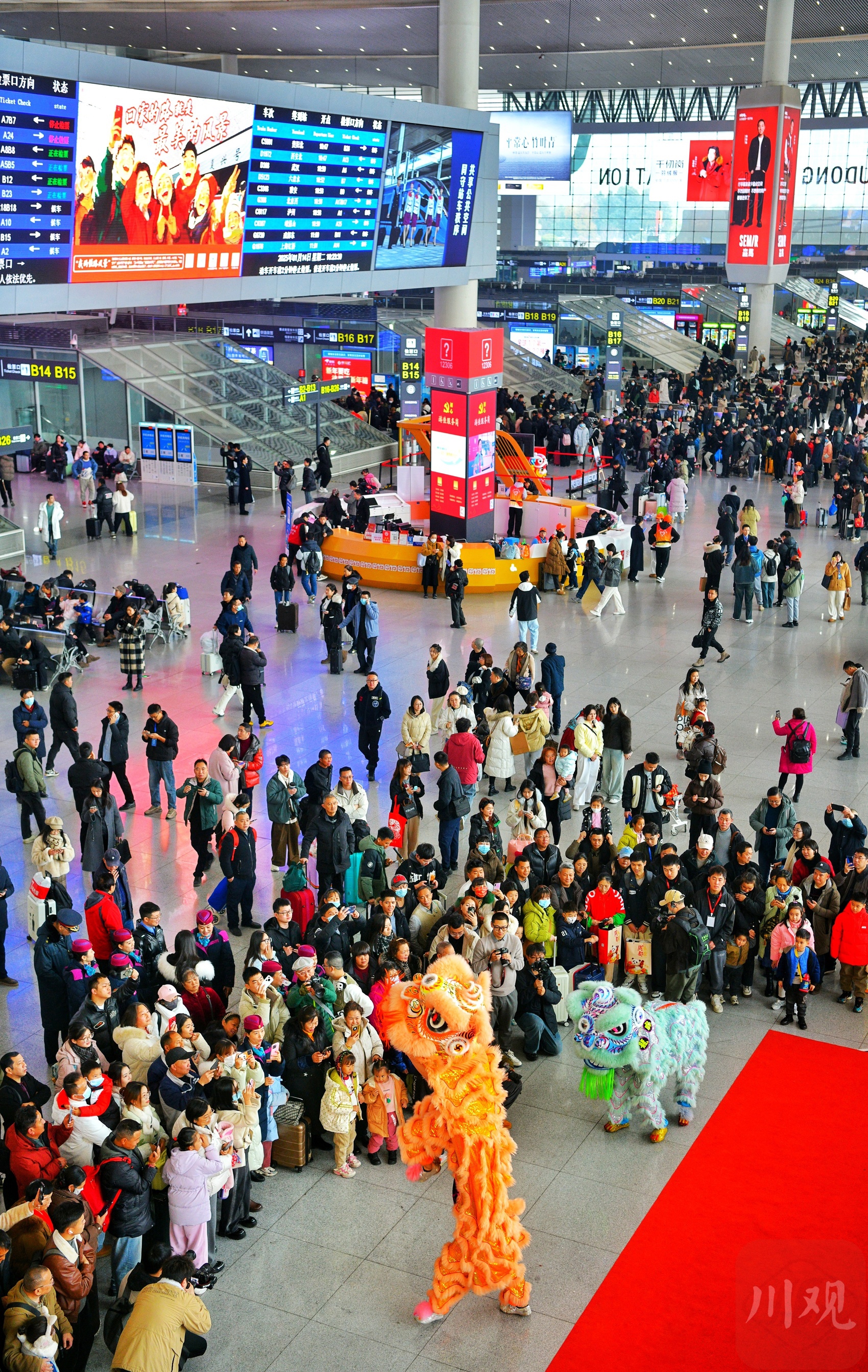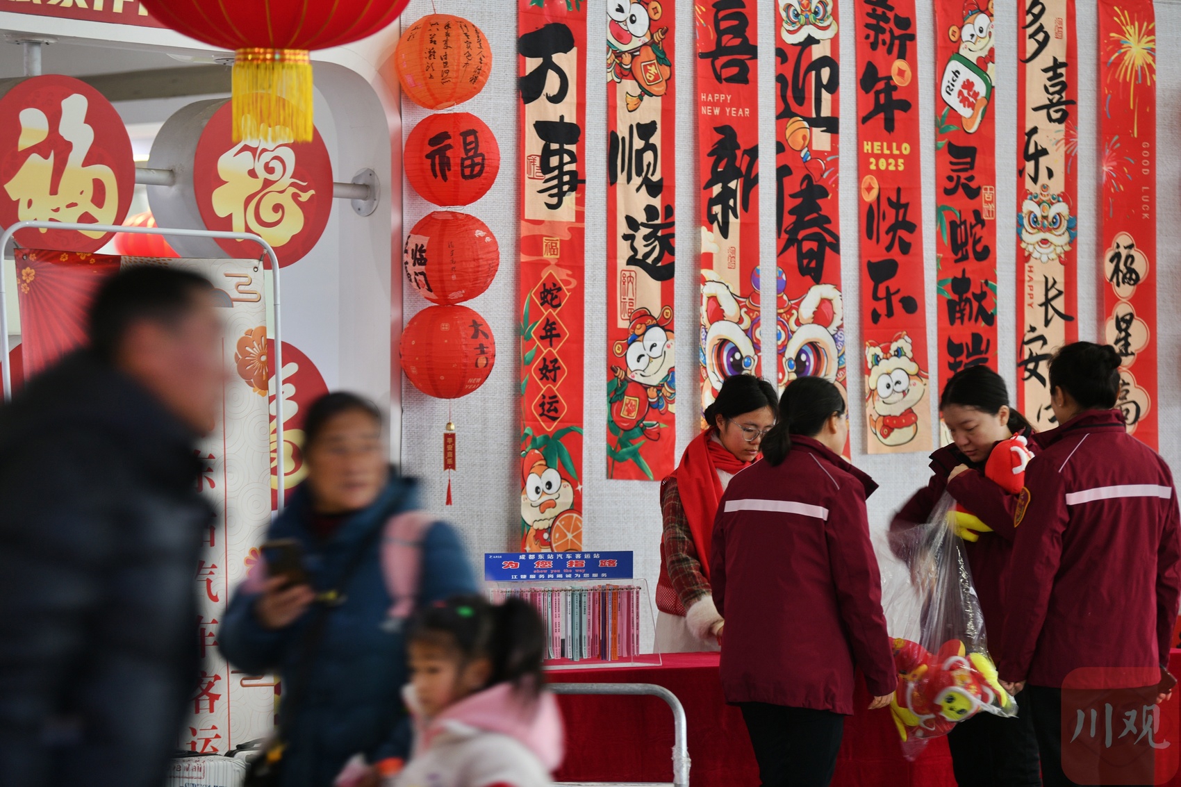 成都东站候车大厅欢乐祥和的新年氛围已经拉满,写春联、剪窗花、舞狮“送万福进万家”等民俗活动正在举办。“太好了!这是我让老师写的春联,拿回去就挂大门口,喜庆!”山东旅客吴先生高兴地举起手中的春联对记者说。