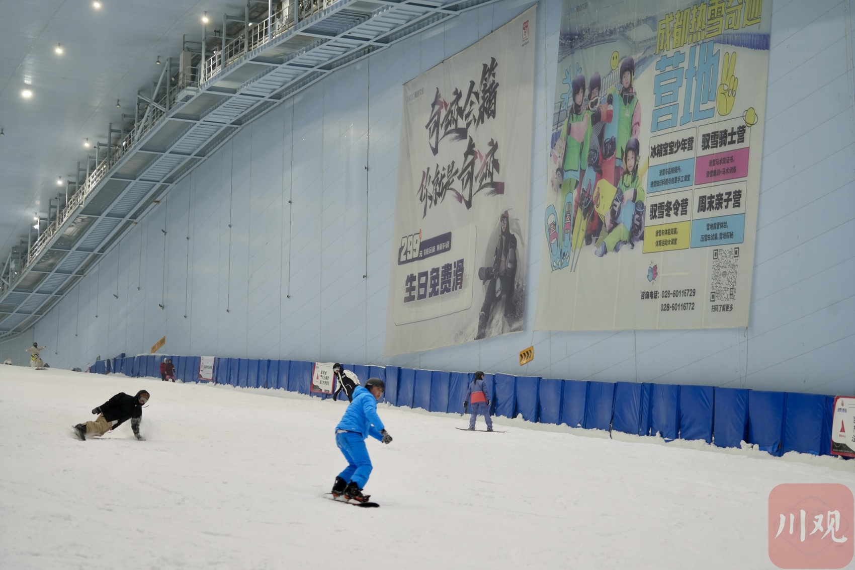 让陈月流连忘返的这个滑雪场是位于都江堰市的成都热雪奇迹。这里是西南体量最大的四季恒温室内滑雪场,总建筑面积约8.08万平方米,室温常年保持零下6℃,有6条不同等级的滑雪道、2个滑雪地形公园和1个气垫公园,雪道总长度1300米,最大落差60米,最大坡度21°,全天可接待8000人次滑雪。