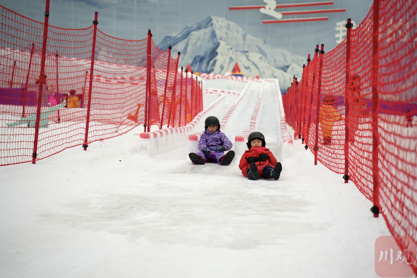 成都热雪奇迹,小朋友体验冰雪滑梯。