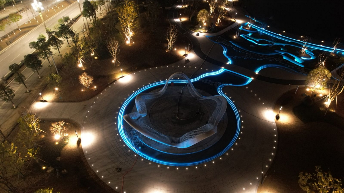 此外,整个公园还配有环湖灯带、雾森等声光设施,流光溢彩,科技感十足,通过复合型、全龄化、互动感的场景营造,打造成一种“山、水、人、科技”融合的独特人文景致。