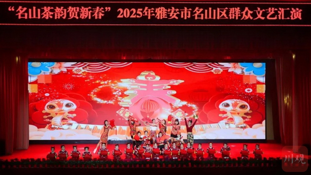 2025年雅安市名山区群众文艺汇演以“名山茶韵贺新春”为主题。演出在开场舞《盛世欢歌》里拉开帷幕,舞蹈《侠影诗韵映茶乡》、独唱《如愿》、杂技《步步登高》、茶歌联唱《蒙顶山上茶好香》、街舞《三雅》等不同艺术形式的节目轮番上演,释放出浓浓的年味。