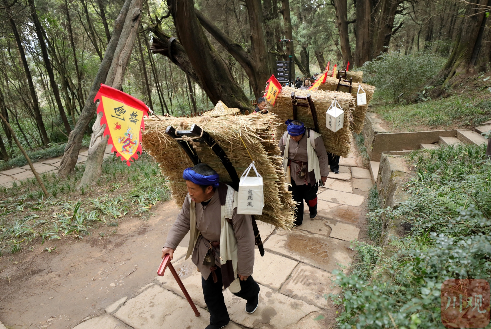 “快点走哦!”“嗨走!嗨走!”“莫息肩哦!”“嗨走!嗨走!”……古蜀道石板路上,走在镖队前面“眼观六路,耳听八方”的镖师手拿关公刀,边走边喊着号子,或背或抬着货物的镖师,迈着沉重的脚步,缓缓前行……