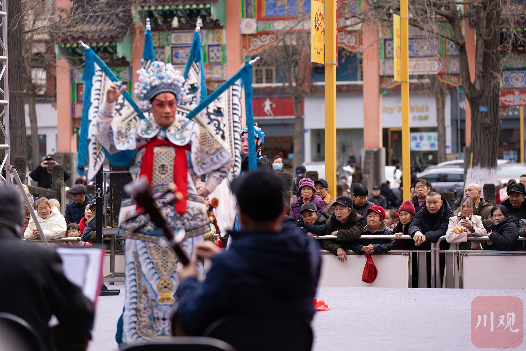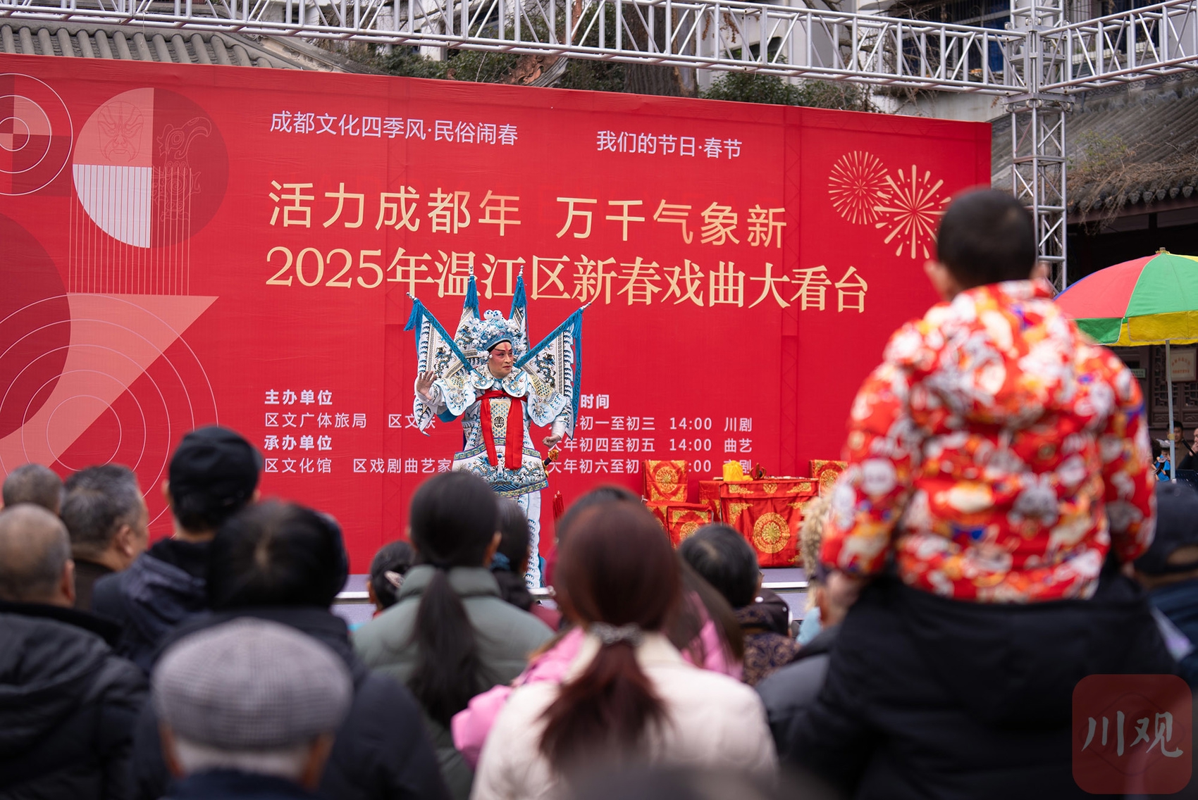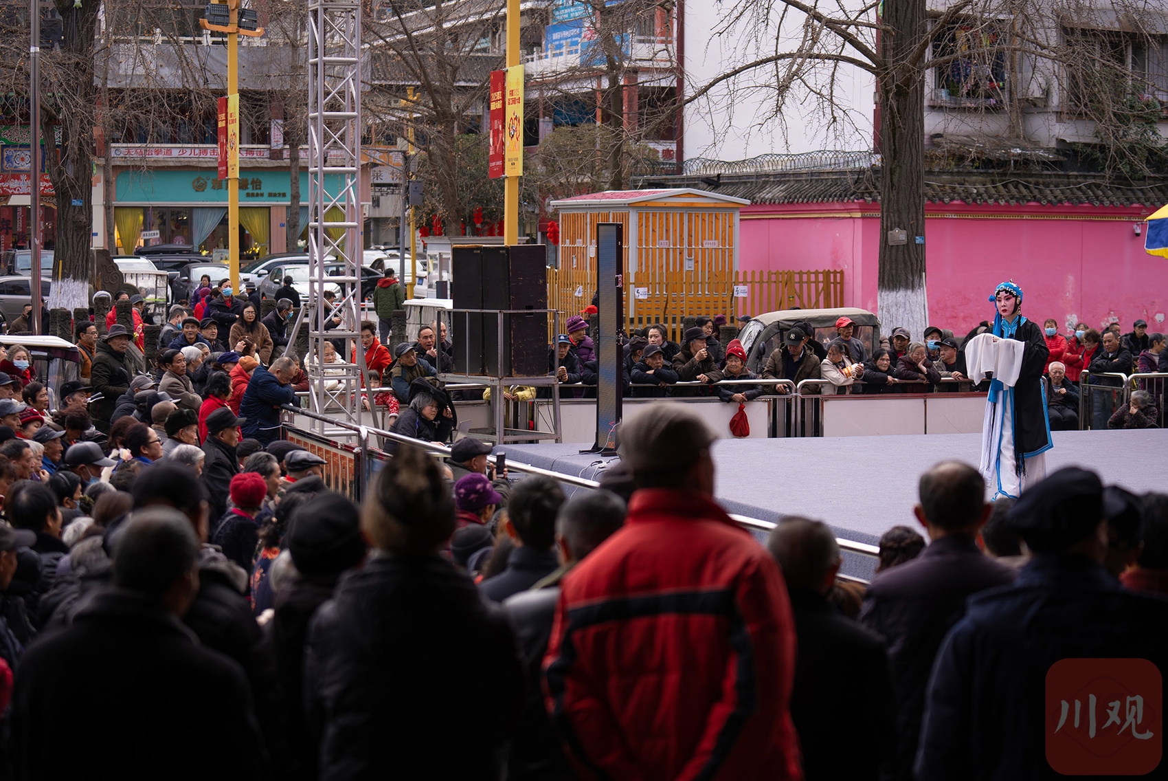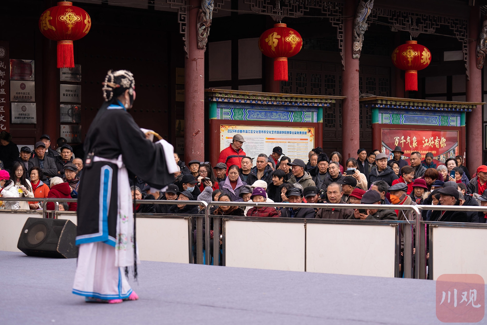 2月3日下午,温江文庙广场,春节氛围浓厚,市民游客在欢度佳节的同时,领略了传统戏曲文化的独特韵味。