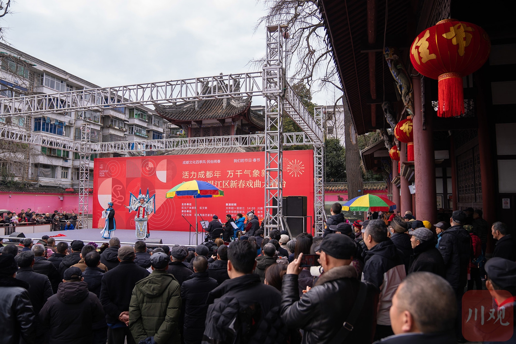 2月3日下午,温江文庙广场的戏曲大看台,吸引众多市民前来观赏。
