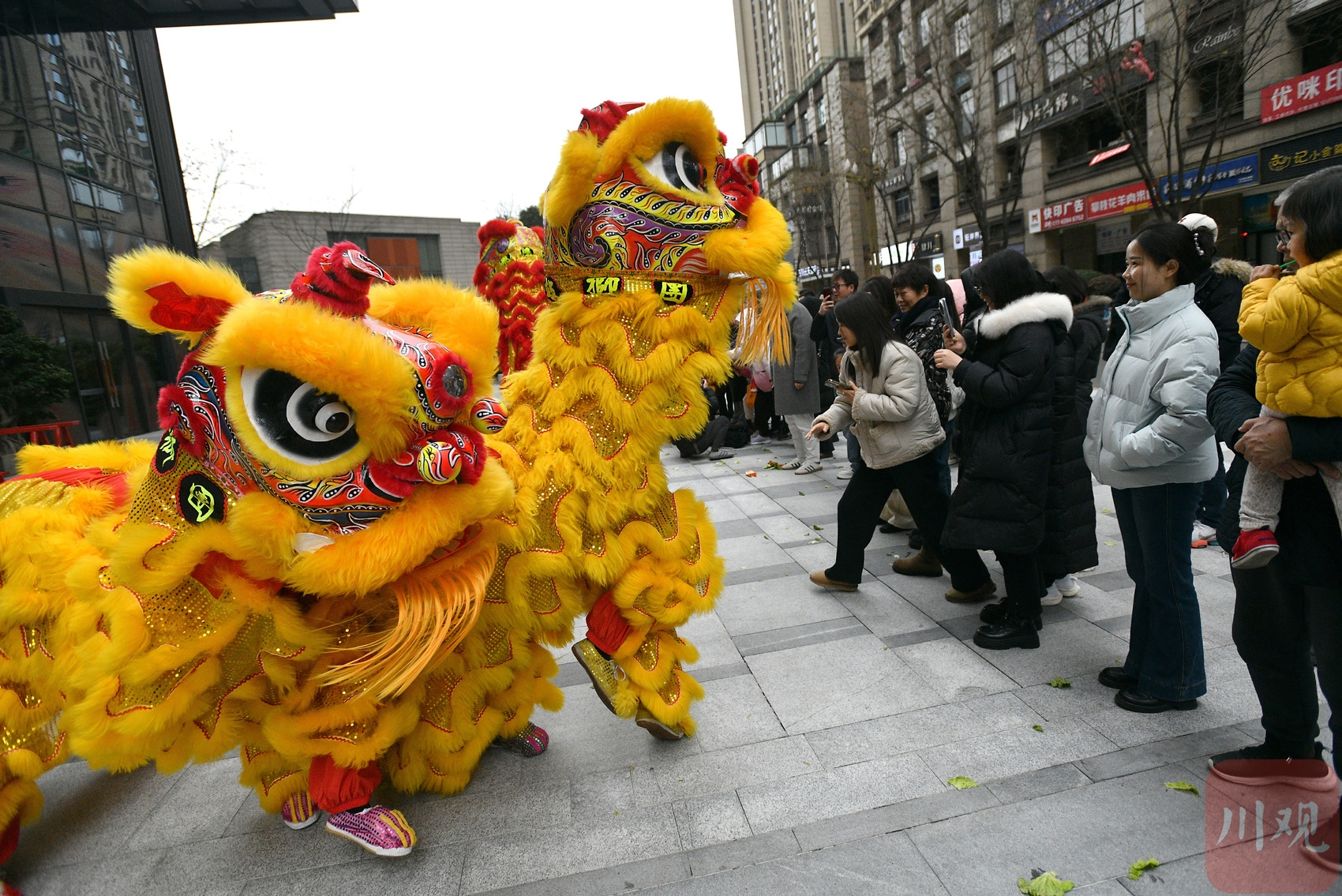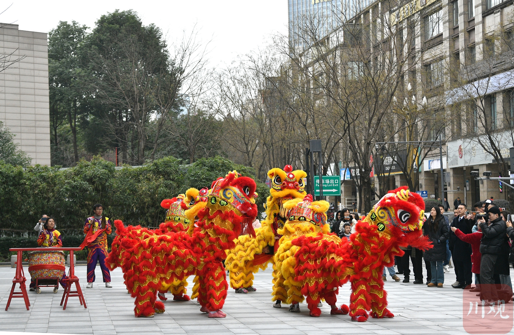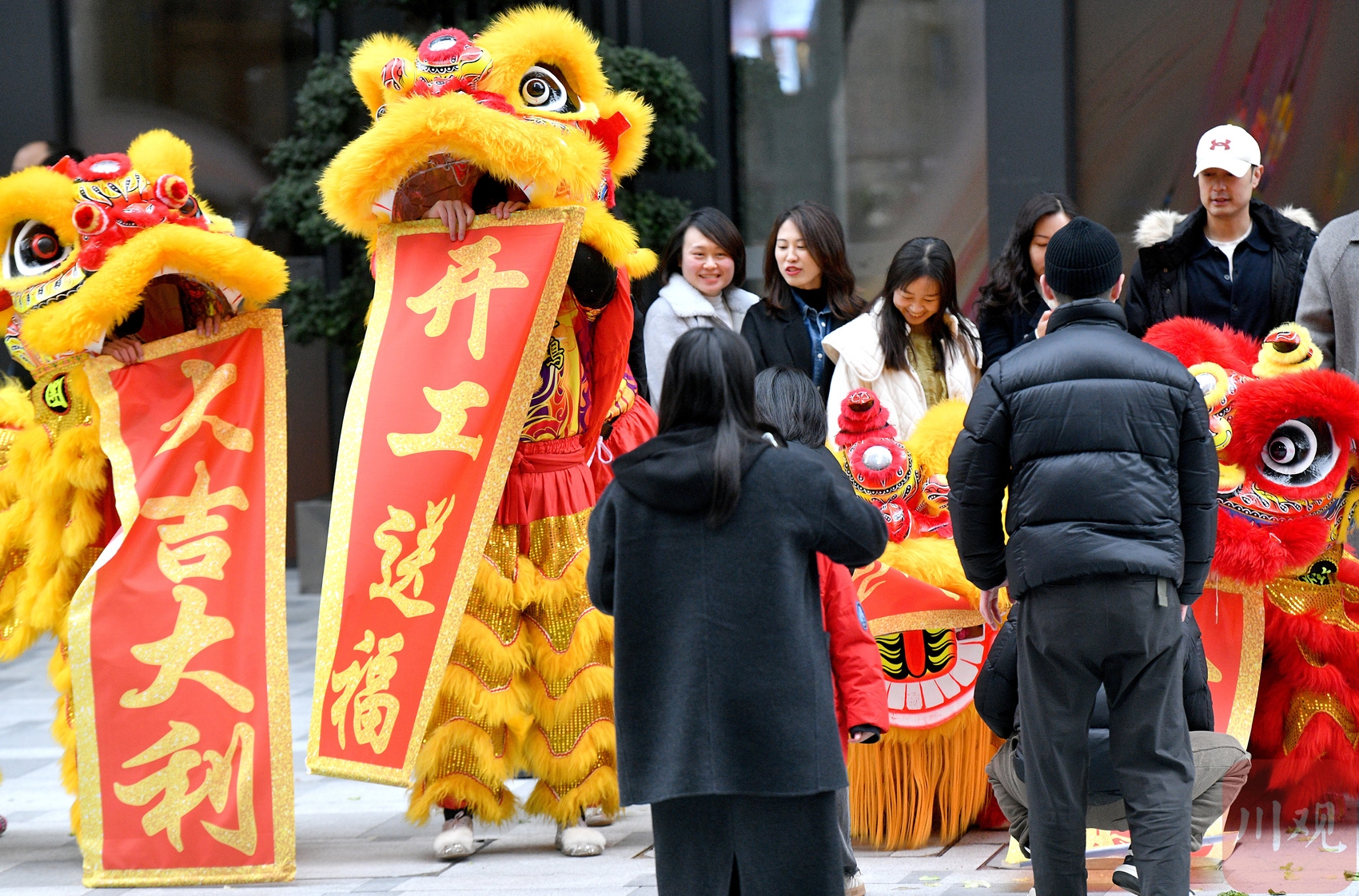 写字楼下舞狮庆开工。