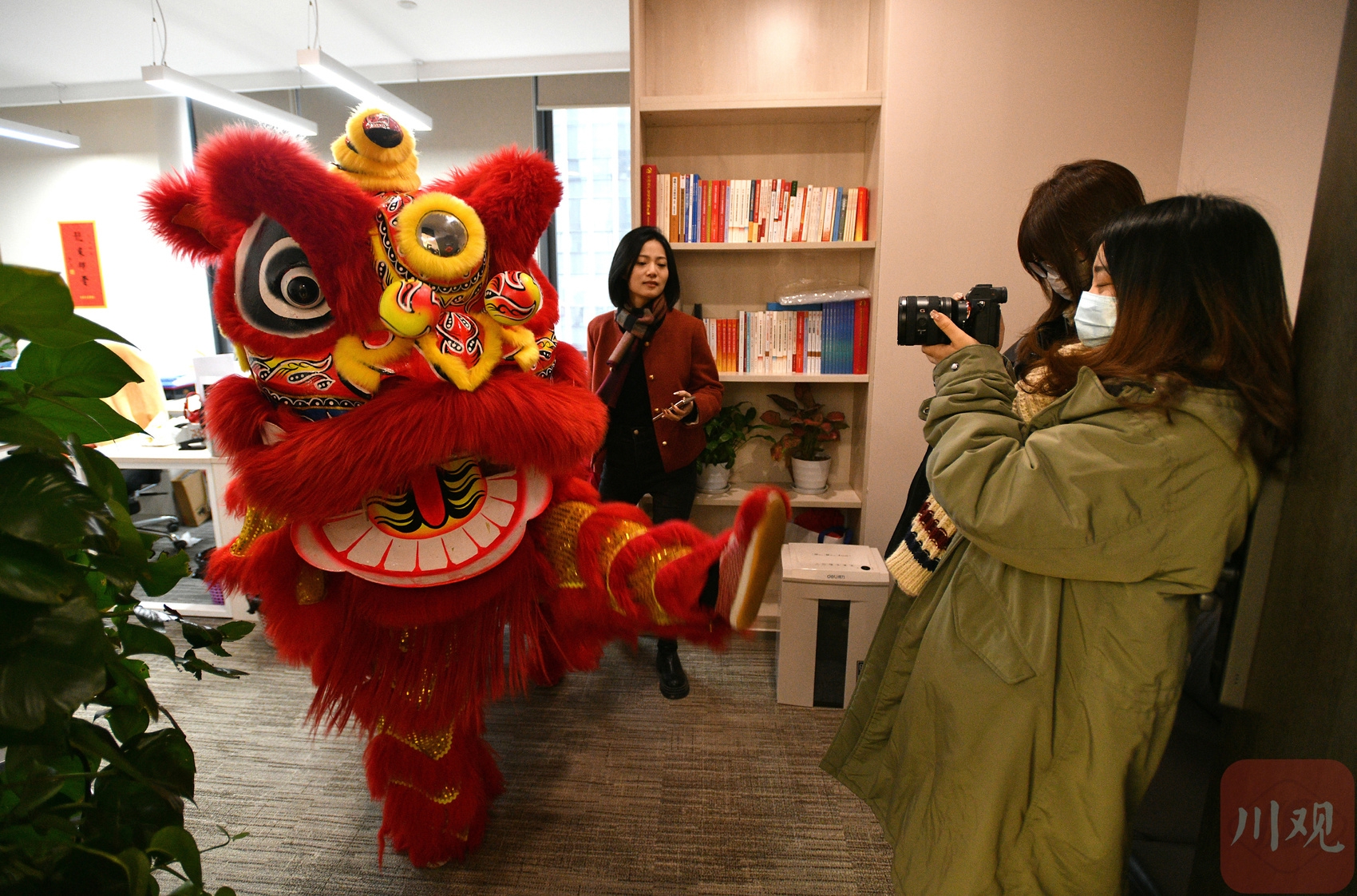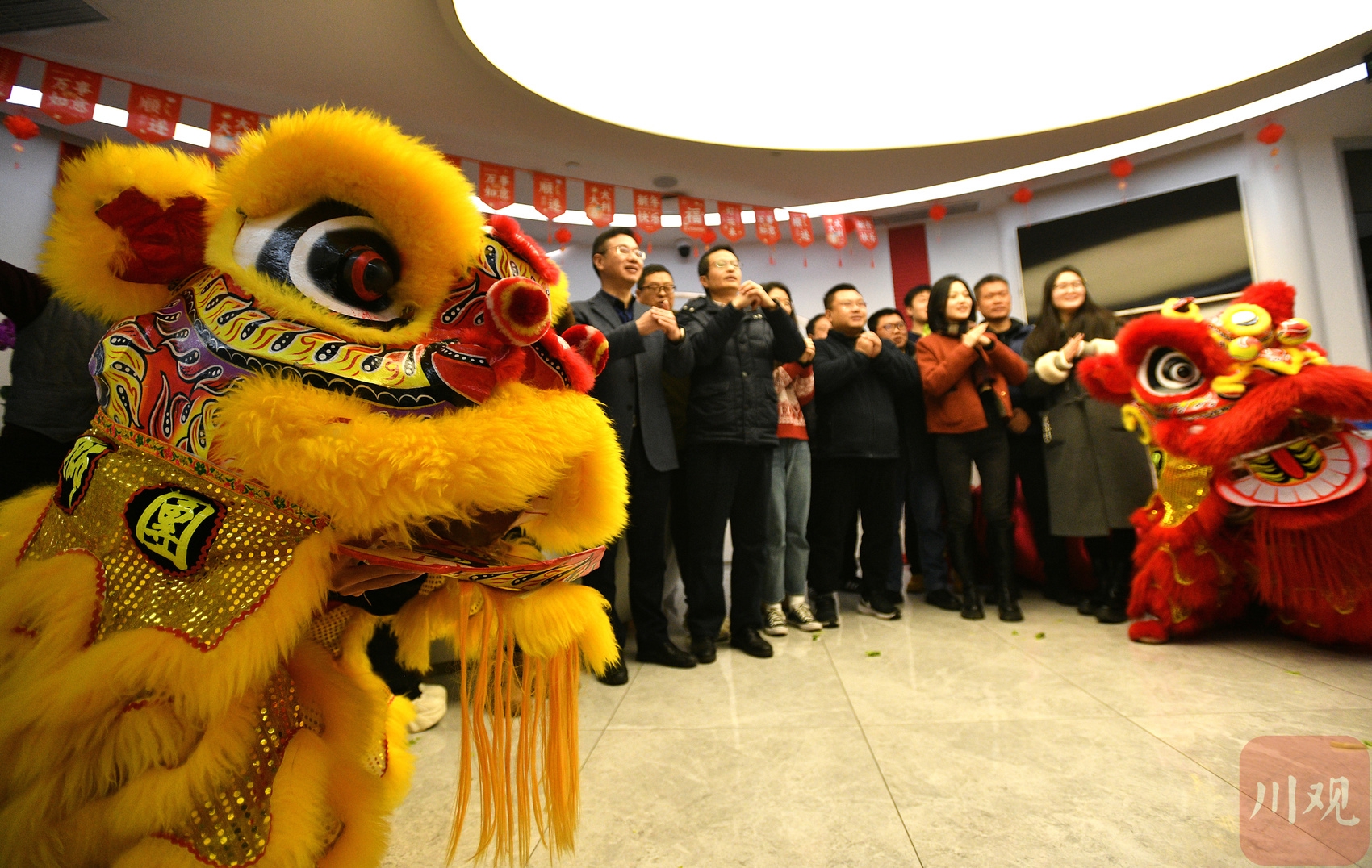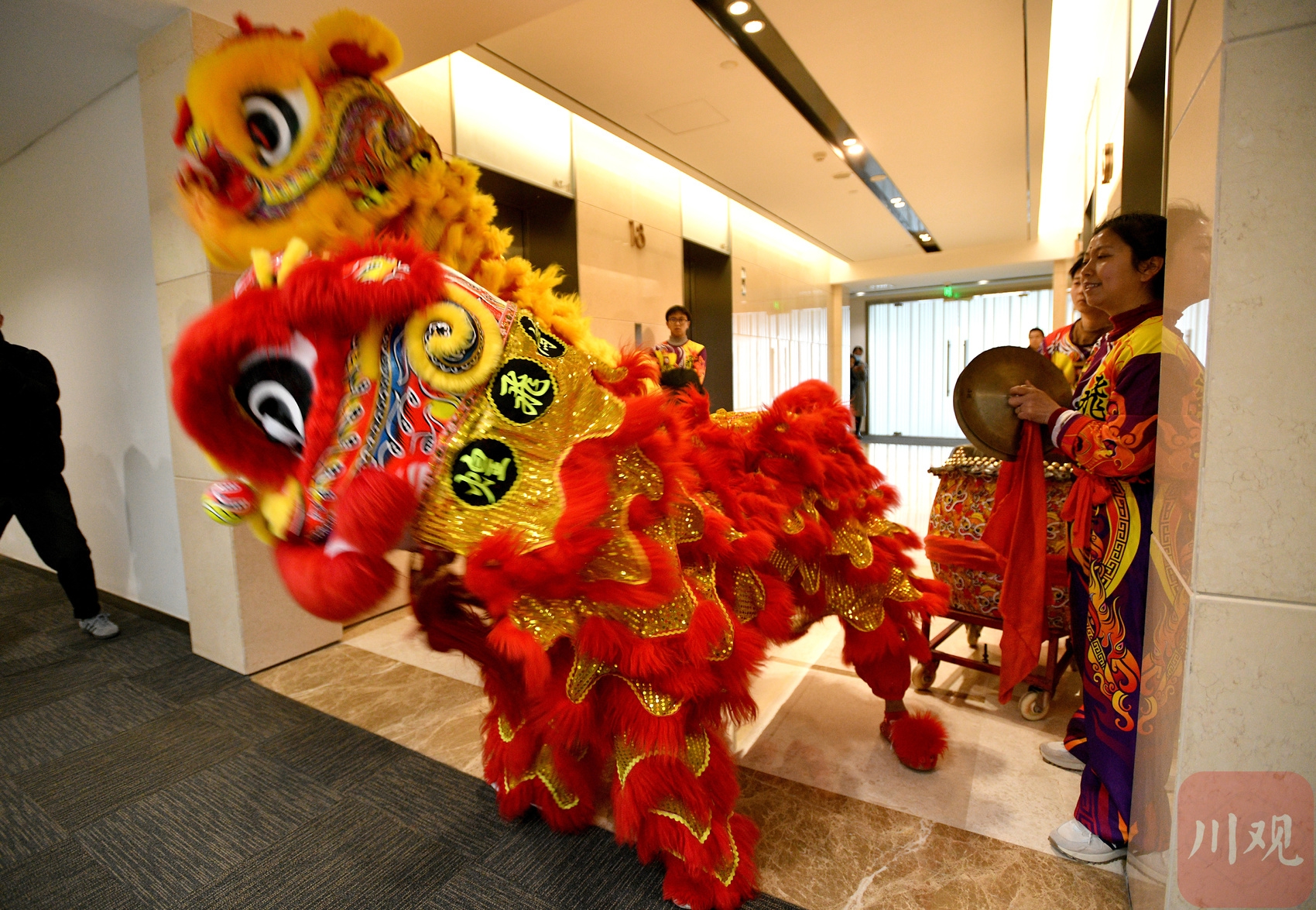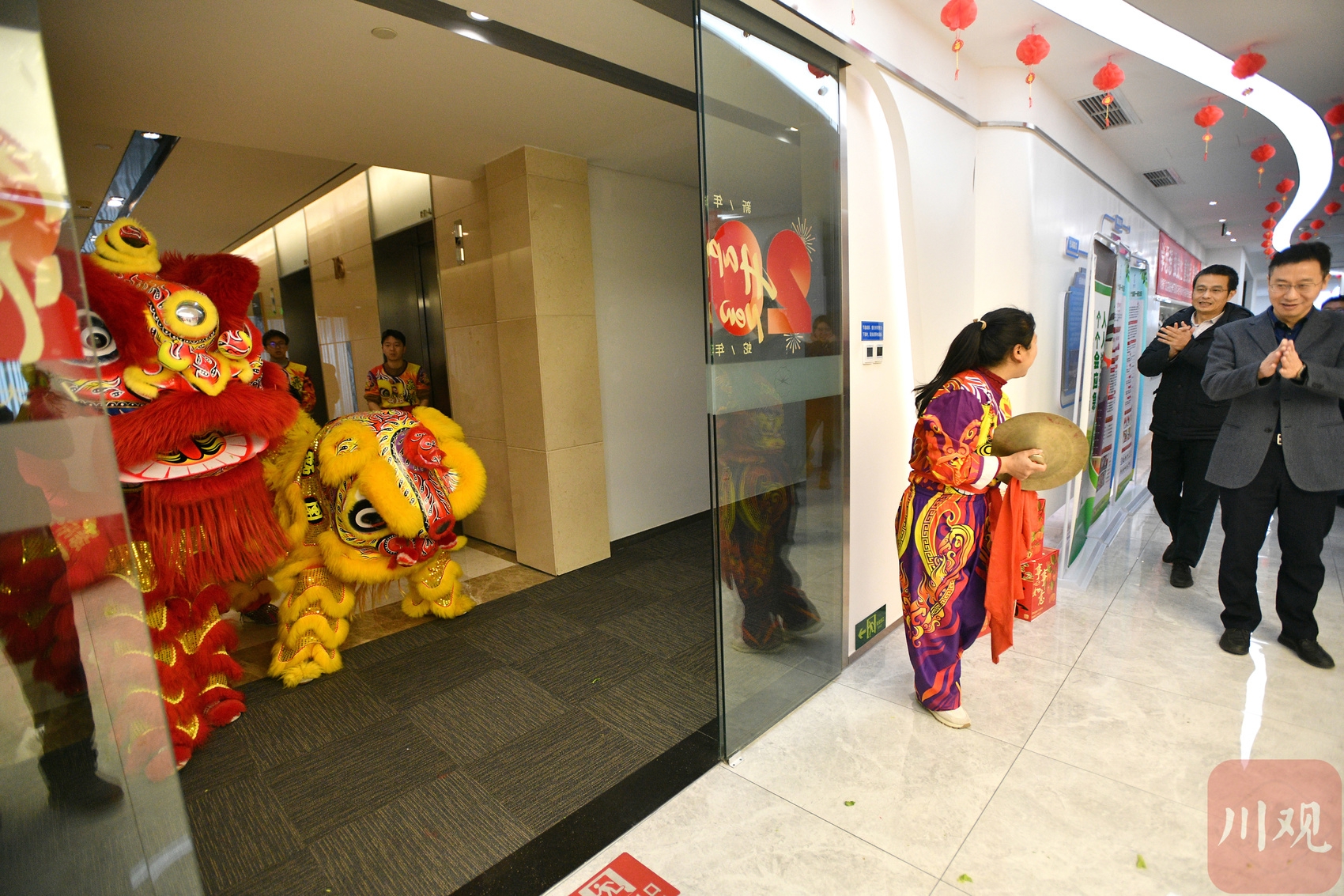 写字楼里舞狮庆开工。