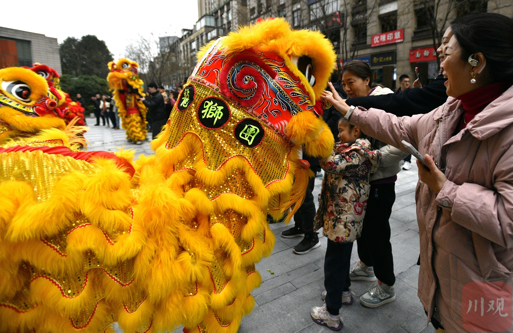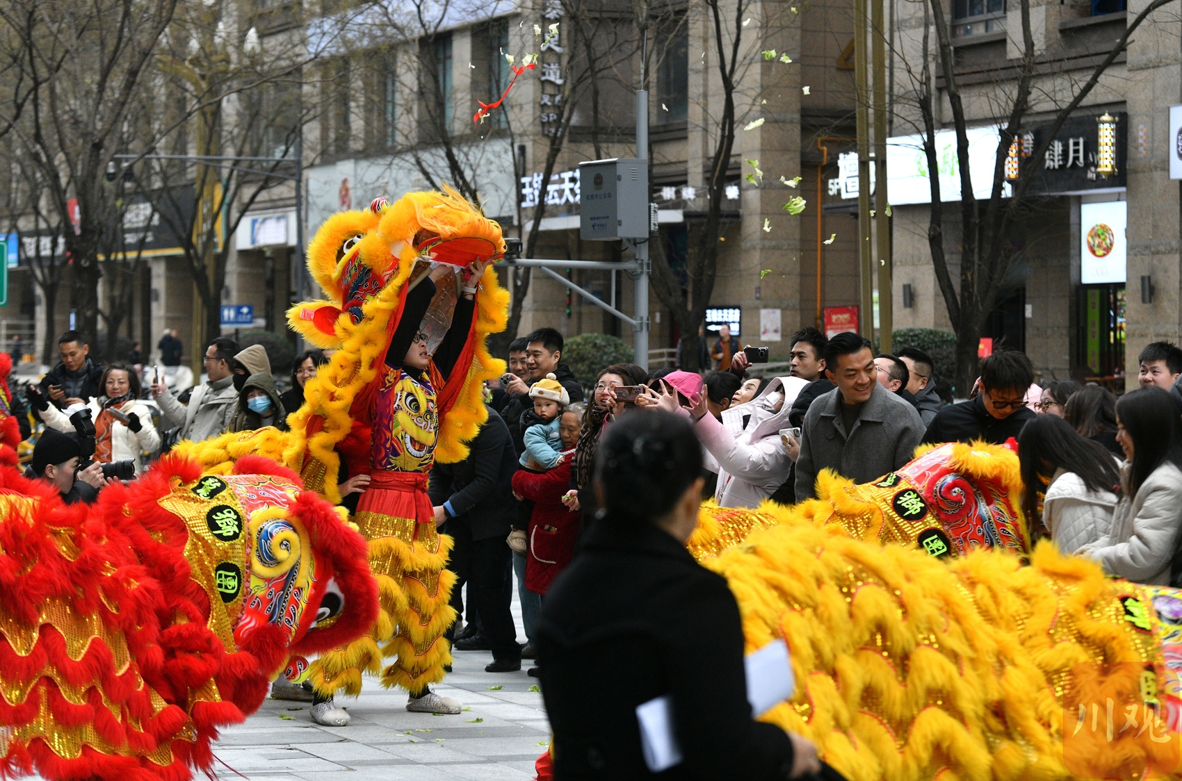 “今天是开工日,假期结束了,中午他们会有开工舞狮的庆典。”几位路过的市民议论道。记者上前了解到,这支成立于2002年的煌飞鸿龙狮团是成都为数不多的商业舞狮团队之一,主理人是45岁的殷强。他告诉记者,在成都活跃的龙狮队伍也就十来支,他们的业务主要出现在开业庆典、婚宴、寿宴、奠基等各种喜庆场合。今年春节,他们从初一开始就有演出任务。“大年二十八在家吃了团圆饭,之后就接到了庆典舞狮的工作。”殷强说道,“一般会忙到正月十五后才会稍微轻松一些。”今早8点他就带着队伍来到城里,“早上表演了四场,都是在汽车4S店、公司开业或开工仪式上。中午还有三场,下午还有一场。”殷强提到他的舞狮技艺是在广东佛山学的,而他的团队成员平均年龄在20岁左右的年轻人,能够持续带领这支舞狮队伍还得益于成都市场的需要。