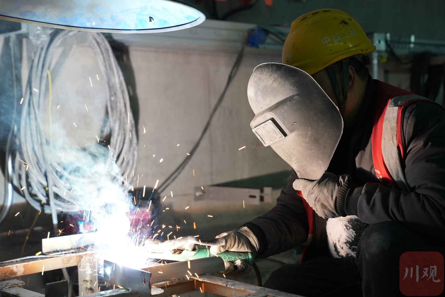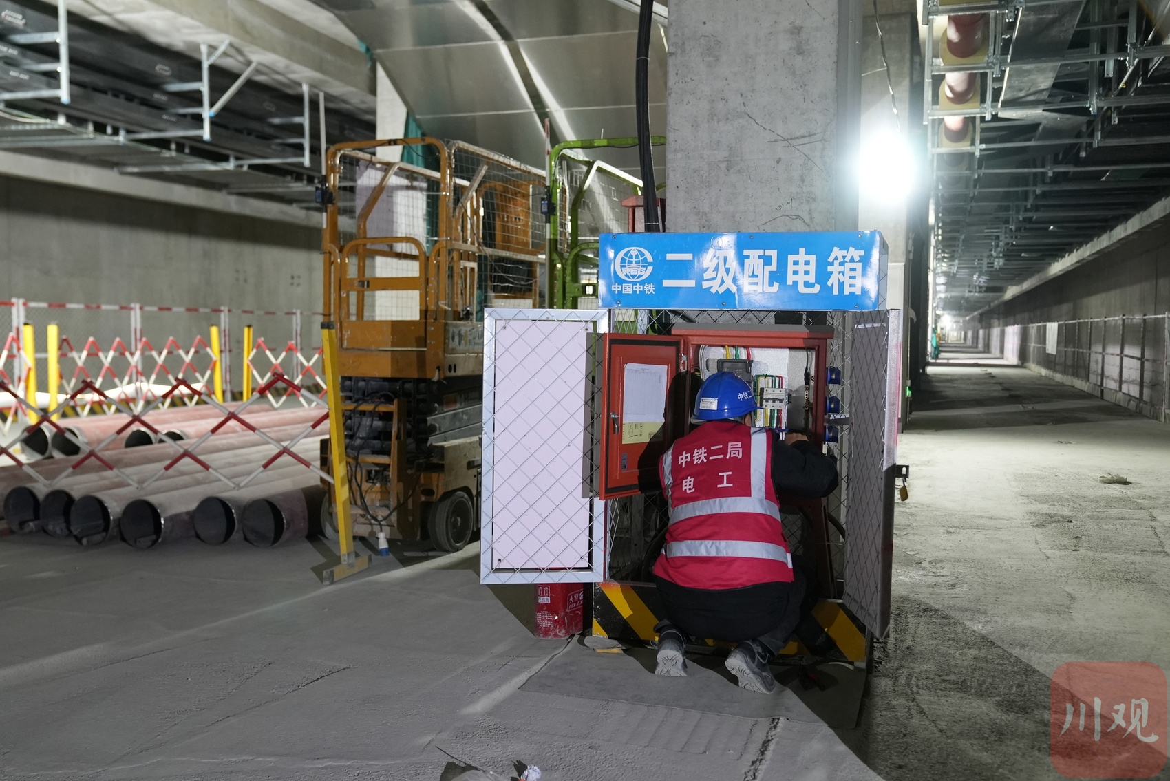 春节假期刚过,成都轨道交通各大重点工程开足马力忙生产,全力以赴拼经济搞建设,以新作为新气象奋力实现新年“开门红”。2月6日下午,记者来到在建的成都地铁13号线青羊宫站施工现场,下到站厅,头顶的管线有序排布,管道安装工人正在站厅公共区安装喷淋管道,焊工正在加工区加工管道支架,电工正在对已安装的配电箱进行送电前的检查。