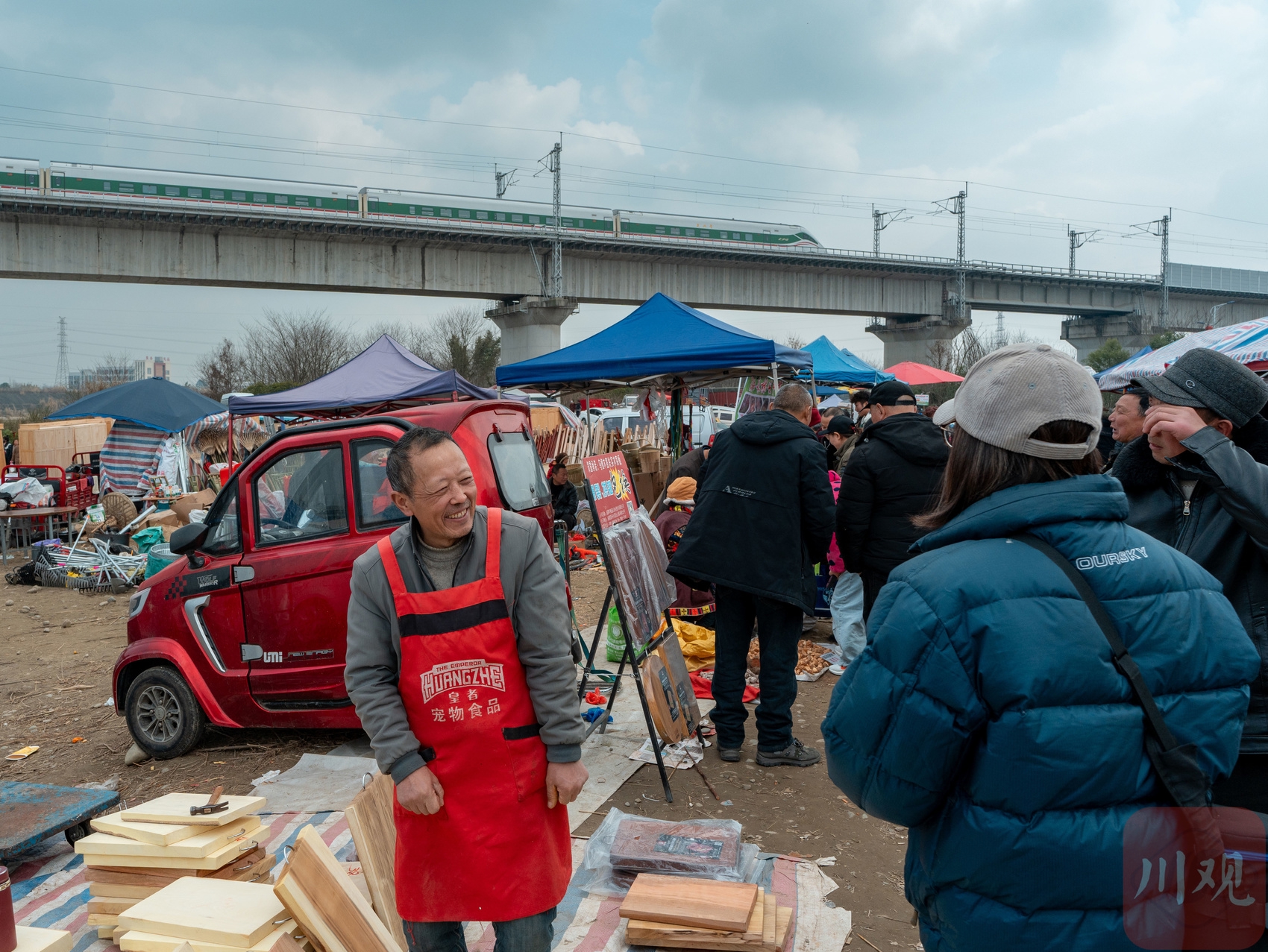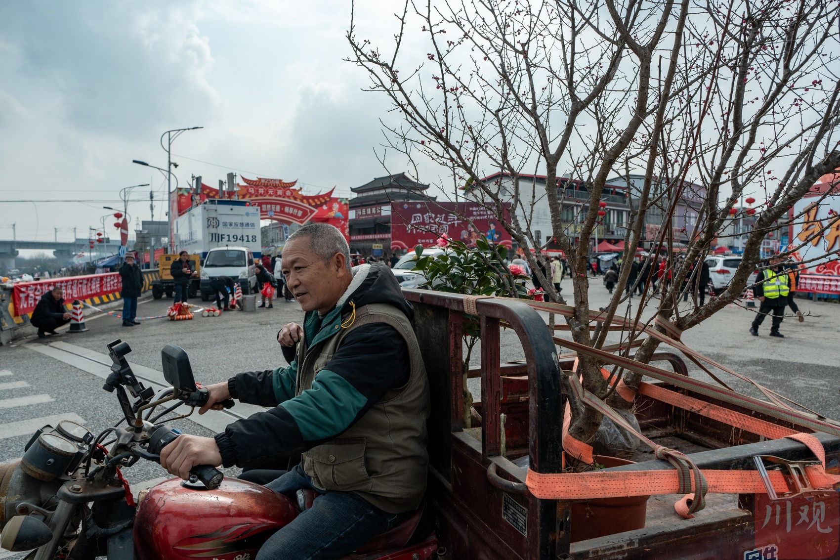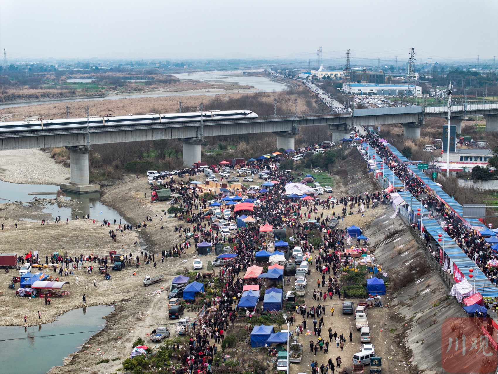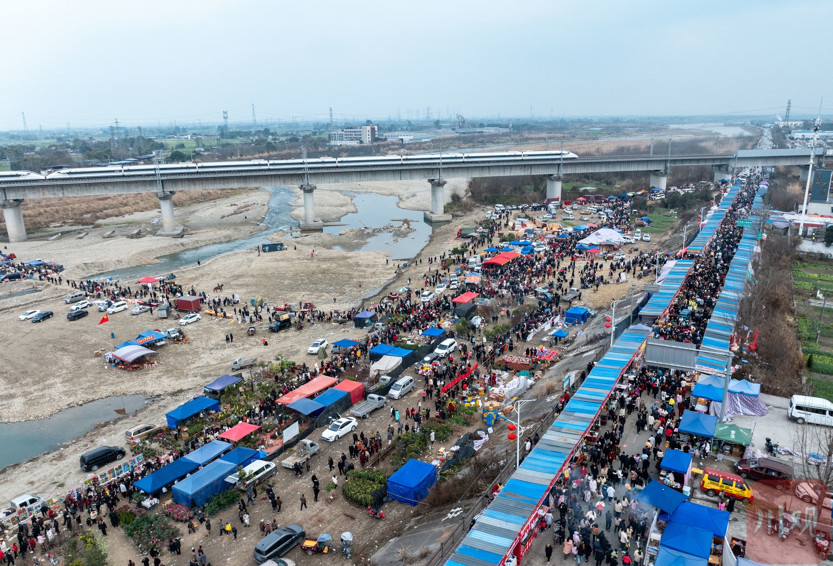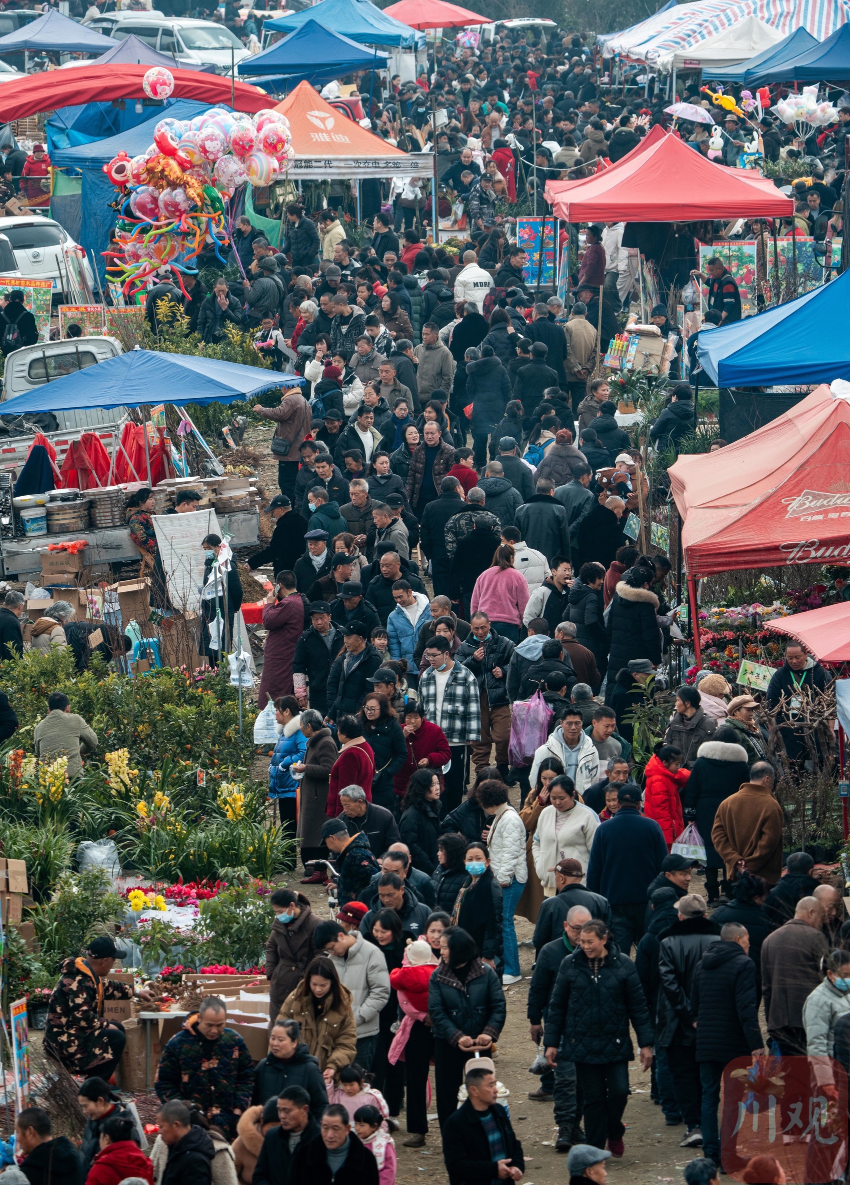 2月10日,德阳什邡市马井镇的马井大桥下,鸭子河坝中人来人往,在农资农具、花卉苗木展区中挤满了选购的市民,一年一度的川西民俗马井元宵会热闹进行。