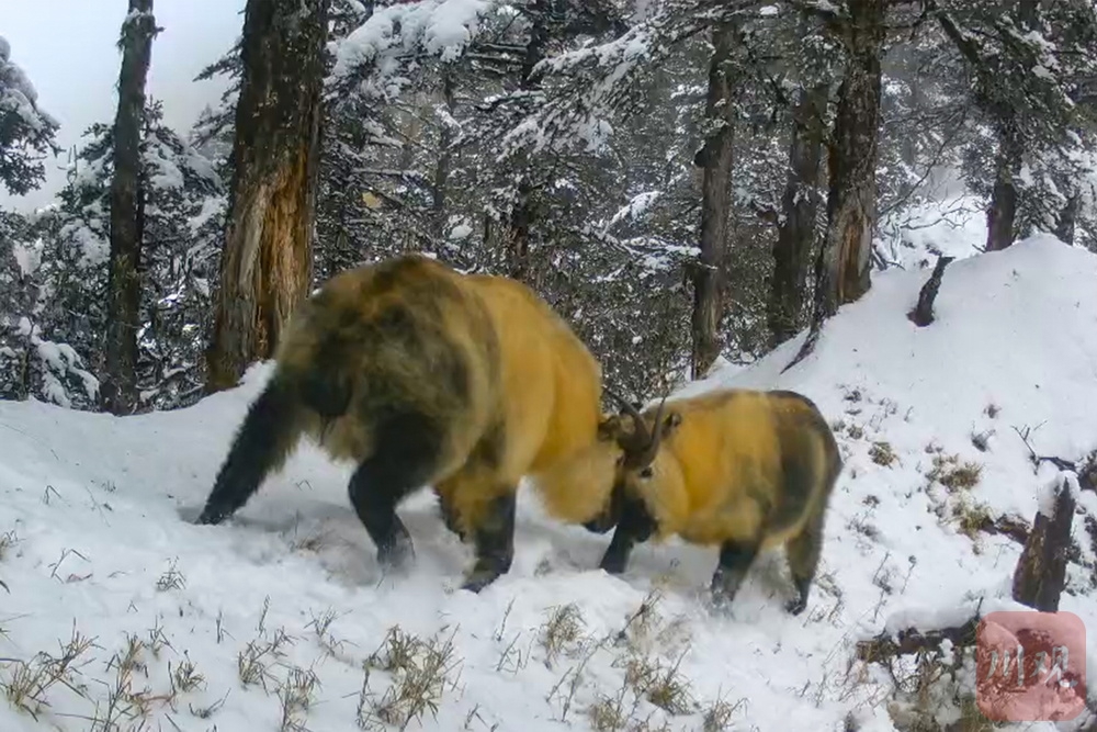 近日,大熊猫国家公园芦山县管护总站工作人员在查看超短波传输红外相机时,发现架设在该县大川镇的红外相机拍摄到两只羚牛雪地“打架”的影像画面。画面中,两只正在“打架”的羚牛体格健硕,牛角相抵,进退间激起阵阵雪雾。