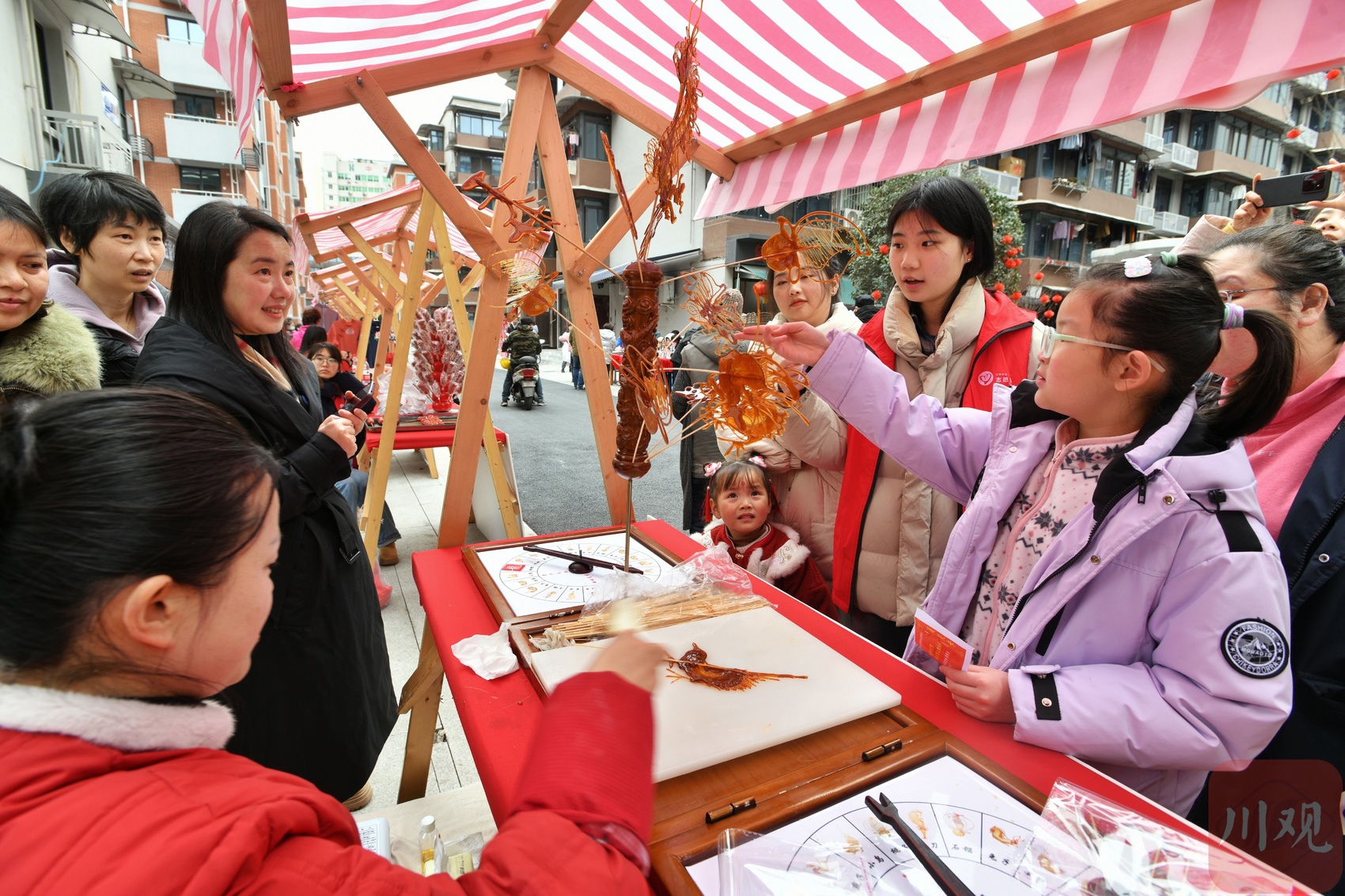 2月12日元宵佳节,下午3点,在成都老城区里的工人村社区,一场热热闹闹的非遗集市在新建居民楼前开启。现场不仅有促销的助农产品,蜀绣、年画、剪艺、糖艺等非遗摊位前也围满了居民,新春游园趣味活动区域更是吸引了社区的小朋友们,滚铁环、踢毽子、投壶、垃圾分类飞行棋……现场笑声不断。