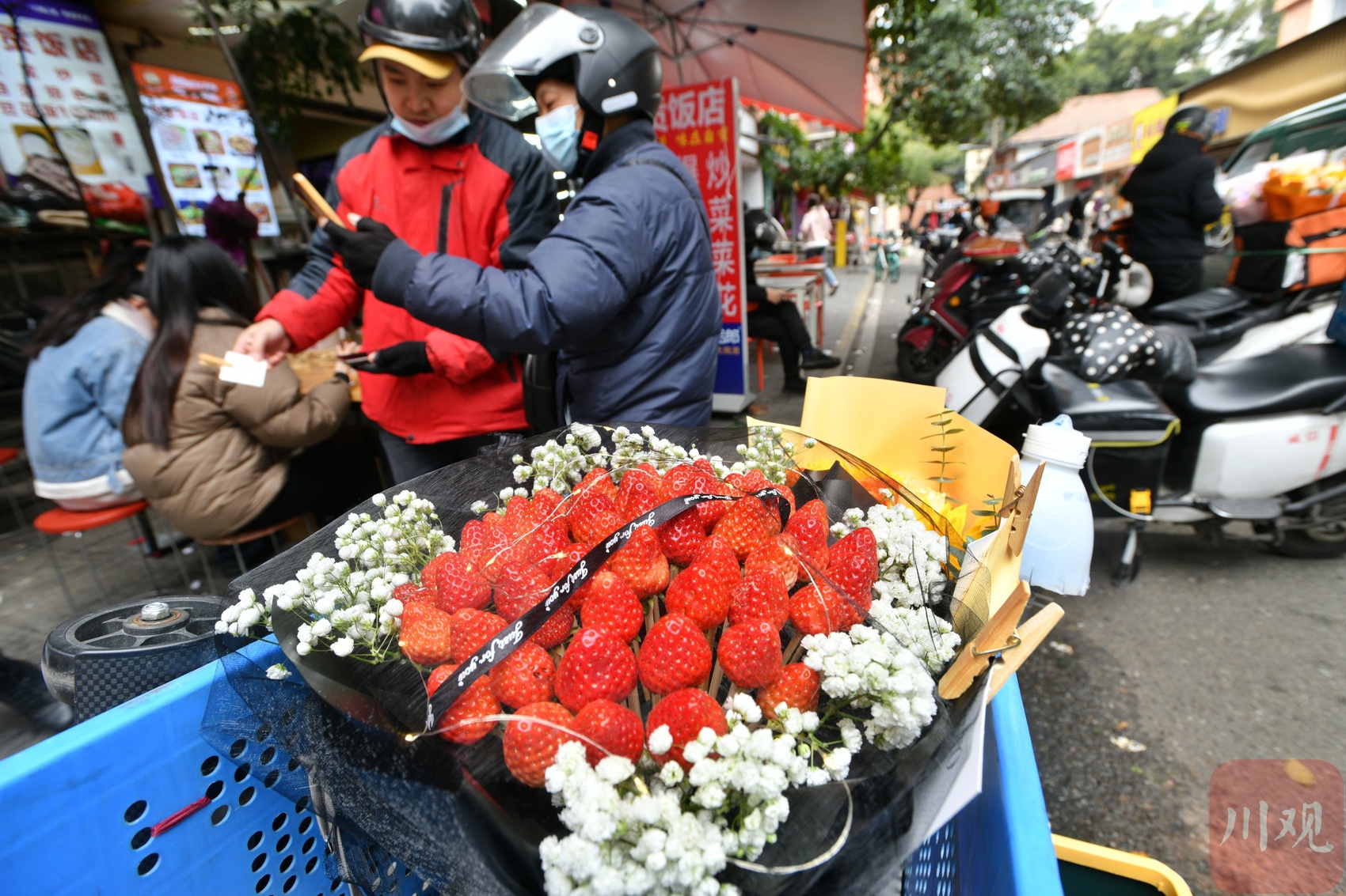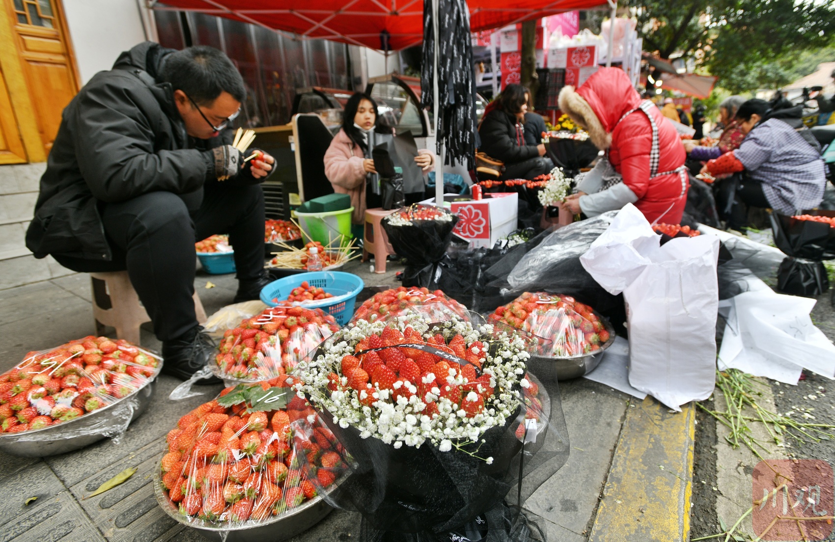 花店前,员工正忙着扎草莓花束。