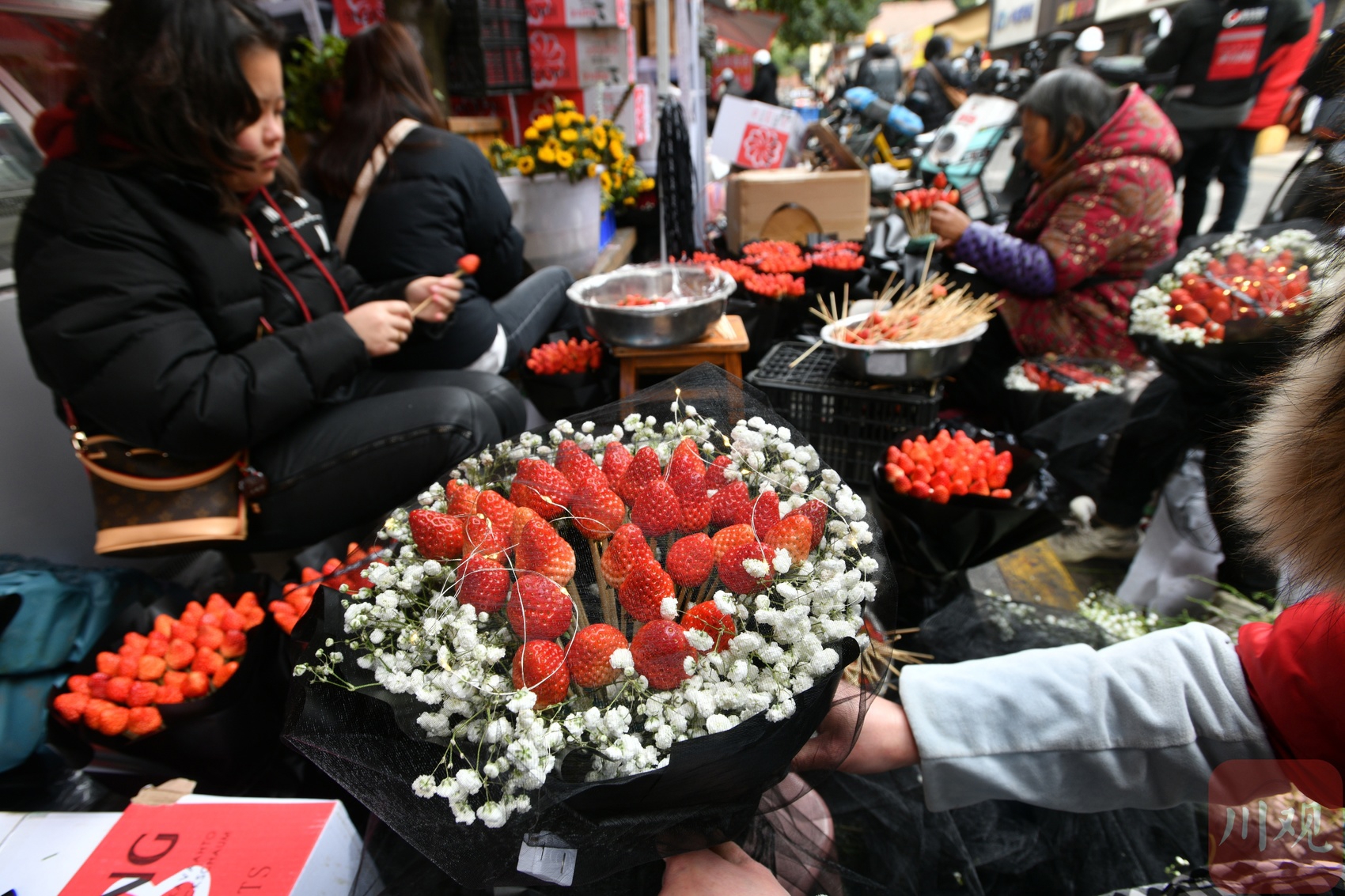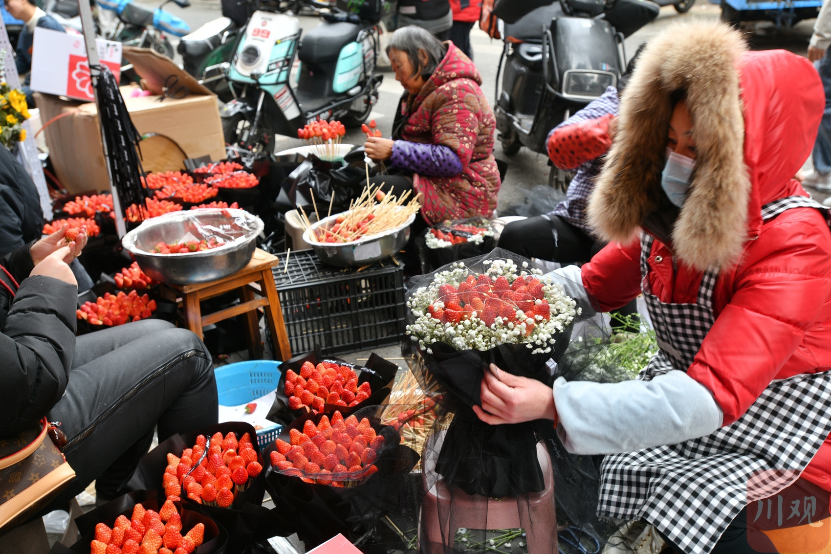 花店前,员工忙碌扎草莓花束。