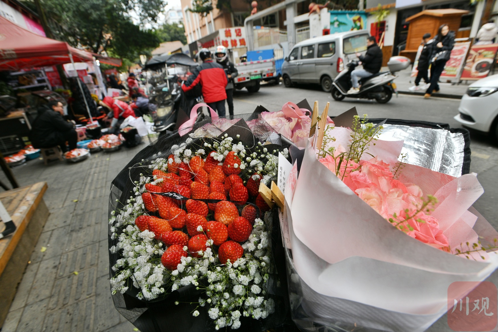 花店前准备送出的草莓花束。