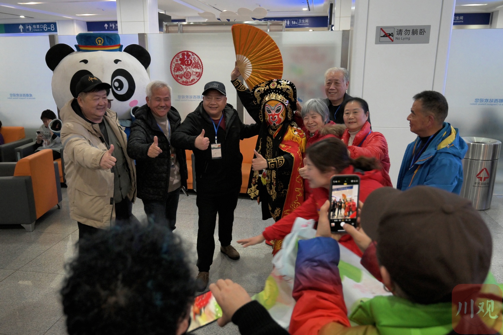 “熊猫专列”主题川剧表演,旅客们与表演者合影留念