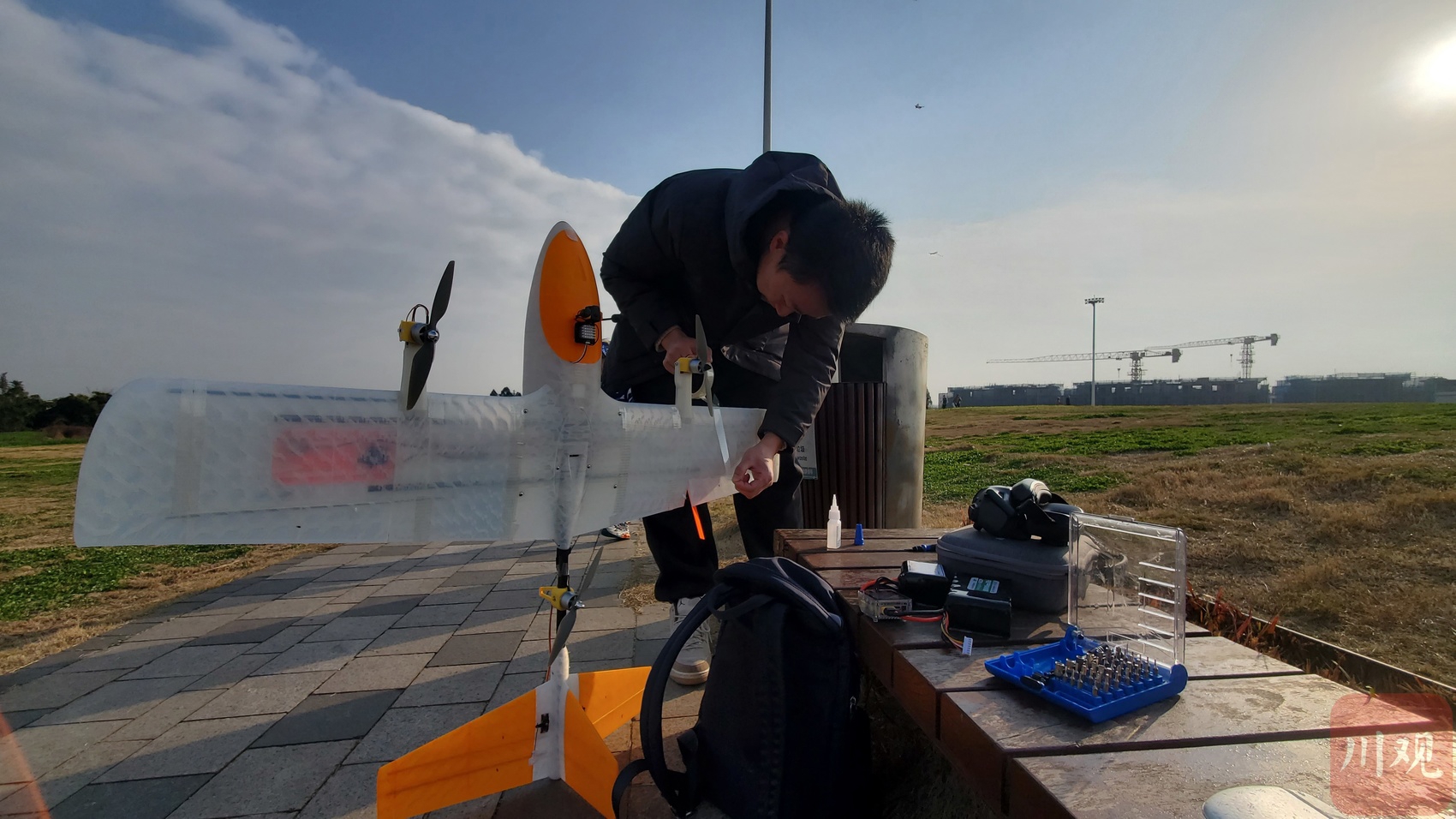 2月15日,成都市锦江区一公园的大草坪上,动力航模爱好者正在做起飞前的检查。