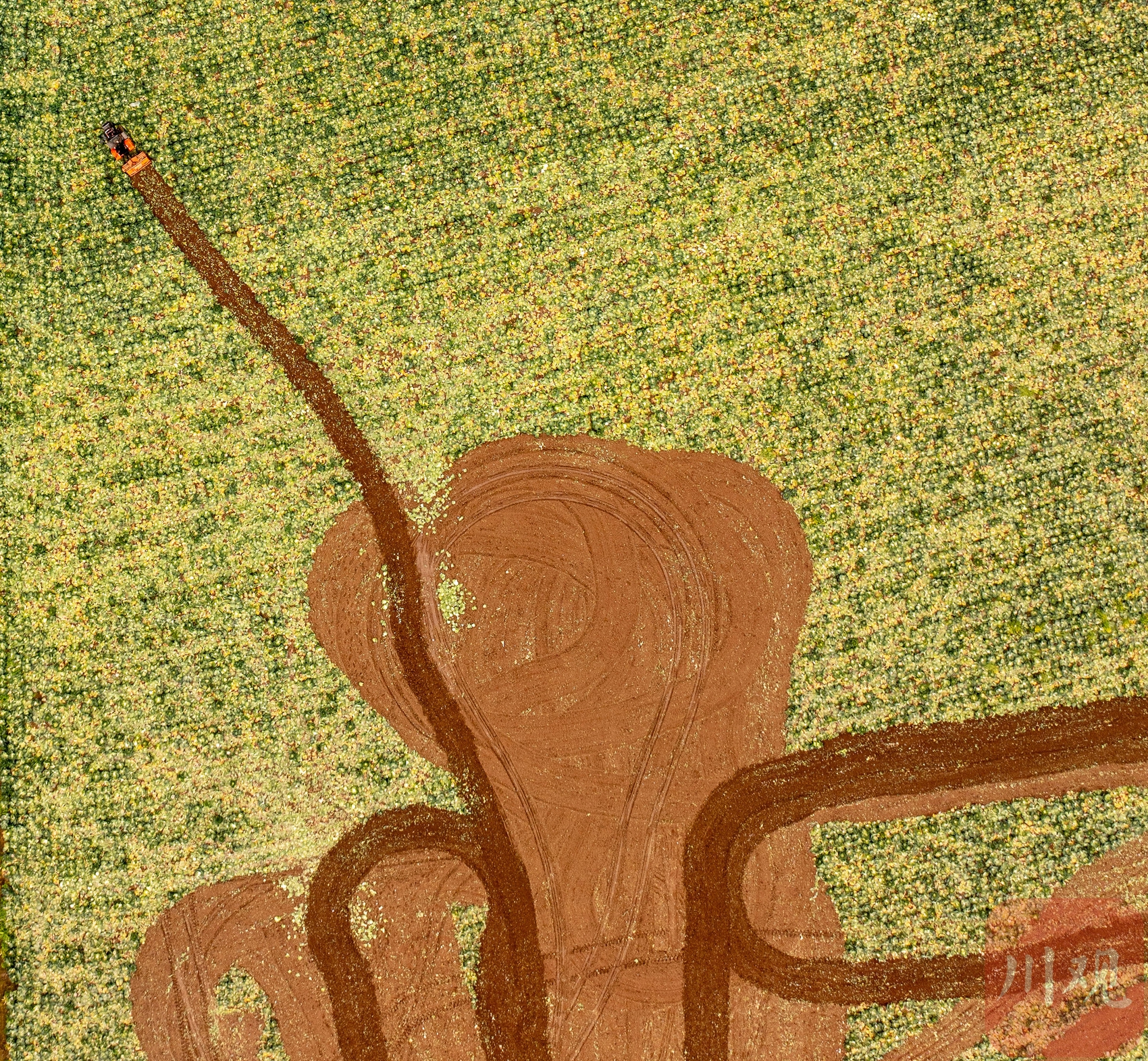 农用机械车在田间翻土准备栽种玉米,像是在土地上作画。