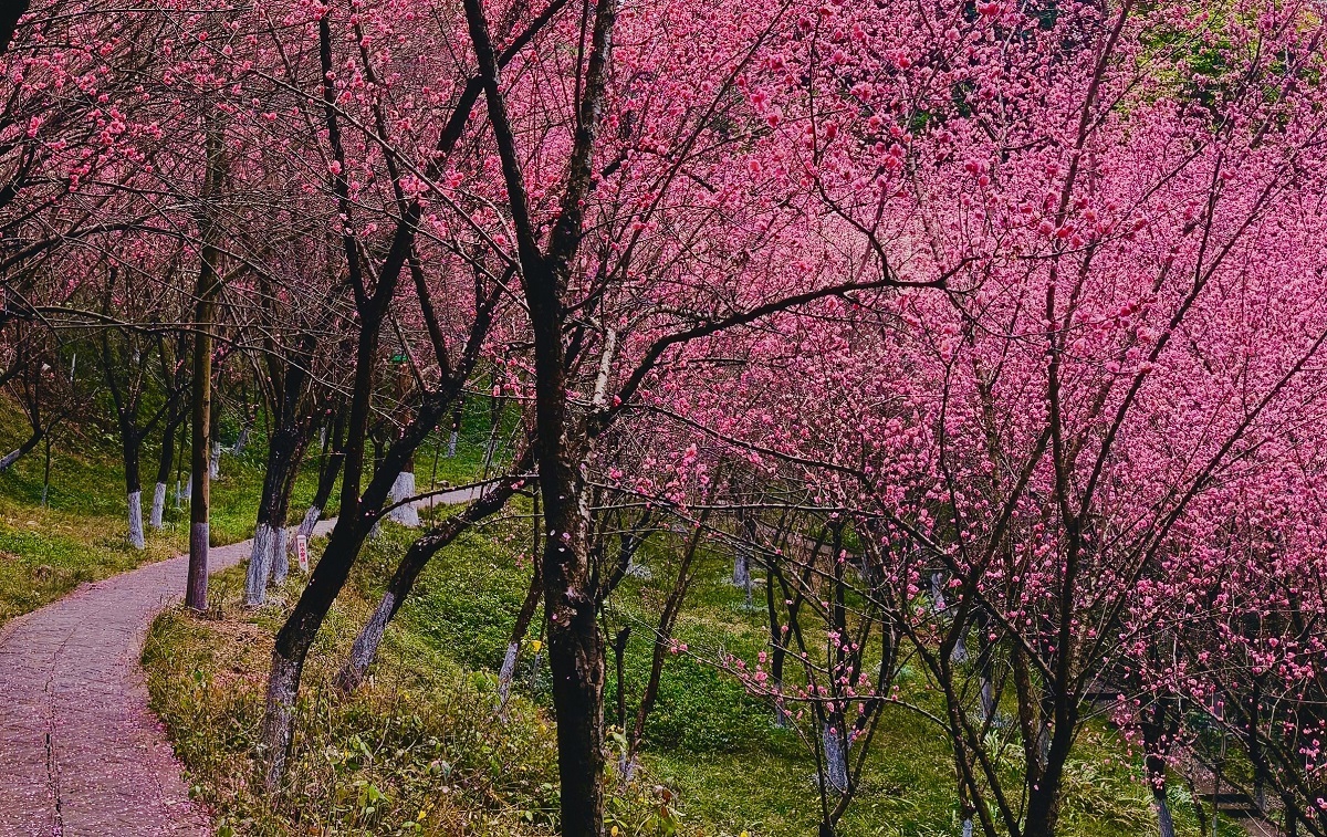 2月26日,位于绵阳市游仙区境内的富乐山上,微风轻拂,近3000亩梅林层层叠叠、淡淡清香沁人心脾。