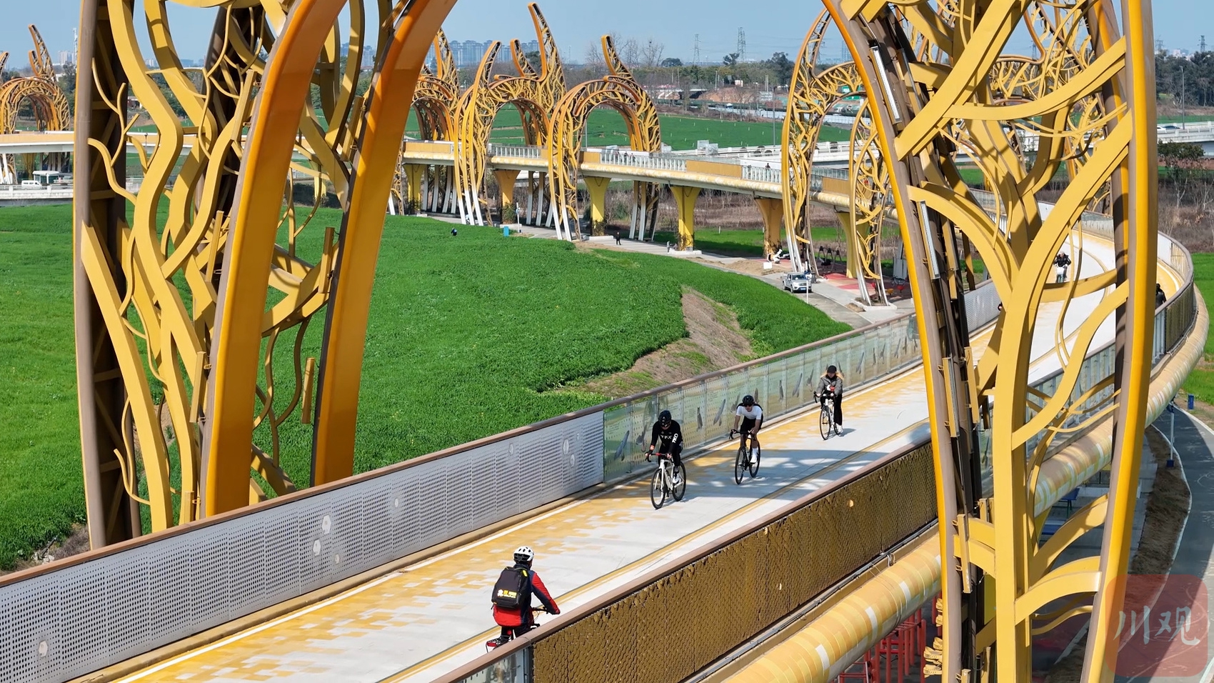 2月27日,市民骑行在环城绿道上,打卡春日麦浪。