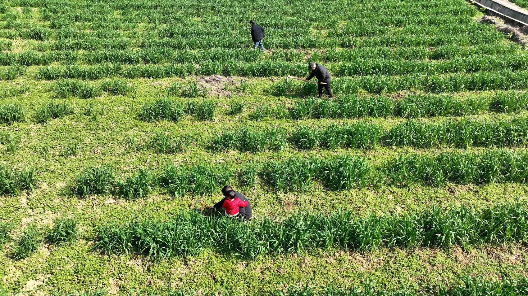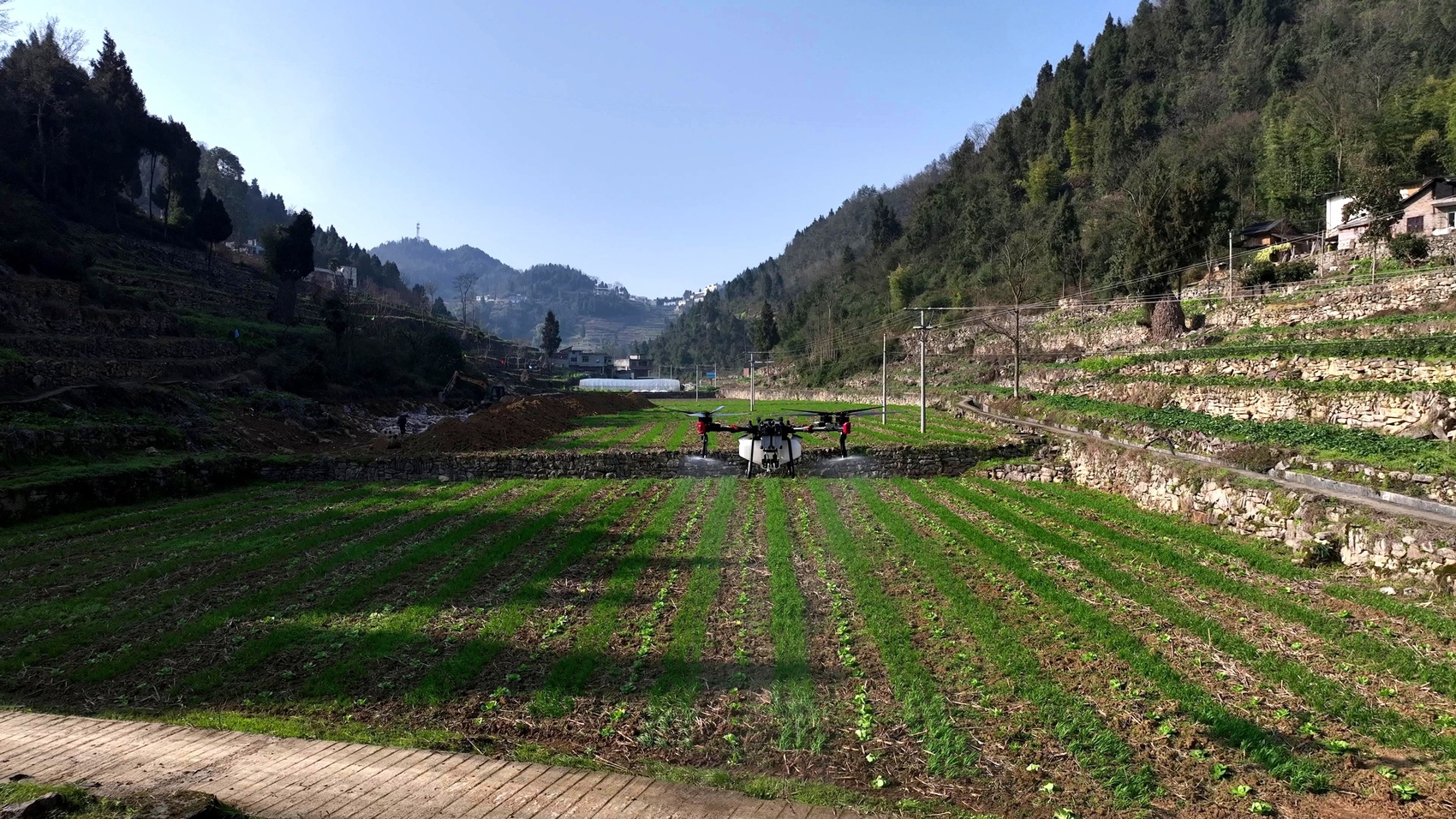 田地间,小麦苗已经破土而出,绿意盎然;天空中,一架大型植保无人机腾空而起,细密的水雾均匀地洒落在田地里,不一会儿,十余亩农田的喷药作业很快便顺利完成。