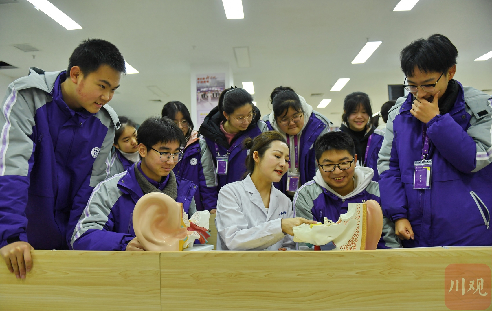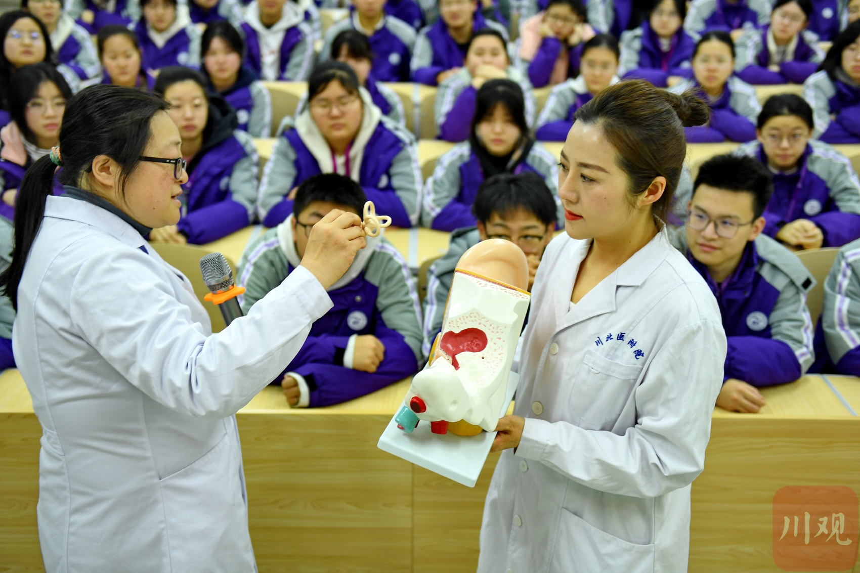 2025年3月1日,在四川省南充高级中学临江校区、川北医学院附属医院耳鼻咽喉头颈外科主治医师潘庆春(中)为同学们讲解耳蜗构造及科学护耳知识。