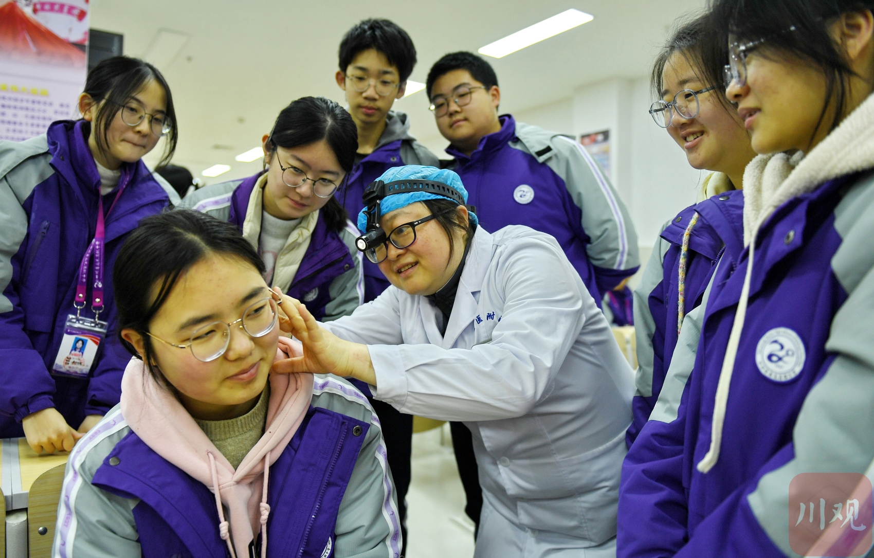 2025年3月1日,在四川省南充高级中学临江校区、川北医学院附属医院耳鼻咽喉头颈外科李蓓副教授(中)为同学们检查耳朵健康情况。