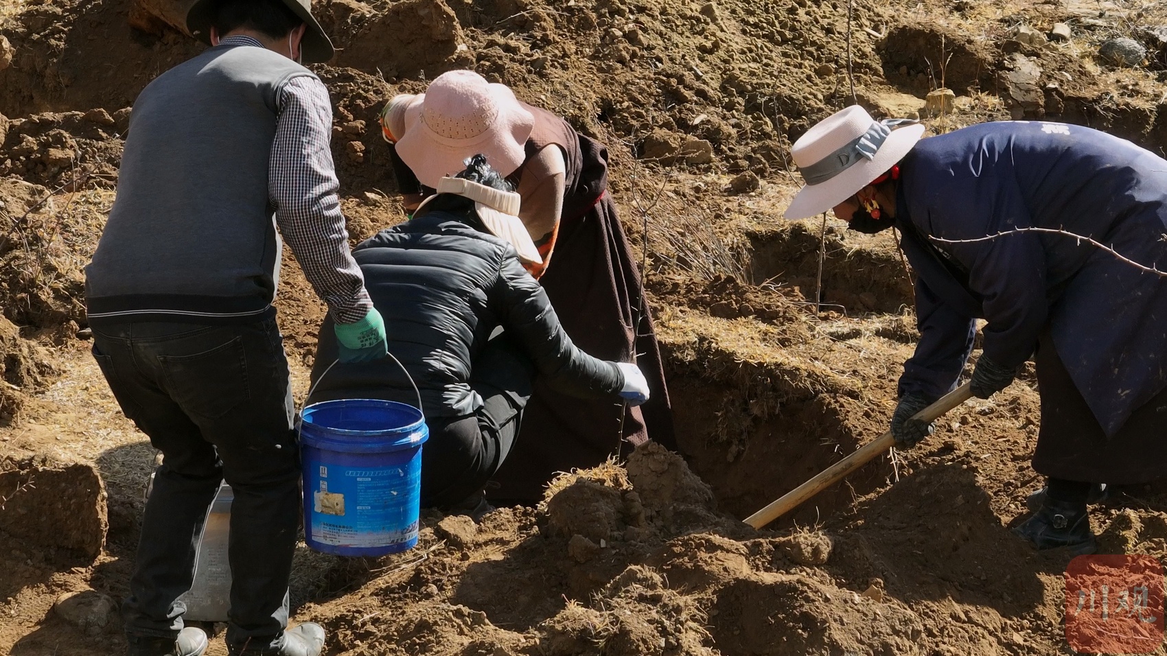 “挖坑要够深够宽,这样树苗才能舒展扎根;填土的时候要分层踏实,最后还要浇透水。这样树苗的成活率会更高。”道孚县林业和草原局技术人员何行铭一边详细讲解,一边演示果树苗木定植的技术要领。