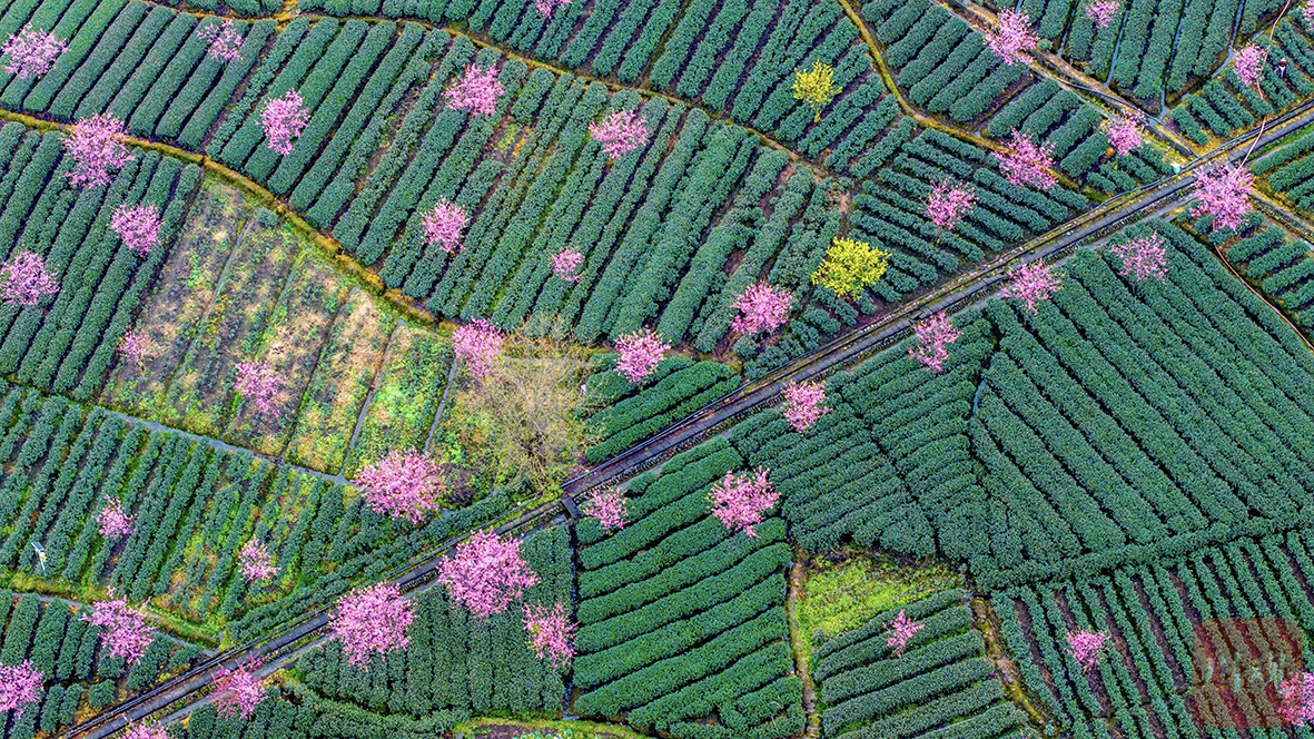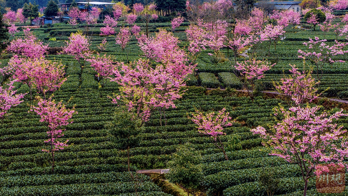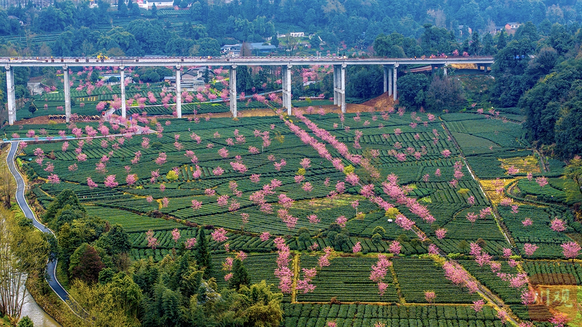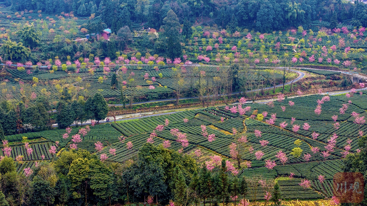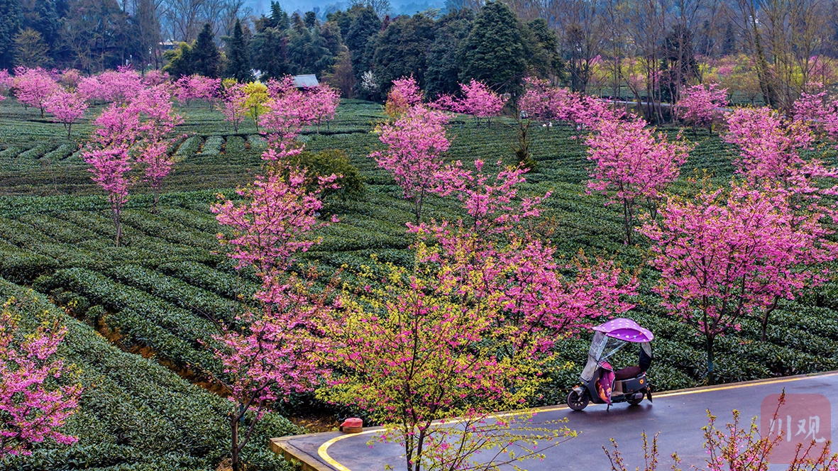 雅安市名山区新店镇的茶山上,翠绿茶山与粉色樱花相互映衬,形成独特景观。