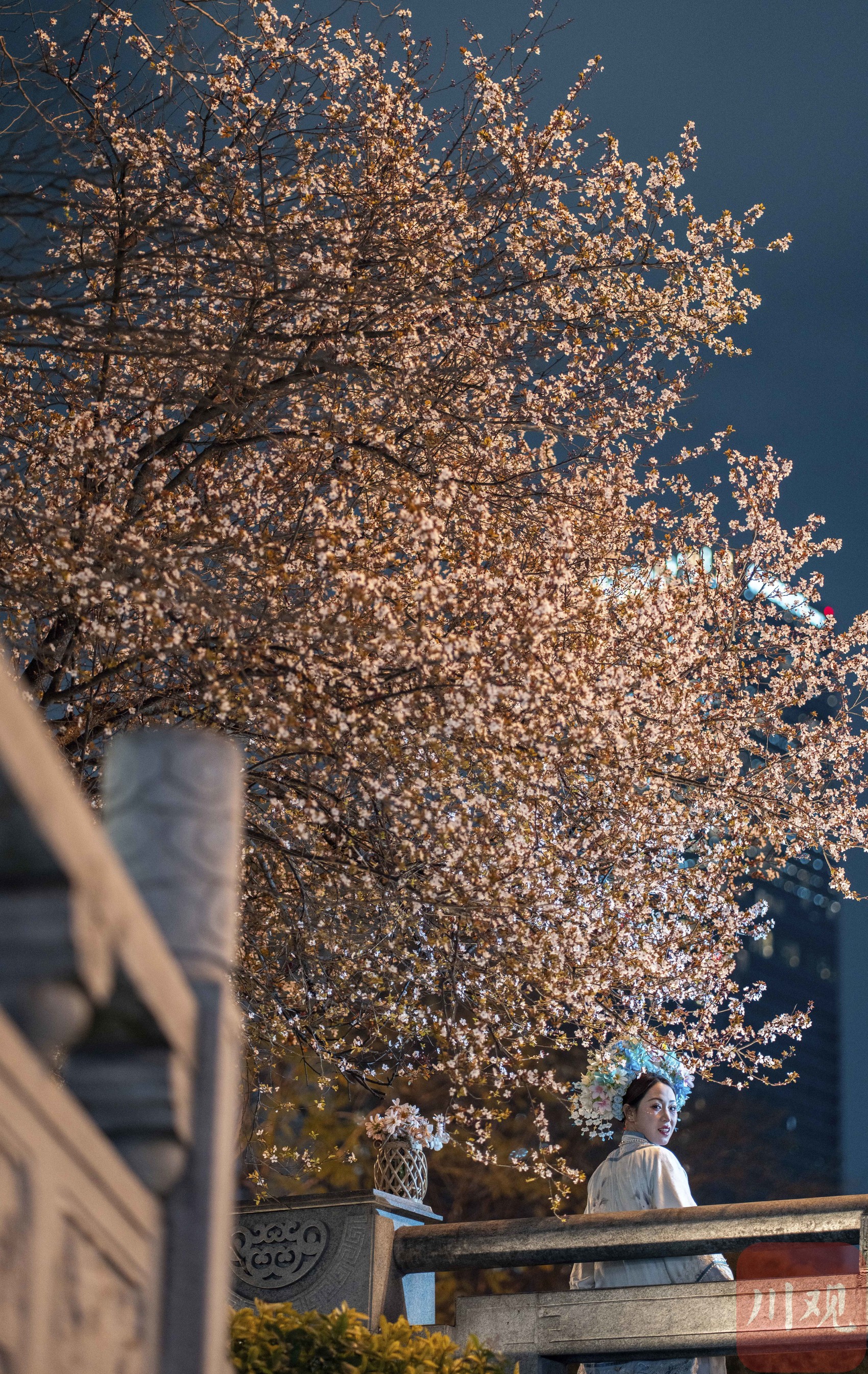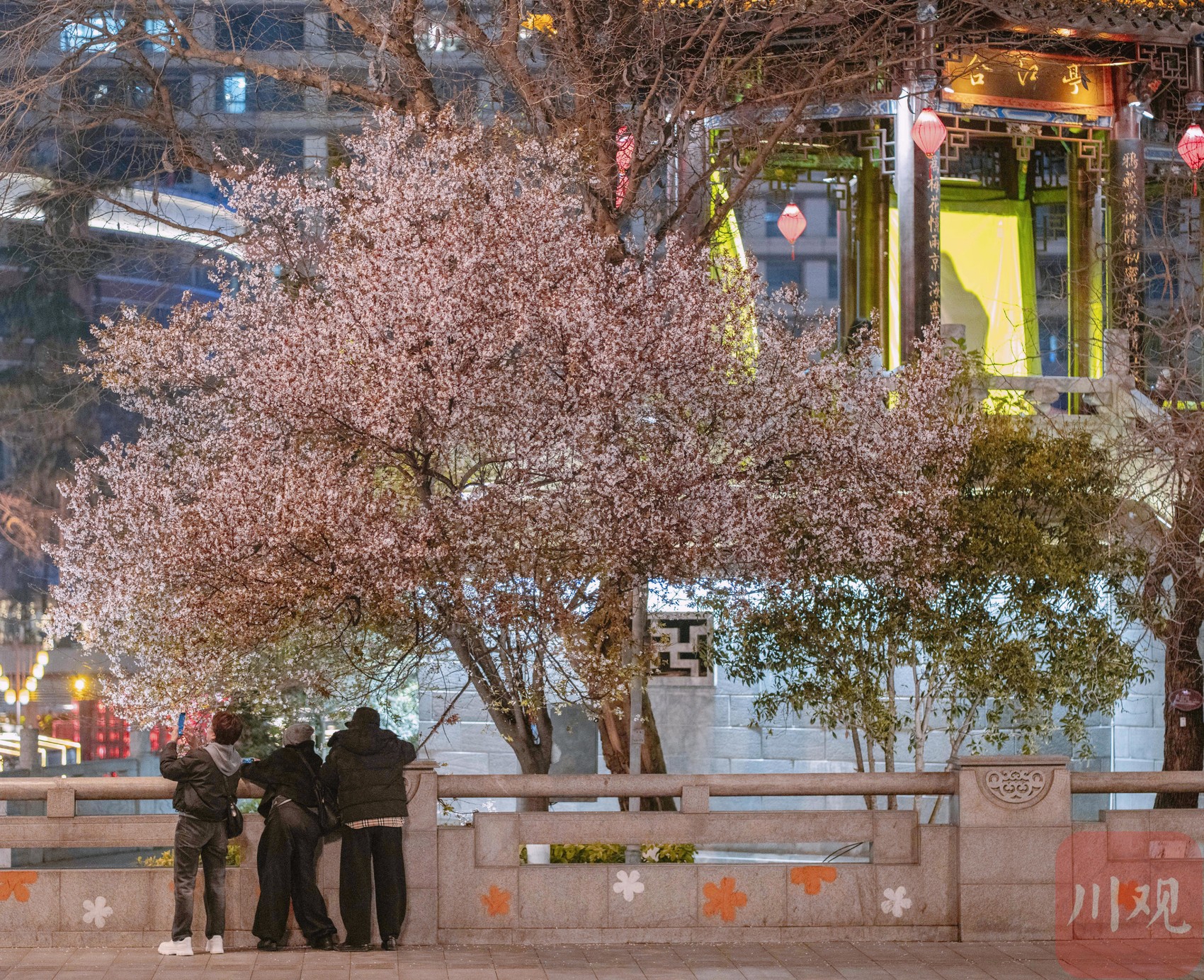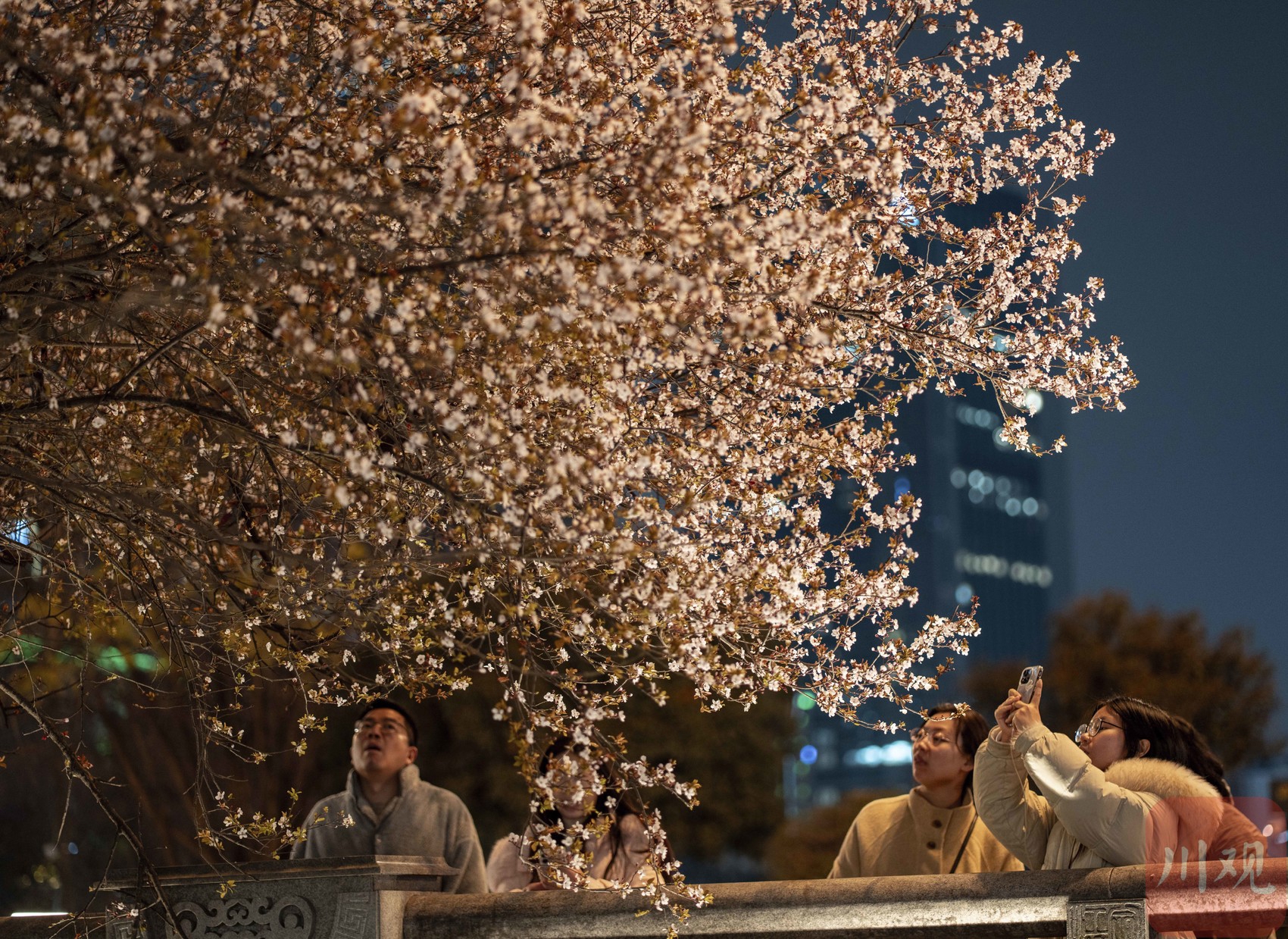 3月17日,夜幕降临,成都市锦江边的合江亭旁,一棵红叶李树在灯光的映衬下显得格外梦幻。粉白的花瓣在夜风中轻轻摇曳,与锦江两岸的璀璨灯火交相辉映,构成了一幅如诗如画的夜景,为成都的春夜增添了一抹浪漫色彩。