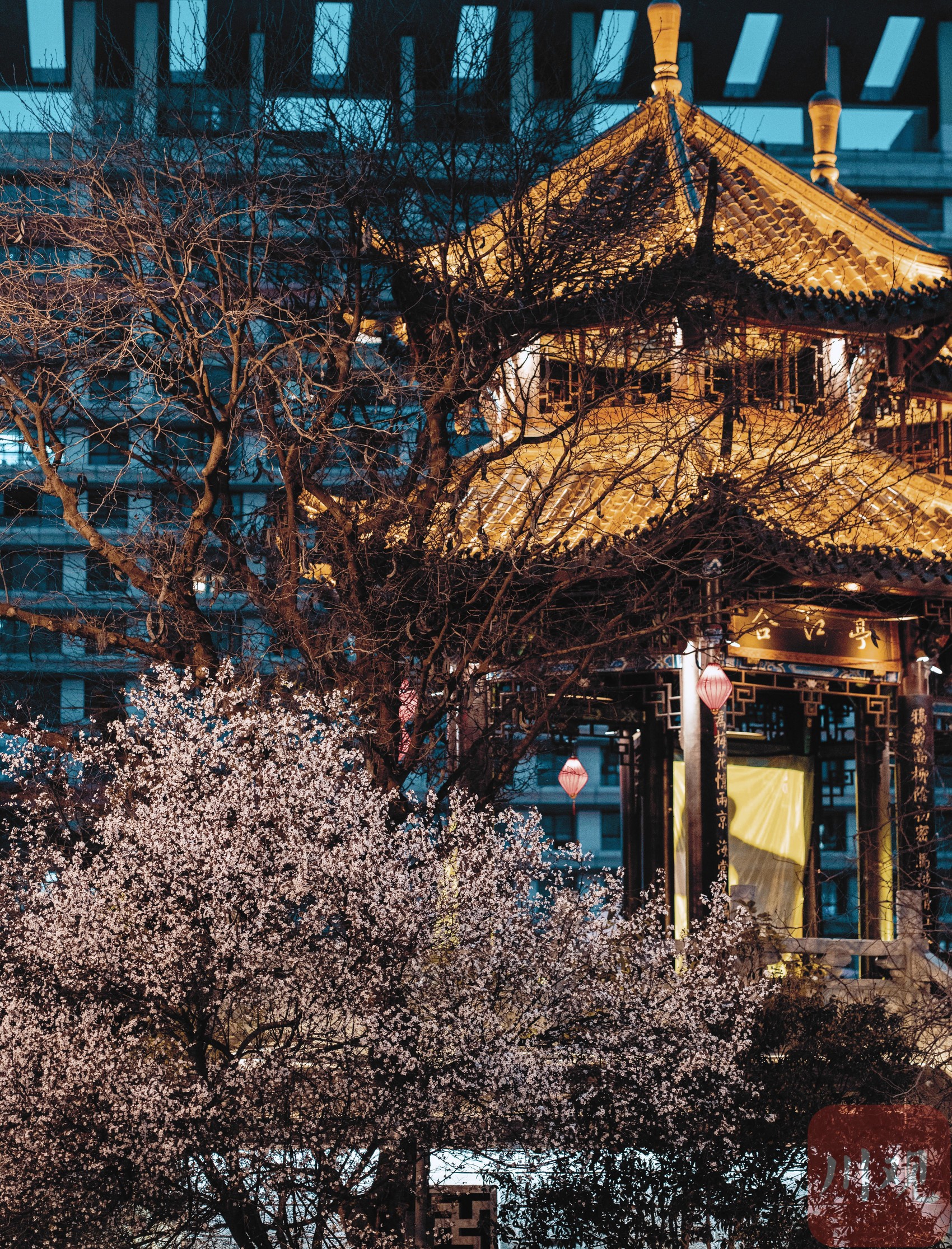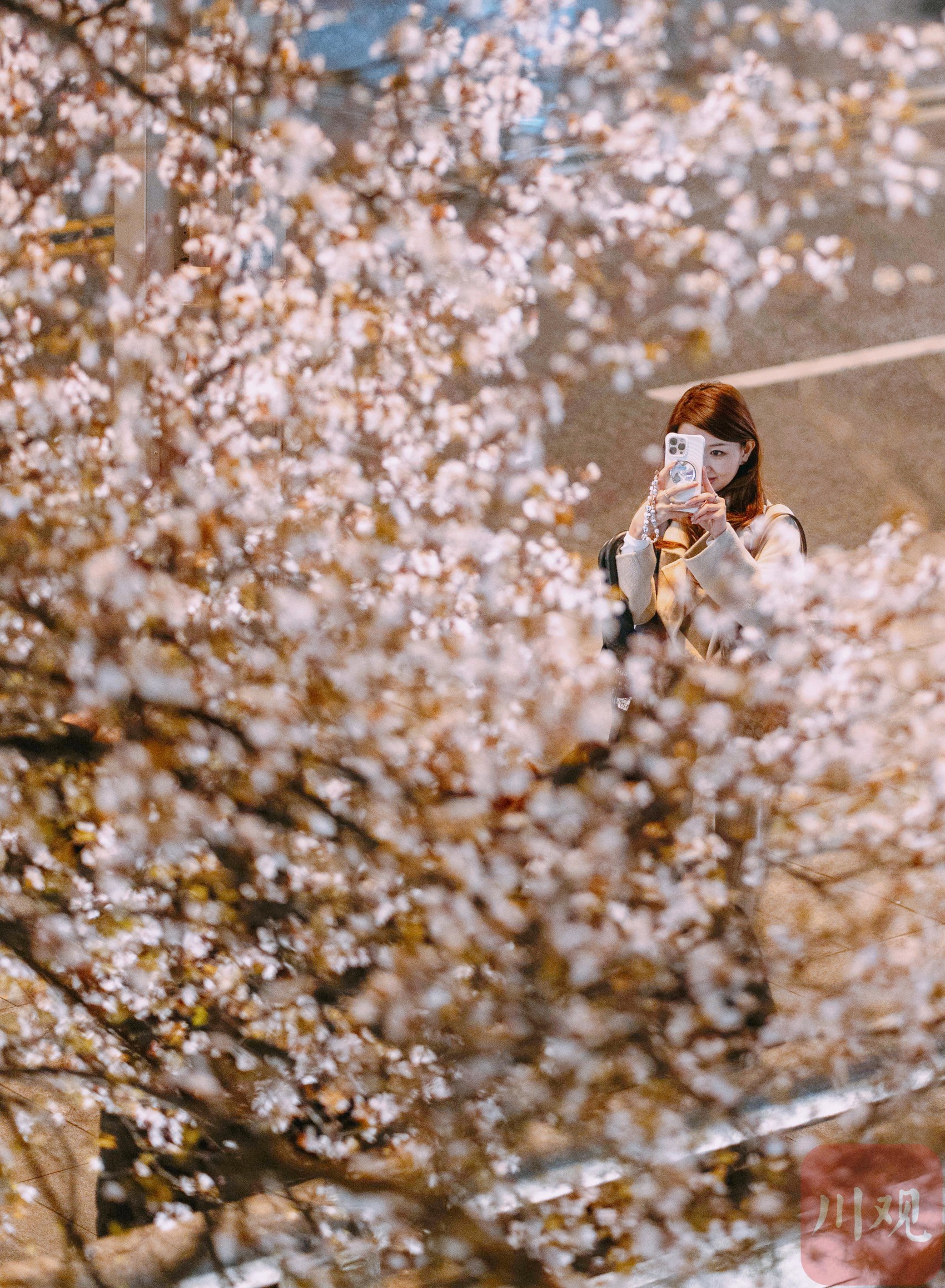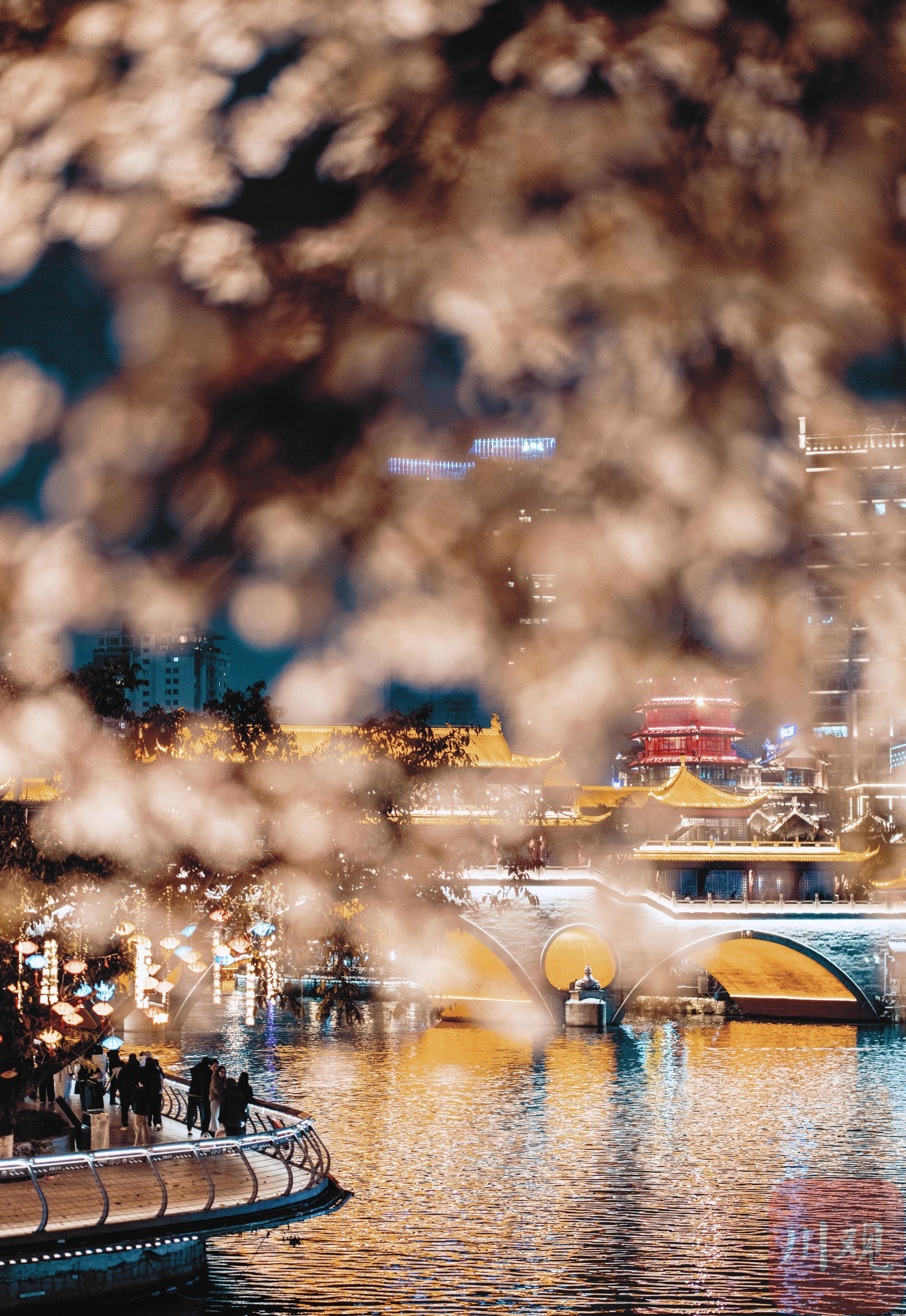 3月17日,夜幕降临,成都市锦江边的合江亭旁,一棵红叶李树在灯光的映衬下显得格外梦幻。粉白的花瓣在夜风中轻轻摇曳,与锦江两岸的璀璨灯火交相辉映,构成了一幅如诗如画的夜景,为成都的春夜增添了一抹浪漫色彩。
