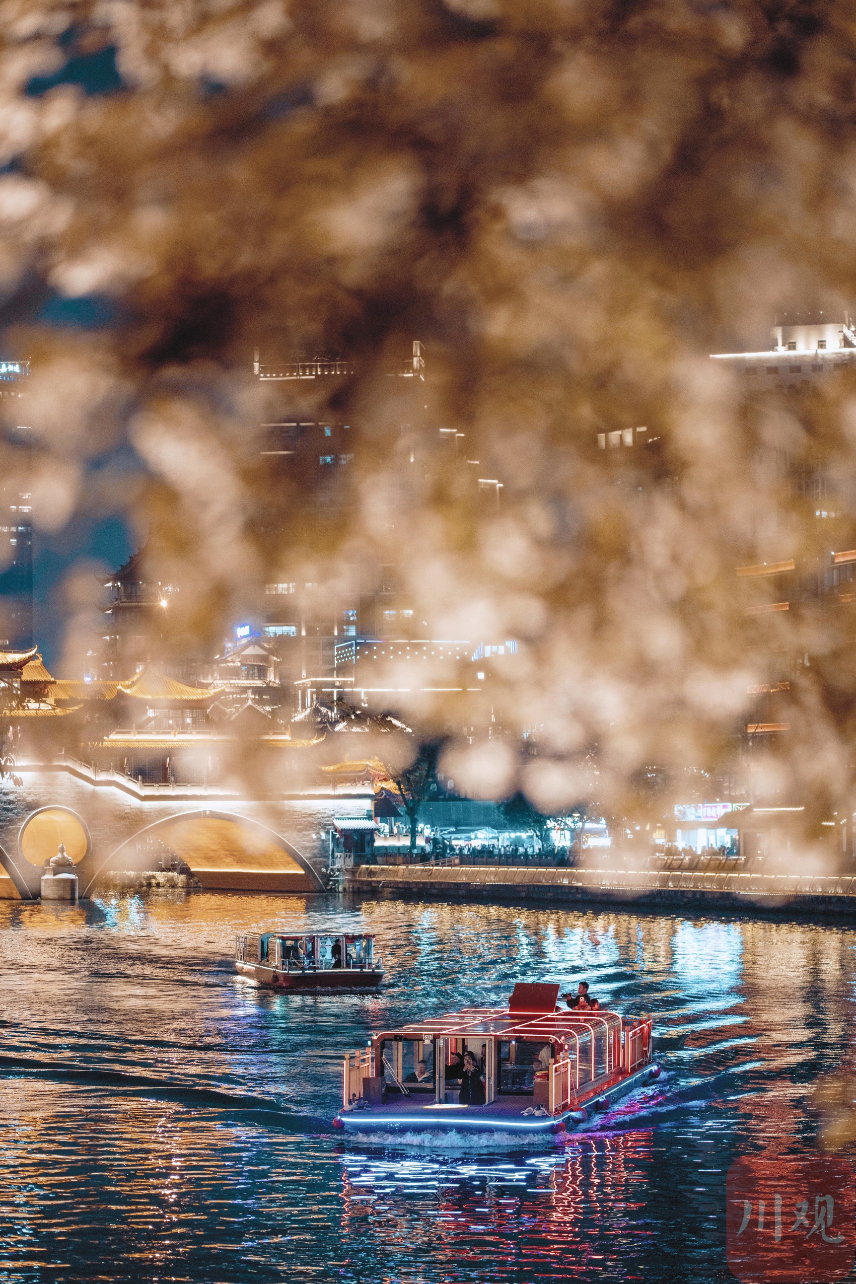 红叶李树下,锦江夜游项目的游船缓缓驶过,游客们纷纷举起手机,记录下这如梦似幻的瞬间。