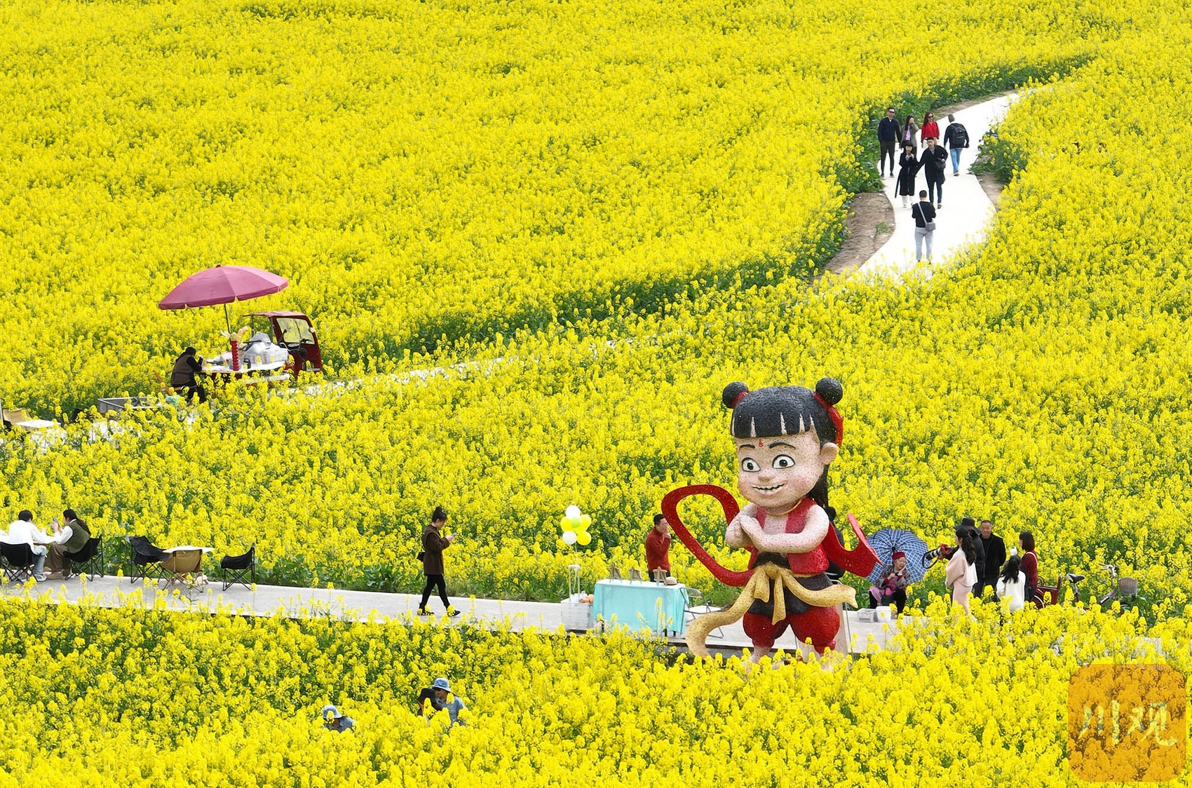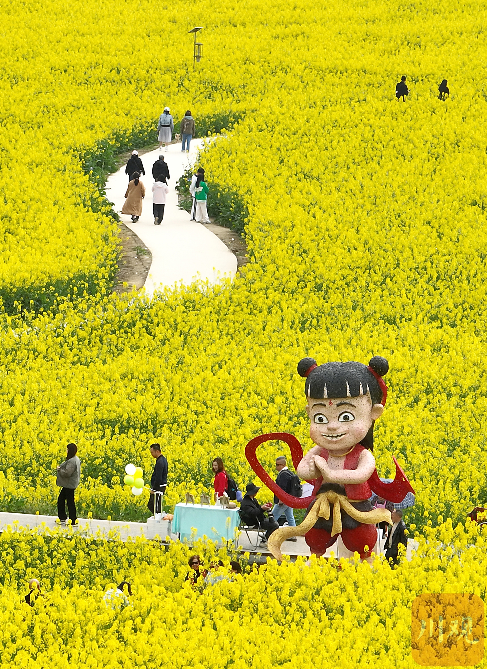 3月21日,在油菜花盛开的顺江村,村民牟兵告诉记者,他家养了30多个蜂箱,在油菜花盛开的春季能给他带来2000多元的收入。“来尝一下,我家菜花蜜很纯正。”牟兵在油菜花田旁支起的小桌边,不一会儿就围满了游客。在不远处以竹文化闻名的道明镇,油菜花田里竖起的4米高“哪吒”格外醒目,这一用传统竹编工艺制作的动画“哪吒”形象,俏皮又灵动,在这个春天吸引了众多游客前来观赏、拍照打卡。道明竹编非遗代表性传承人杨隆梅告诉记者,“哪吒”形象从设计到完工,78个竹编艺人用时12天。