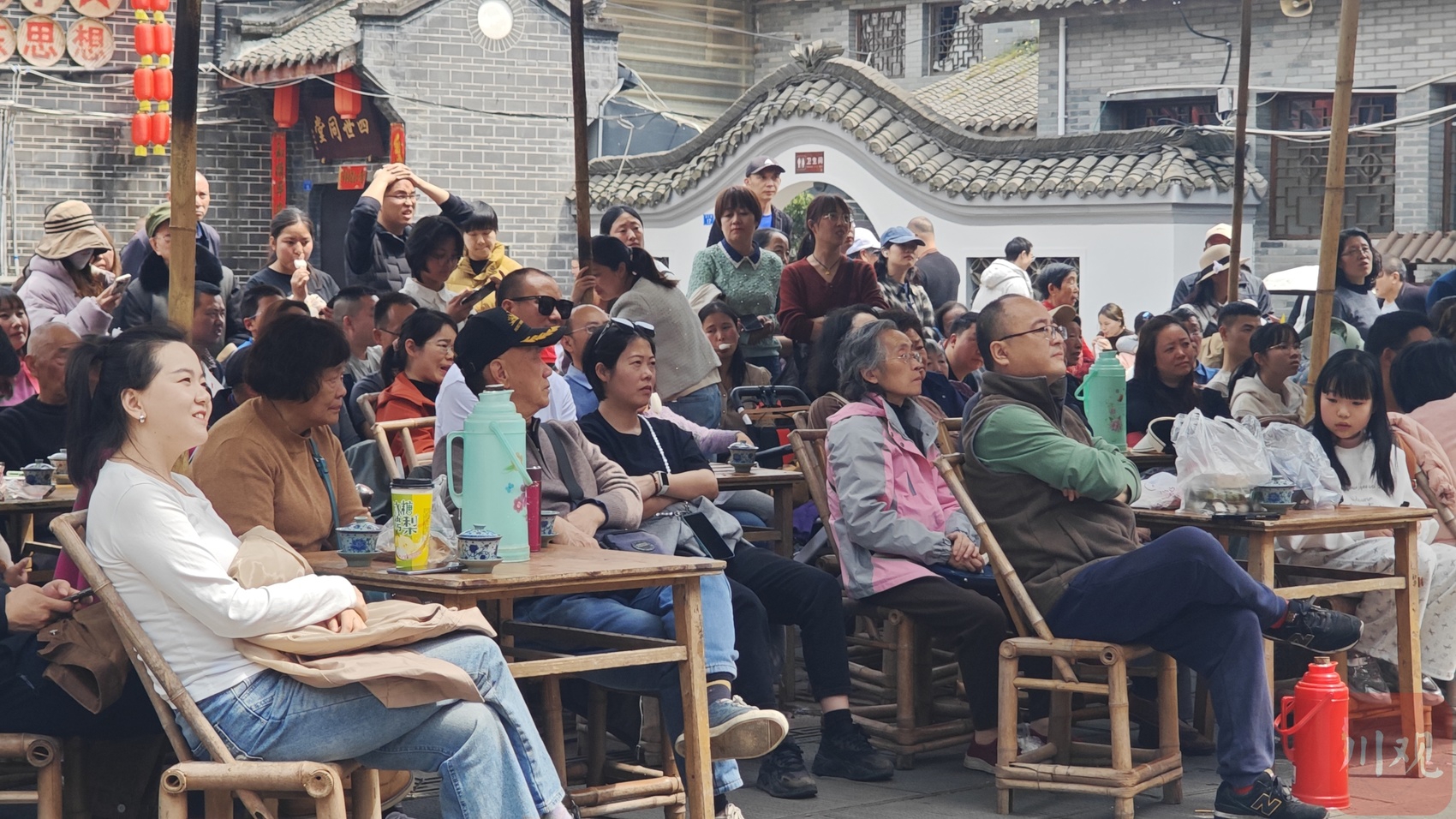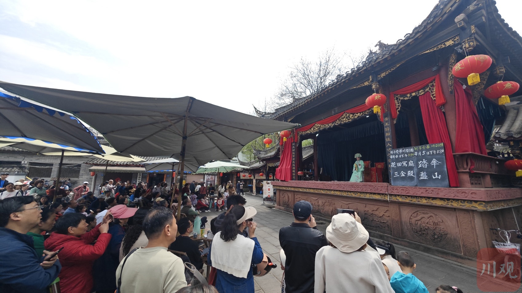 4月4日,清明小长假首日,崇州街子古镇迎来众多游客。当天下午,古镇中心古戏台上,川剧演出一场接一场,引得游客纷纷驻足围观,不少人还坐下来,点上一杯茶,悠然看戏。