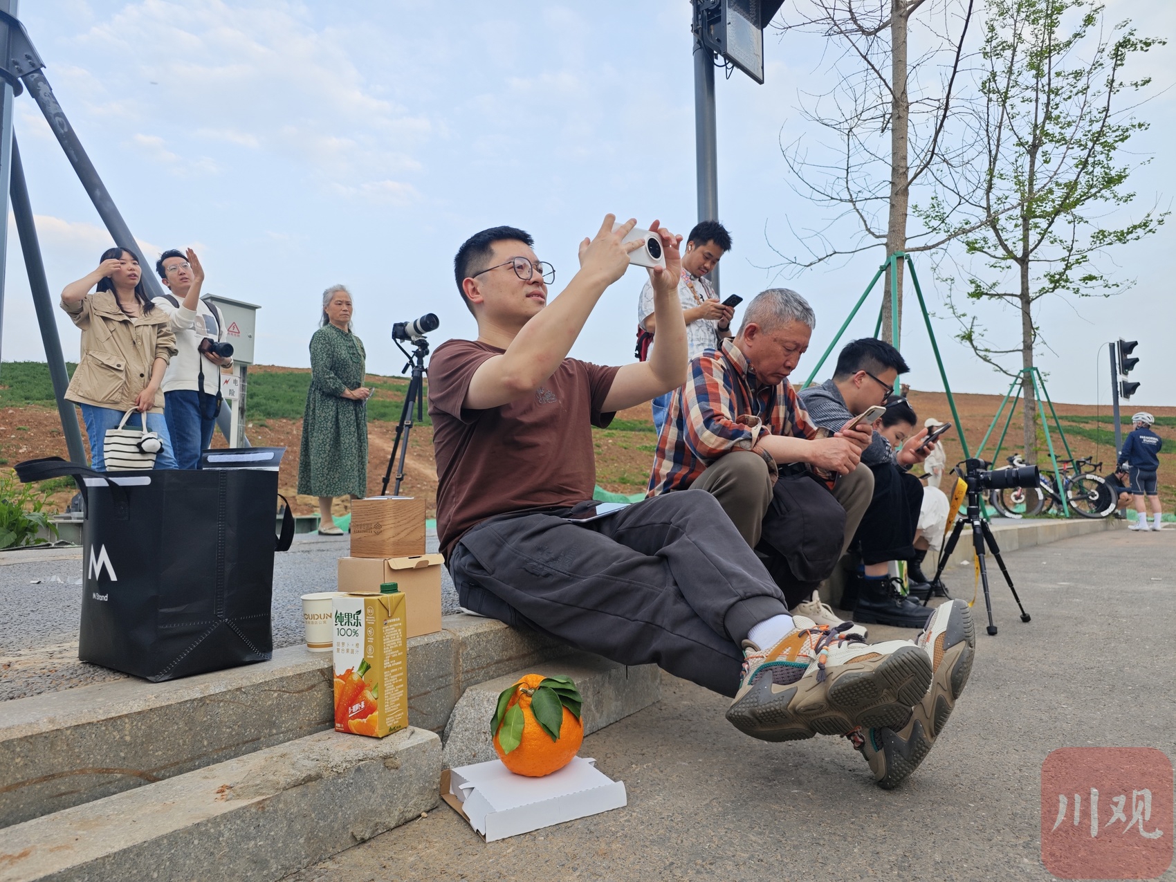 7日傍晚,天气多云,夕阳未能穿透云层,“悬日”景观未能出现,但现场仍有许多人支起脚架、端起相机驻守。其中,来蓉旅游的曾先生还自带了音箱、果汁和耙耙柑,坐在路边用手机拍日落,松弛感满满。