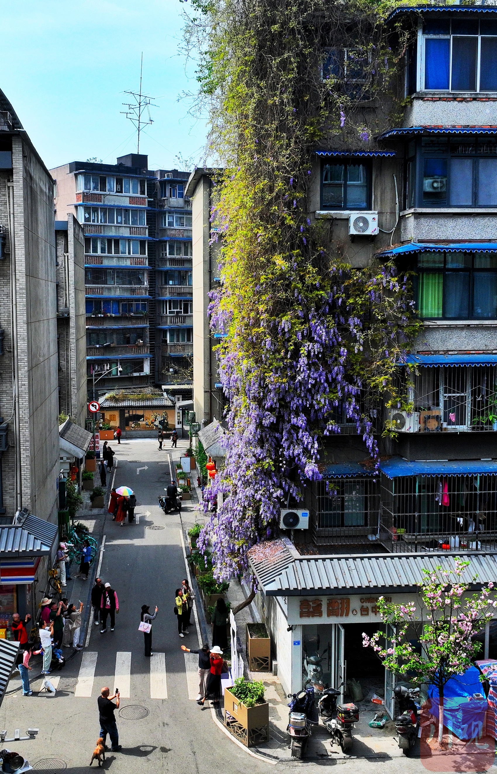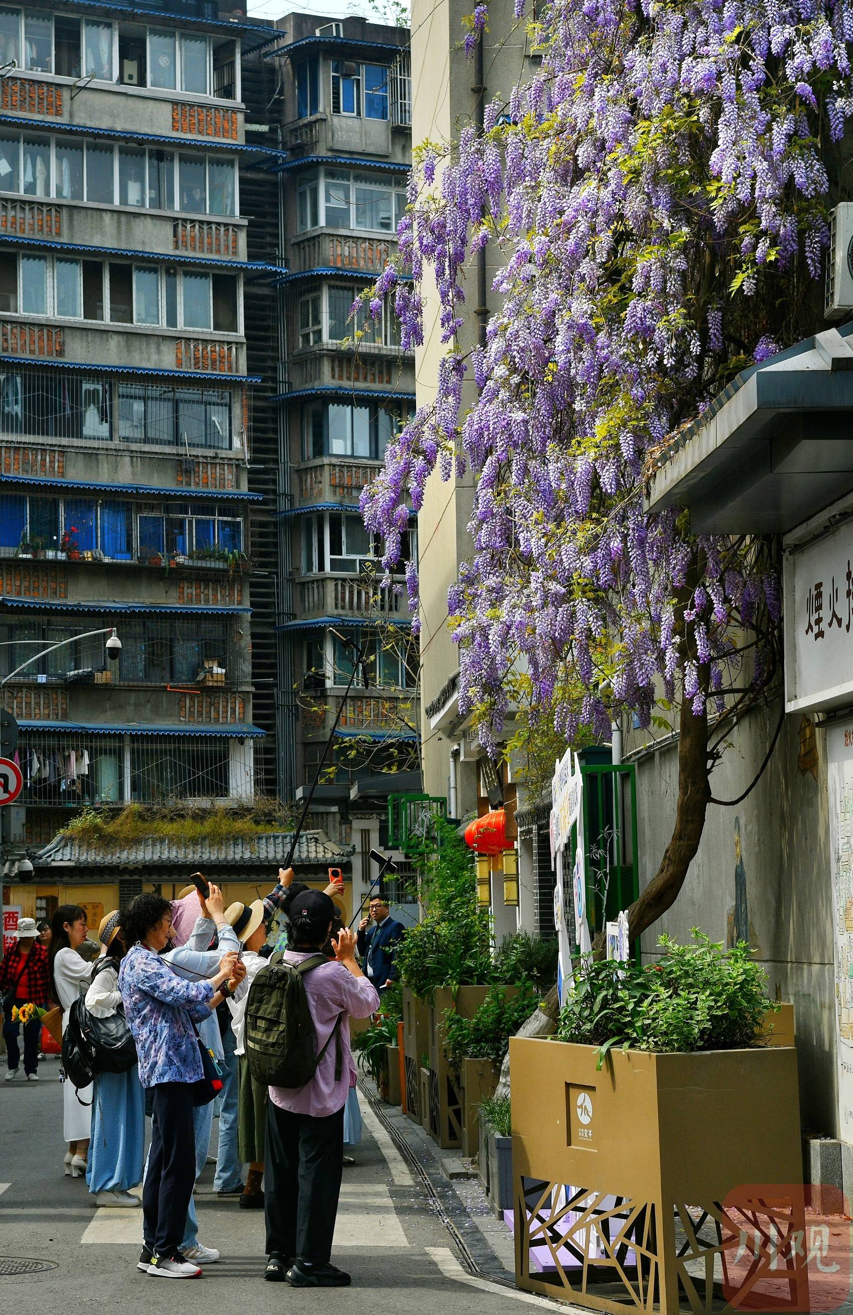 据老居民回忆,紫藤最初只是街边茶铺老板随手栽下的一株小苗,常年被爬山虎掩盖,甚至几近枯萎。几年前的社区更新改造,清除了缠绕藤蔓的杂物,紫藤终于挣脱束缚,如今已覆盖六层楼。高达17米的墙面,成为“城市更新”的鲜活见证。居民们纷纷感叹,这株紫藤花不仅美化了环境,更提升了整个小区的生活品质。姚阿姨笑着说:“过去连坐门口都嫌脏,现在却成了拍照胜地,每天都有很多人围着这株紫藤花流连忘返。”
