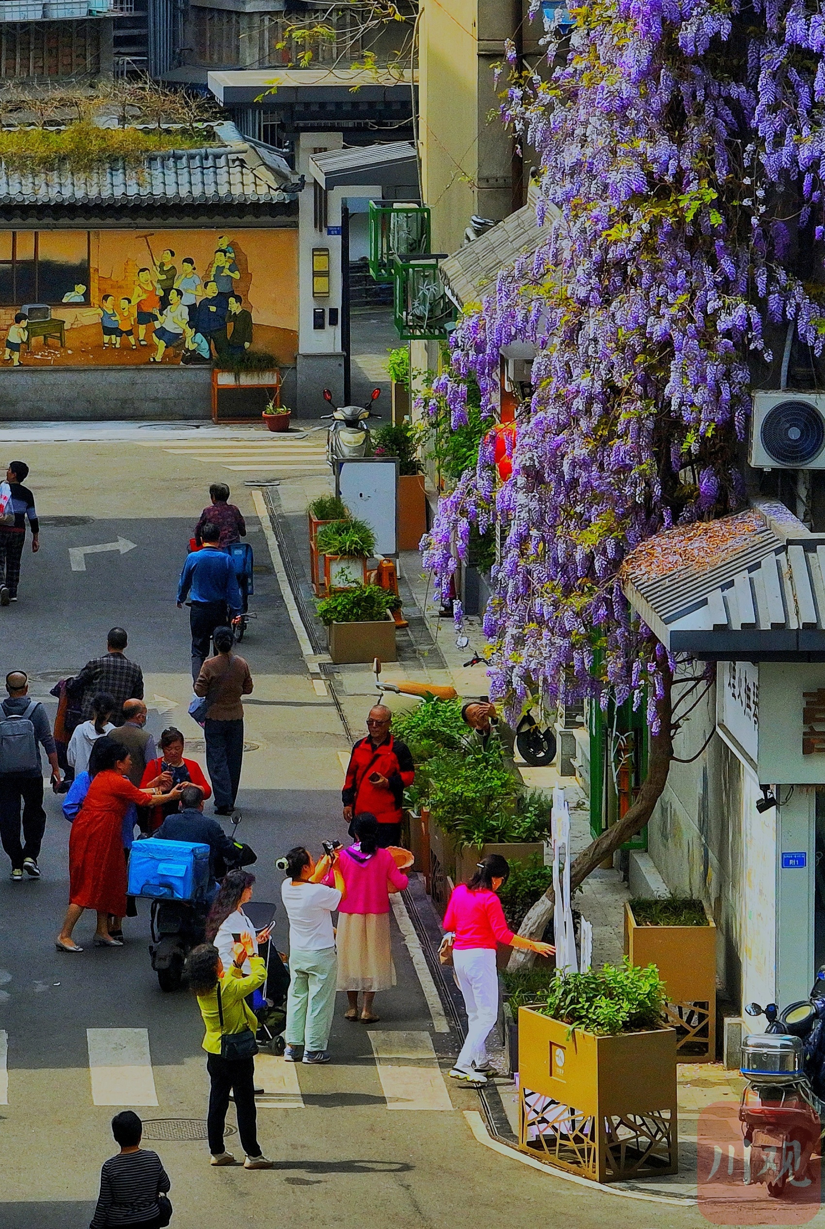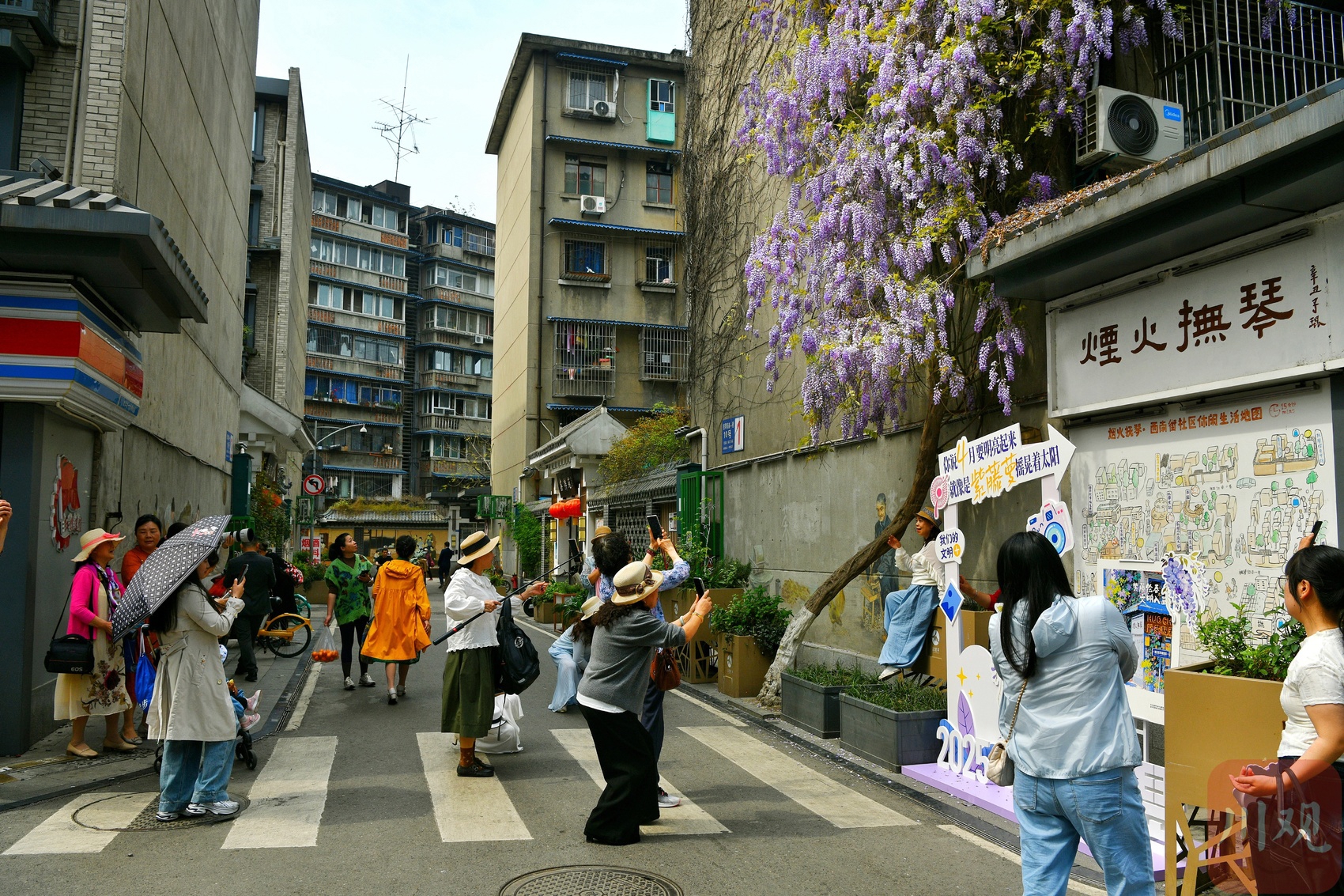 四月芬芳,万木逢春。在成都金牛区抚琴街南一巷,一株“高龄”紫藤在春日暖阳下已悄然苏醒。4月9日上午,记者走出地铁5号线就看到扑面而来的鲜艳紫色,瀑布般的紫藤从一栋6层老居民楼上倾泻而下。这里不仅是本地人感知春意的“晴雨表”,更成为外地游客前往打卡的“网红地标”。