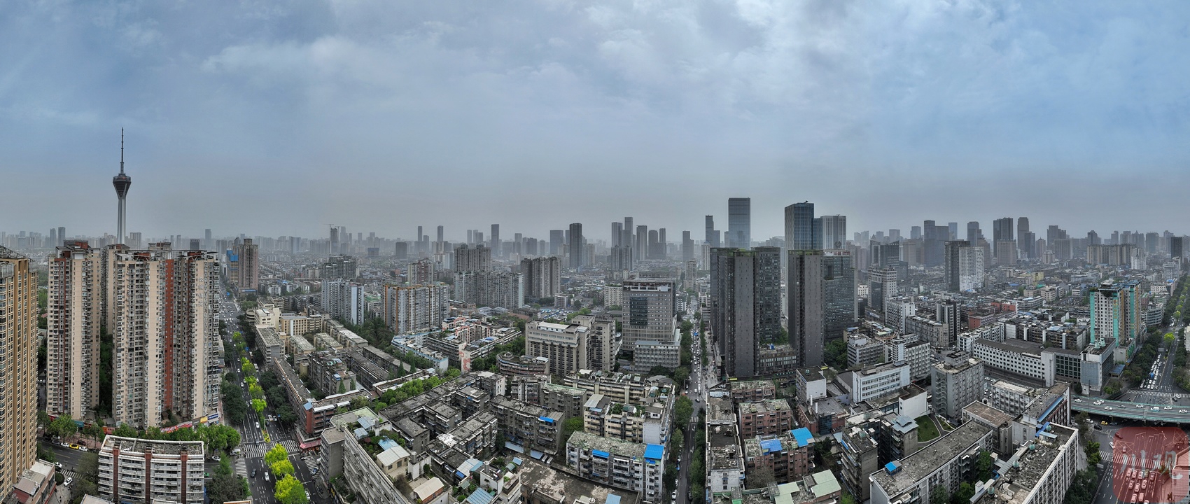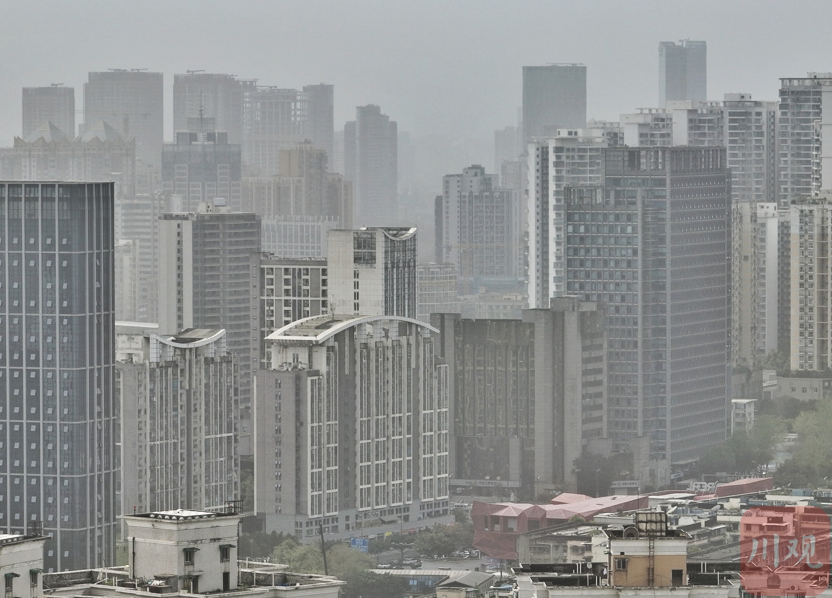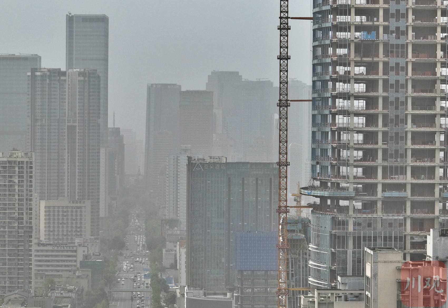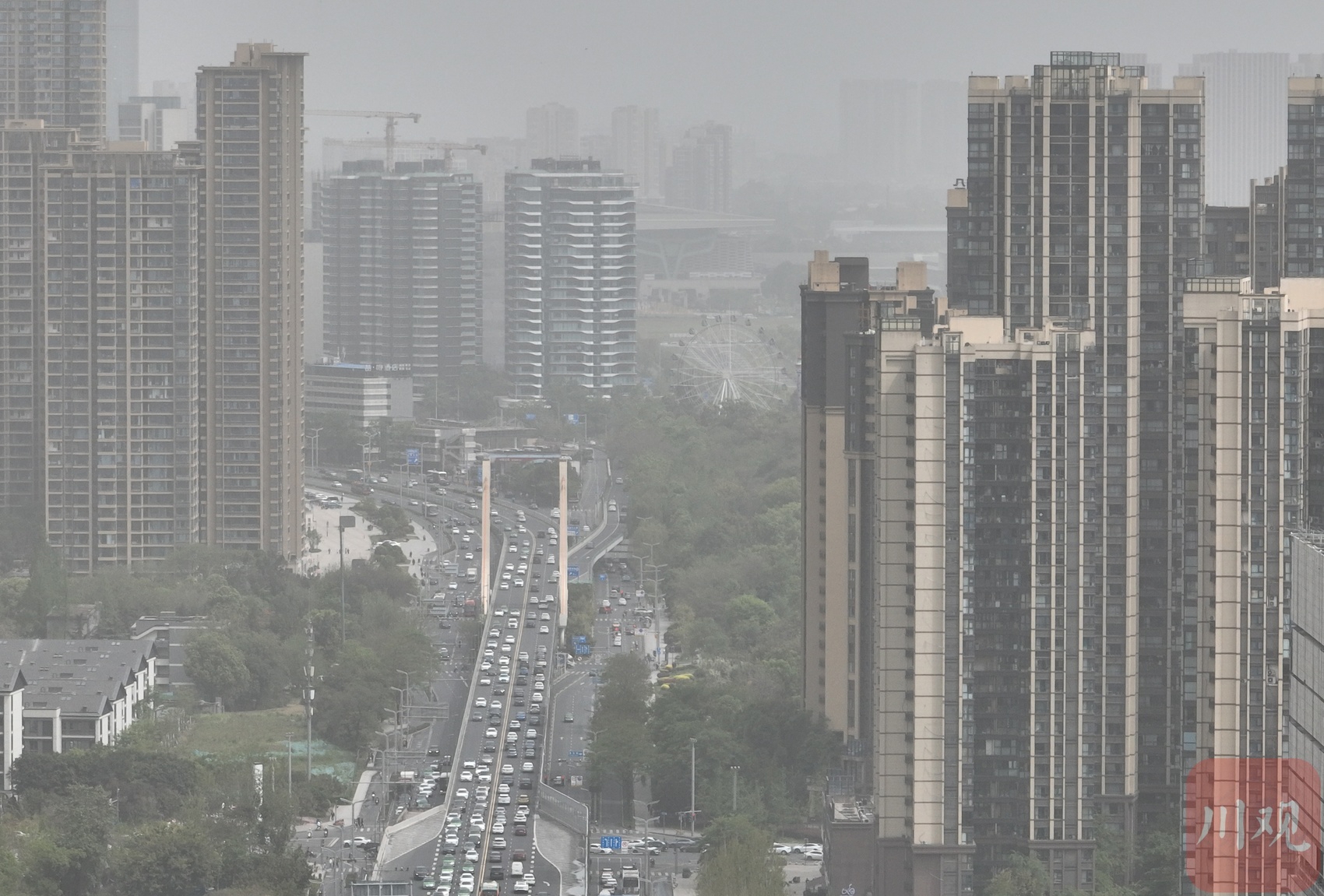 午间,无人机航拍肉眼可见成都南边一道灰黄色尘埃向市区袭来。