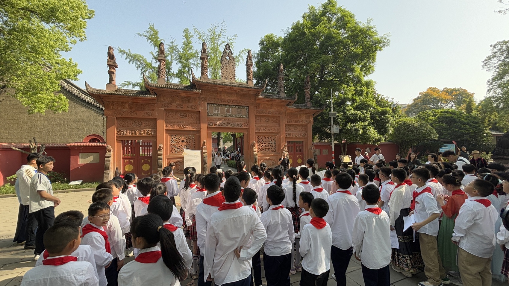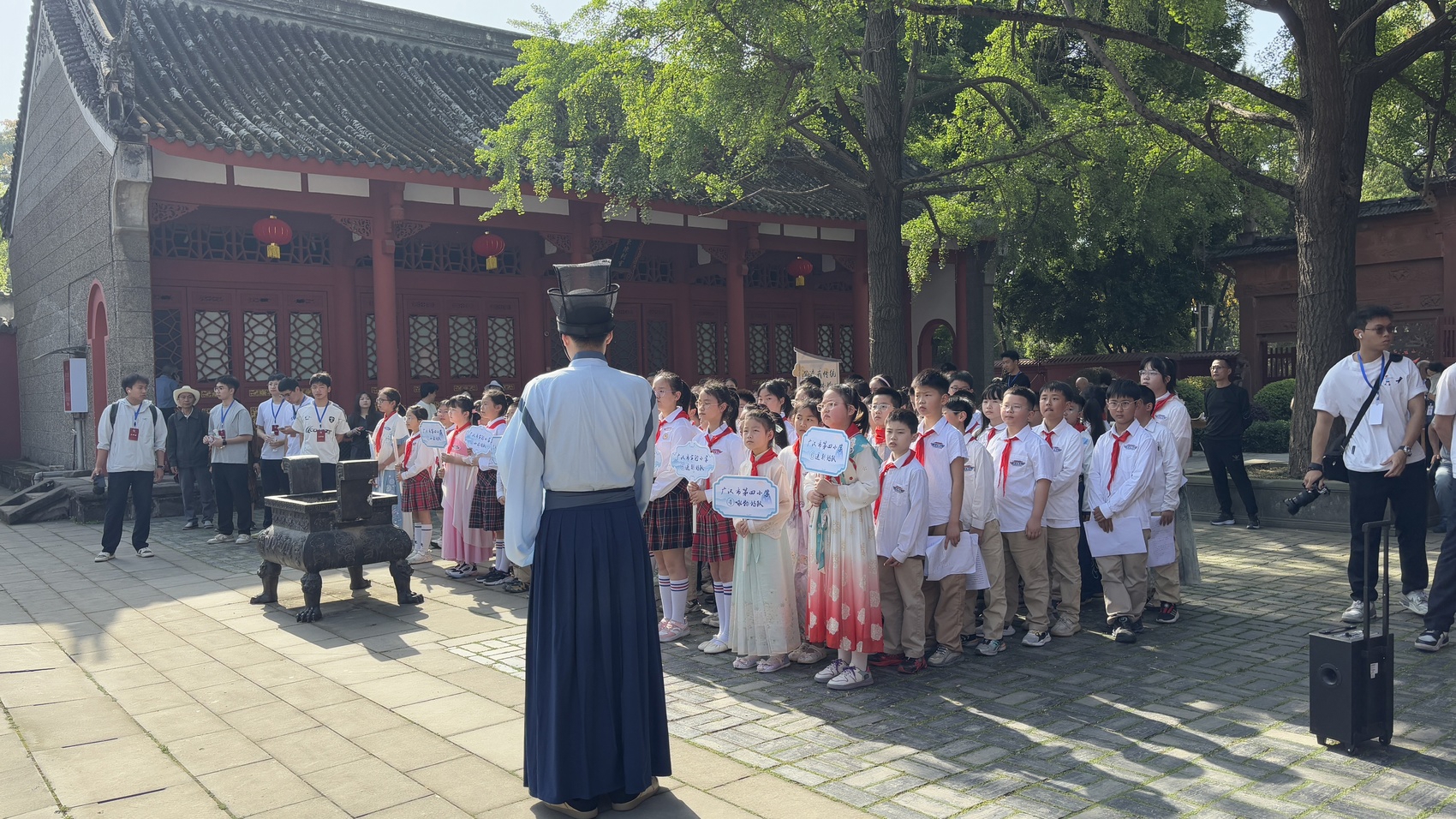 上午9时,棂星门外人头攒动,学生们在“颜回”的带领下,依次游览文庙的棂星门、泮池、名宦祠、戟门、大成殿等景点,聆听讲解员生动讲述文庙的历史与文化内涵;6位分别扮演李白、杜甫、房馆、陆游、刘禹锡、司马光的演员通过情景演绎,还原这些历史名人与广汉的渊源:李白曾游历汉州留下诗篇,杜甫与房琯的深厚友谊,陆游笔下对广汉风物的记载……每位“诗人”还担任六艺PK的主考官,带领学生开启文化闯关之旅。