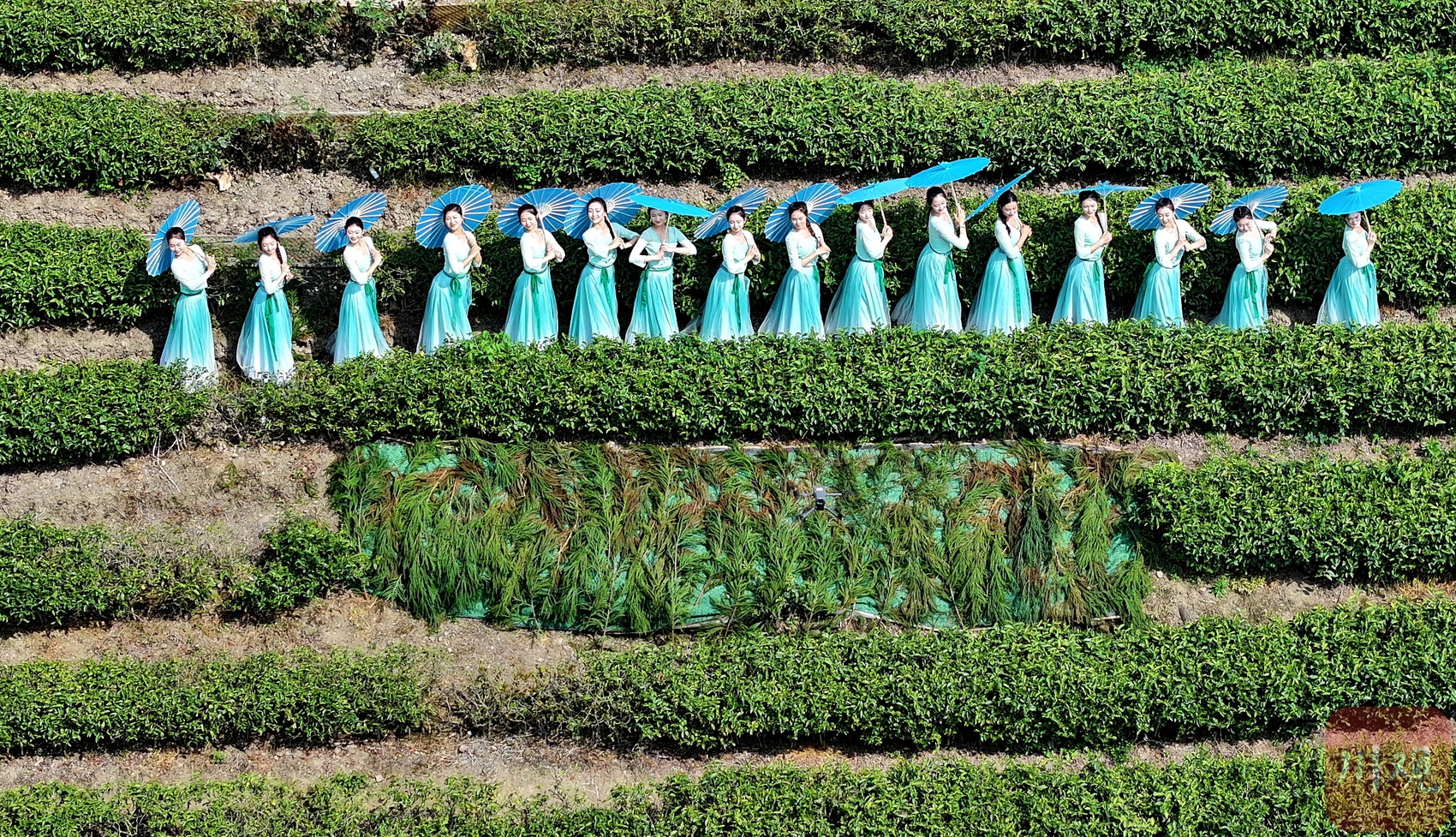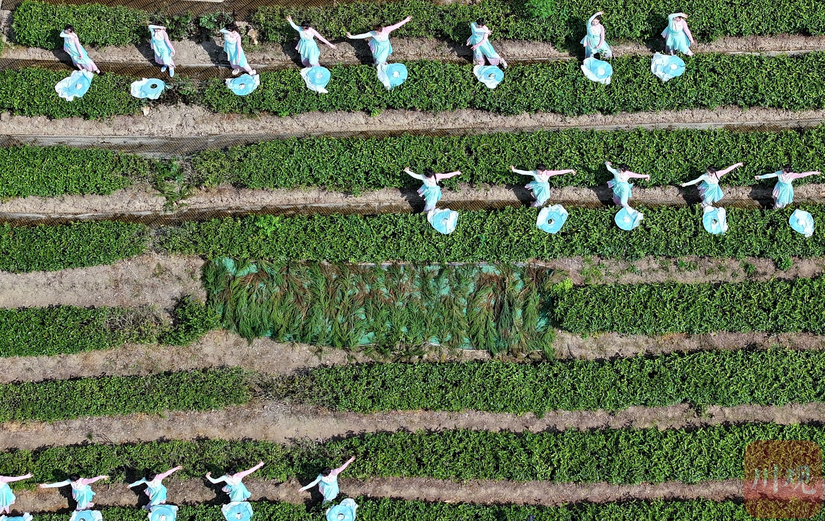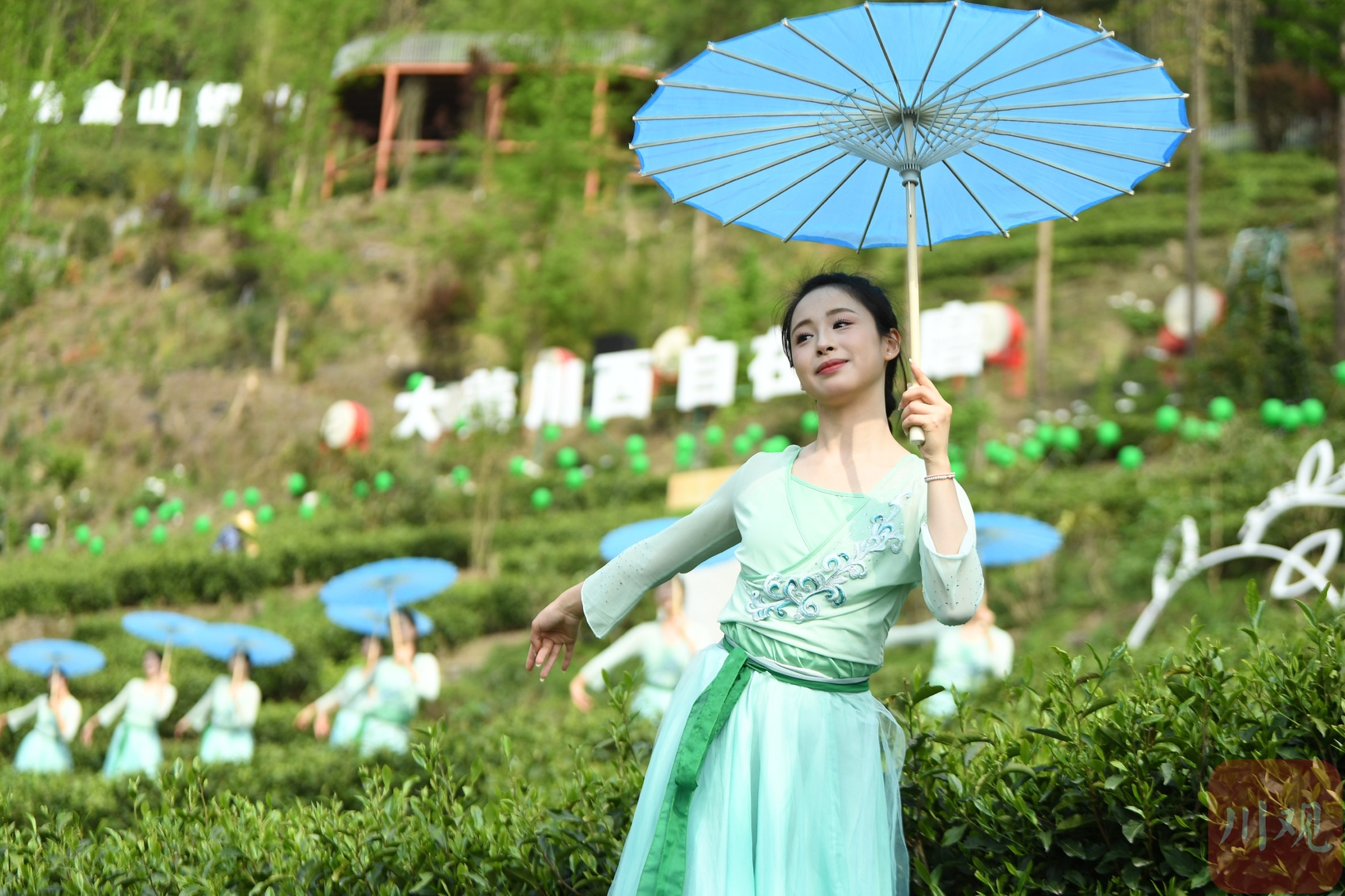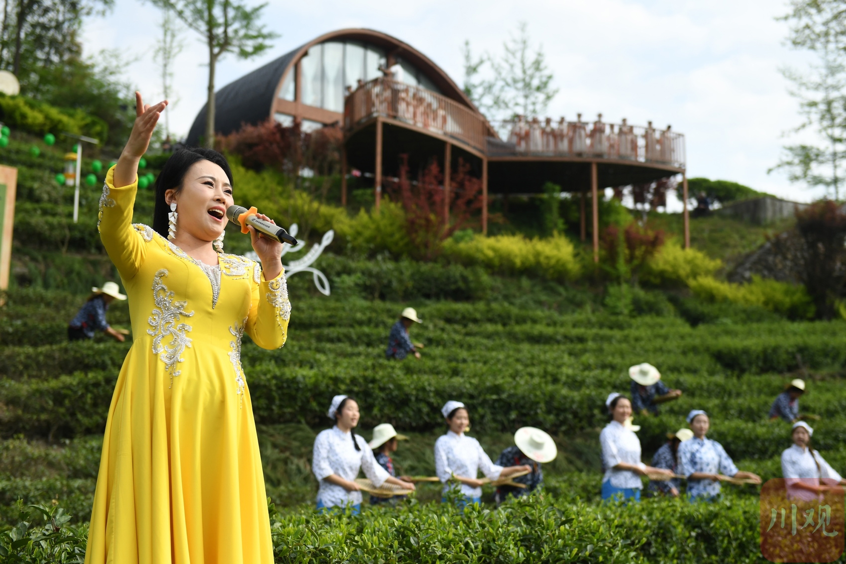 在四川省阿坝州汶川县水磨镇“等风来”茶园,演员正表演节目,茶园变成了“舞台”。